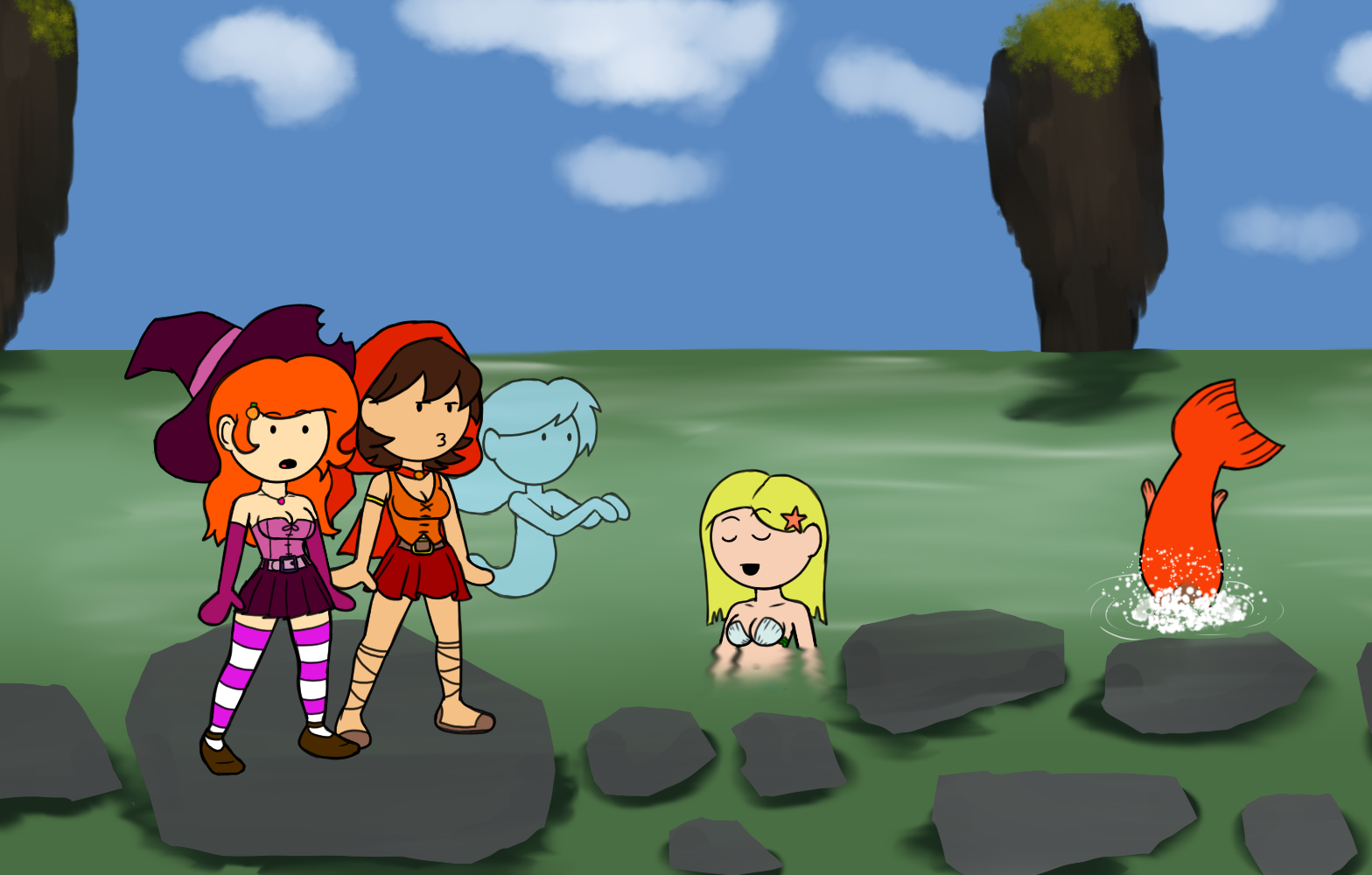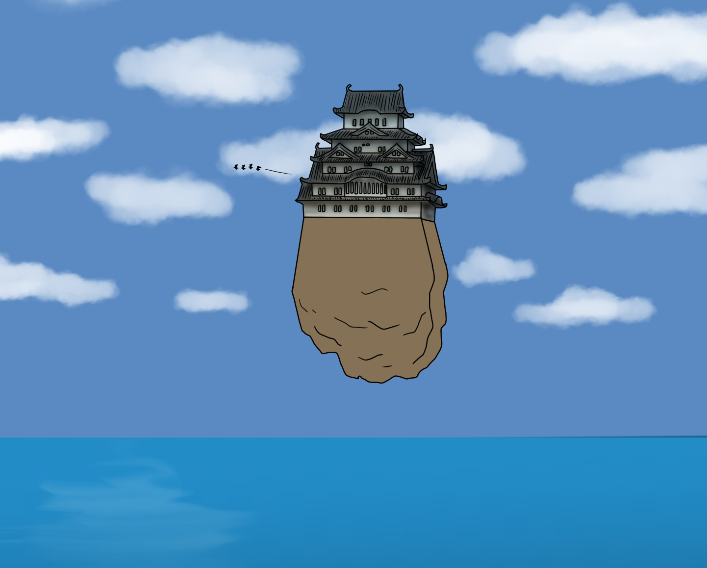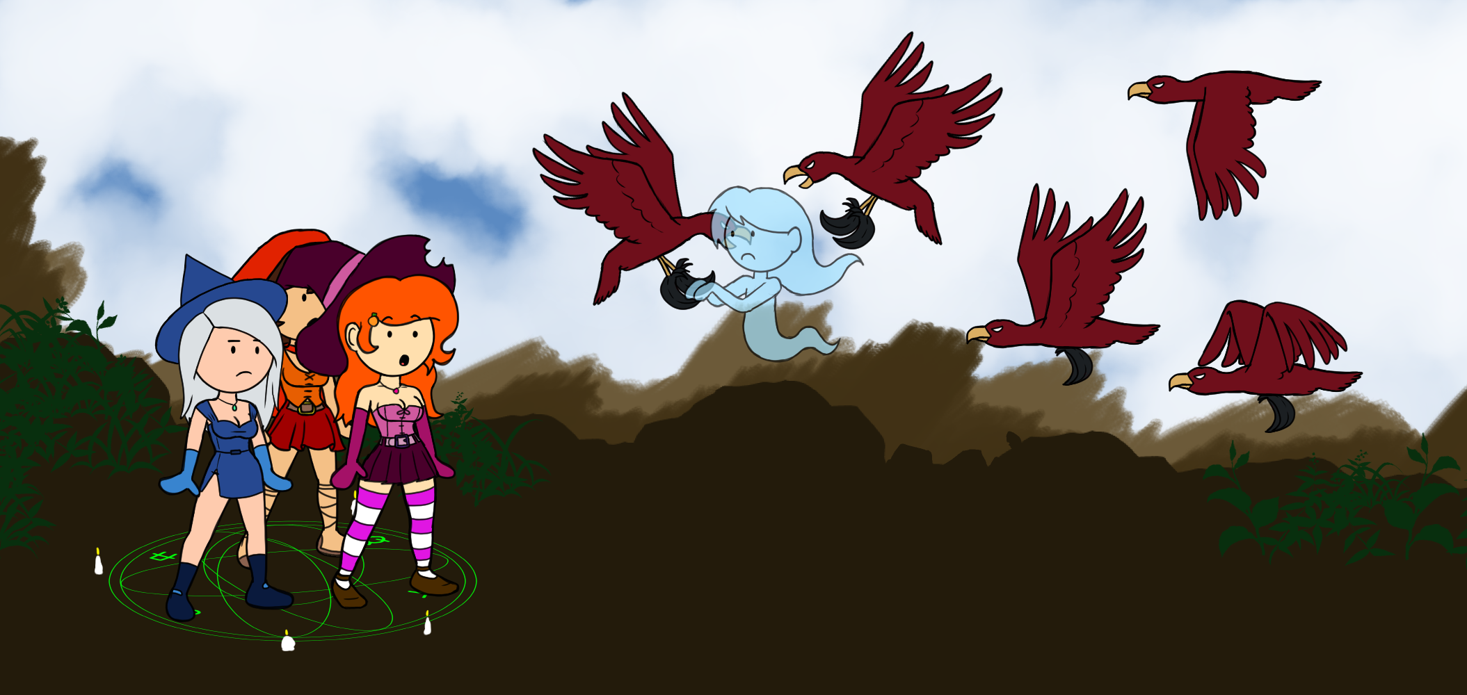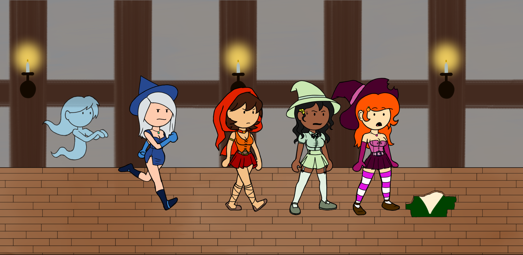 The witch quartet race out of the castle, which turns out to be a floating castle over an ocean.