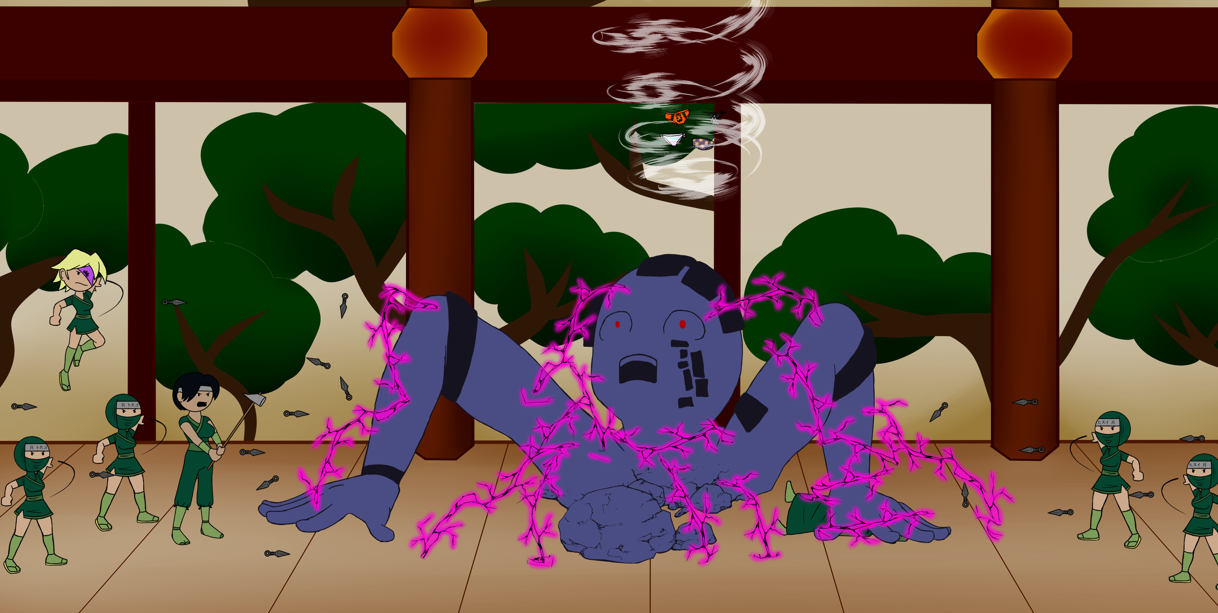The remaining ninja start flinging shuriken, which bounce off the golem's hard clay flesh. The Master starts whacking the fingers of the golem with her hammerai hammer.