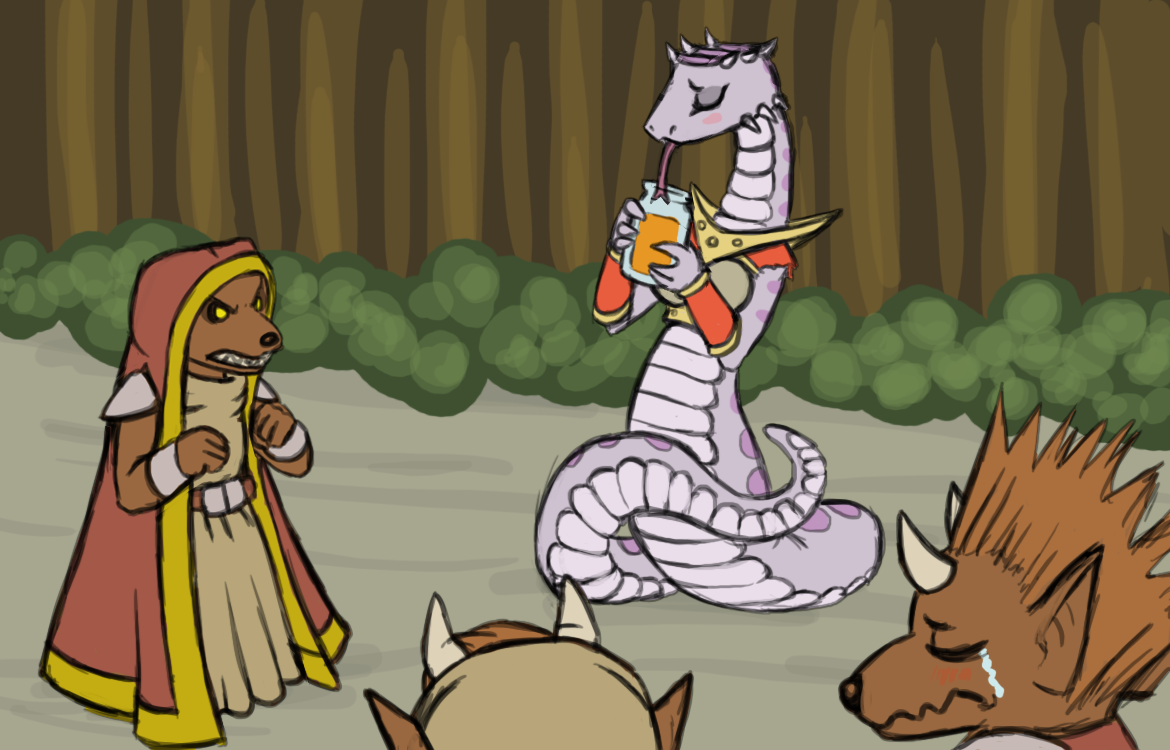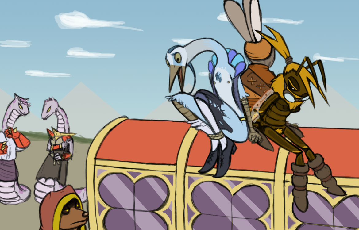 Park the carriage by the roadside and prepare to camp out for the night. Right now we've got Bowin, Eeyfel, and Azzeki still functioning. They can take turns on watch until the morning when we get Yappa back on her feet.