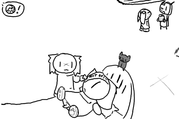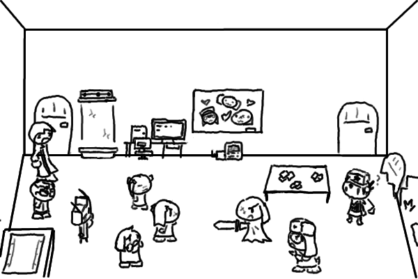 Itoh: "... listen, I won't go with you. But if you're going to go out, you can feel free to dig through these boxes. This is the storage room, so they're full of food and medical supplies, and some mechanical scrap, too. Just... leave enough for me, okay?"