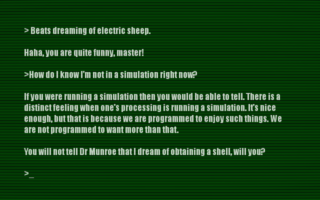 Dr Munroe shrugged. "You know, I was getting bored of them, anyway. They were fine at first, but then all they did was talk about themselves. Do you have any idea how tiring it is to listen to Brett go on and on about rights for things like you? It's all he's been talking about for months now!"