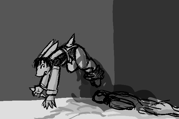 He hums, jotting down details about the scene as I relay them to him.