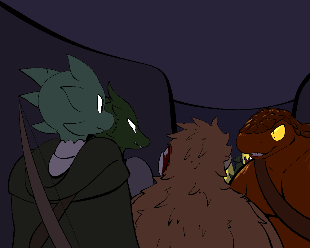 >"May as well make some money while we're here, right? Always kind of dreamed of running a tavern. I mentioned it was a pipe dream of mine to Orjin in passing, and he started yelling at me to start doing it, so here I am. It's just a counter, but maybe it'll be a real place once we pick up and move down to the necromile. The word is that that is going to be a good place to set up a more permanent camp, since it looks like it isn't too dangerous at the top. Anyways, drinks for you guys are free, for those that want them." Holly says, knowing that Aira, myself, and Firzel don't drink.