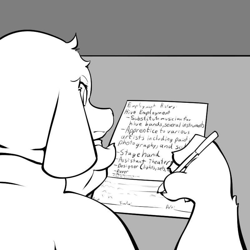 Don't leave your hive space blank, just write the name of your hive and write "(former)" next to it, probably looks better. A small art shop probably isn't going to really call up your references, so just put your Queen's name and number for one, another high-ranking former hivemate and theirs for another, and... let's say, Luvi's name and number. For education, say that after school you went into apprenticeship with [older hive member that you learned things from], and for your employment list projects and productions you were part of with a title for your work with that. "Production assistant" or "lighting technician" or "makeup artist" or "supply manager's assistant" or things like that, with a brief description of what that means in terms of skills you had to have and duties you had to perform. Emphasize things applicable to this job, like managing inventory, selling tickets, et cetera.