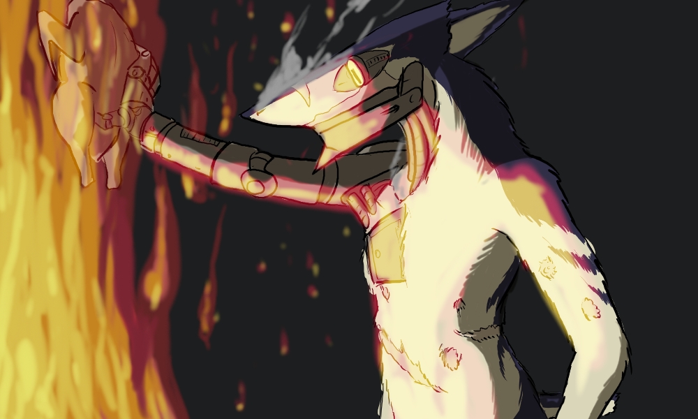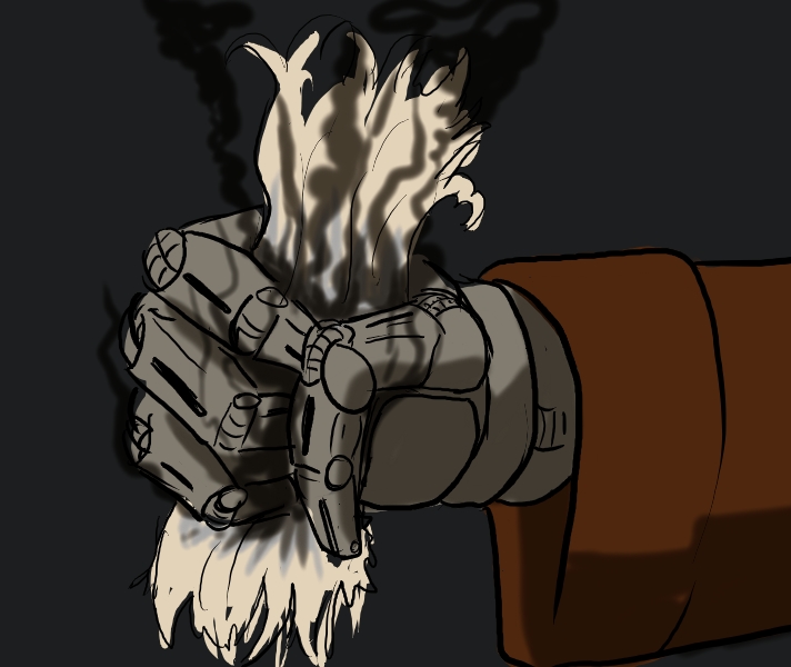 His nose isn't burnt, but the hair is singed. His titanium arm will need to get far hotter than that to catch fire.