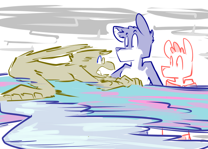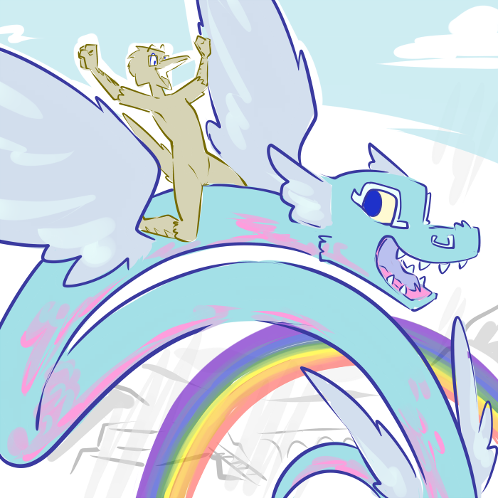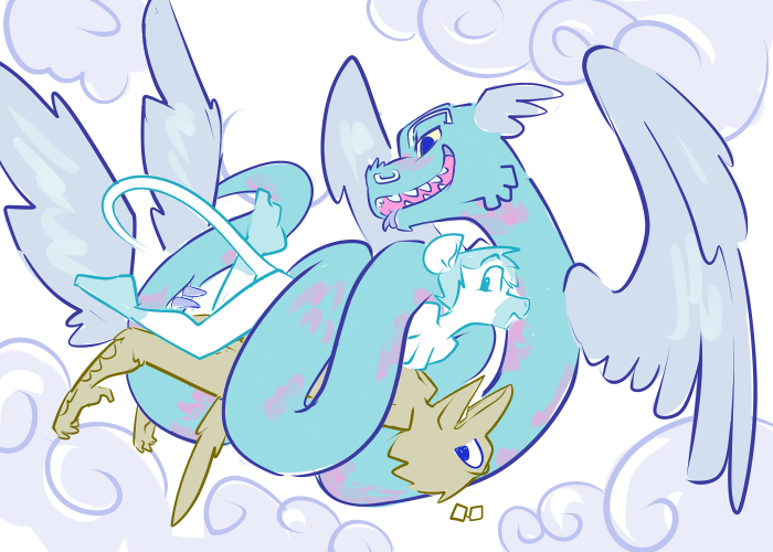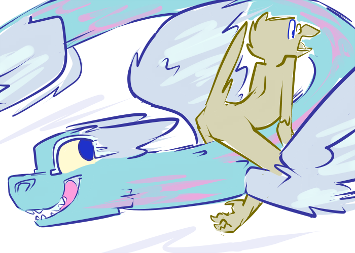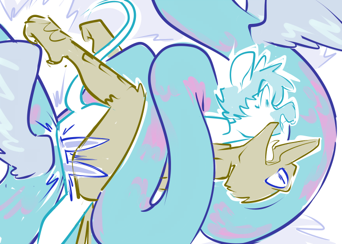 The two mortals raise their voices in a wordless cry of pleasure as the coatl’s sapphire shafts paint their bodies a pearlescent white inside and out. Bound together, they can do little else but cling to one another as Flashing feathers, Joyous blue of the perfect sky, fills them with the gift of his mana. The snake god at last buries himself within them as the final jets of bliss exit his body; holding them tight as aftershocks shiver through his muscles.