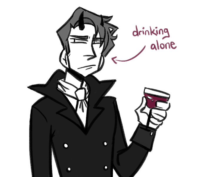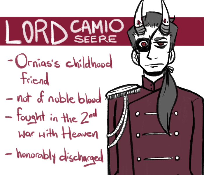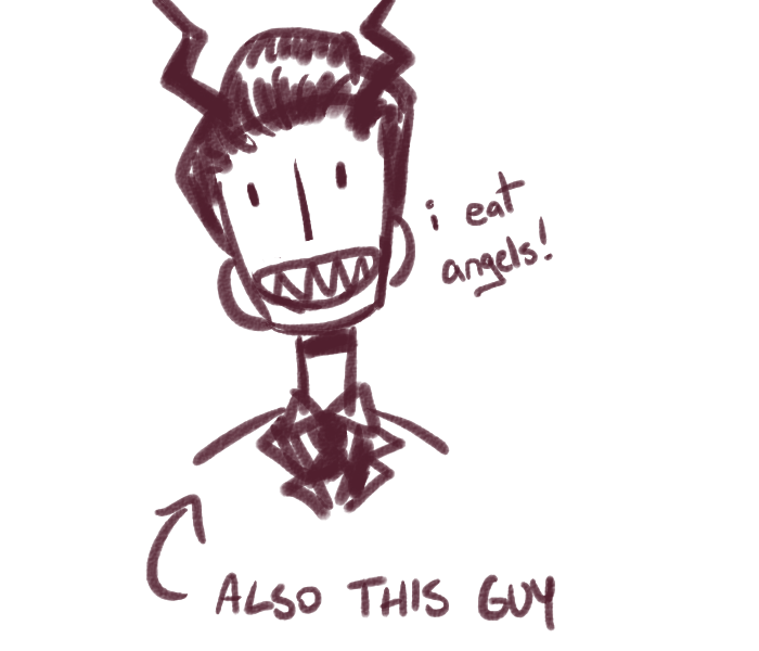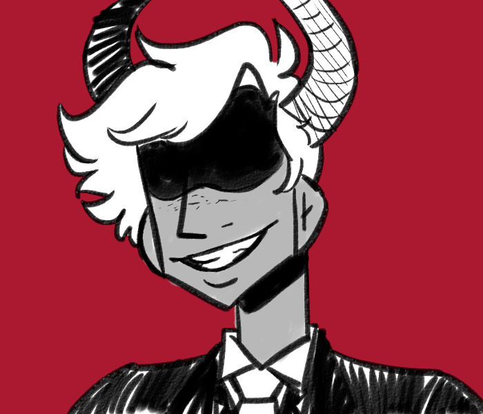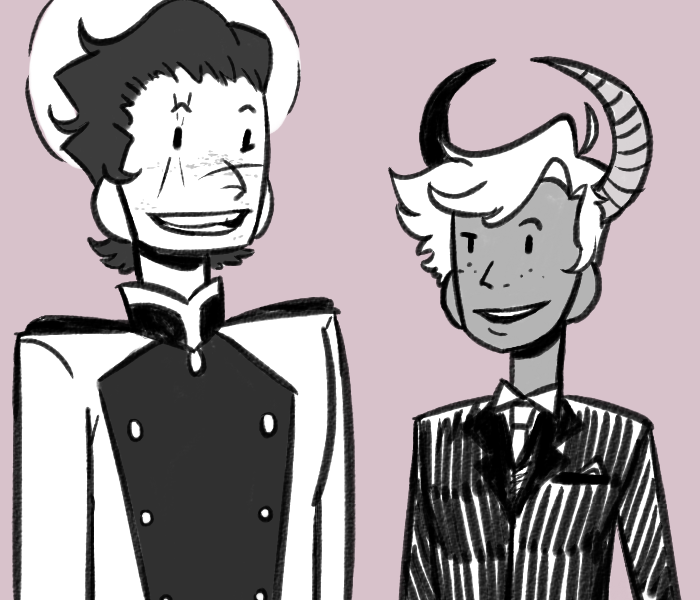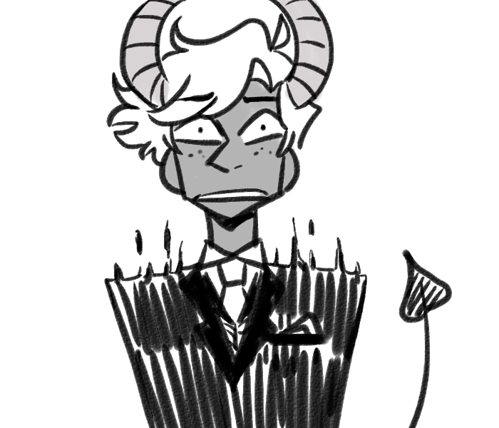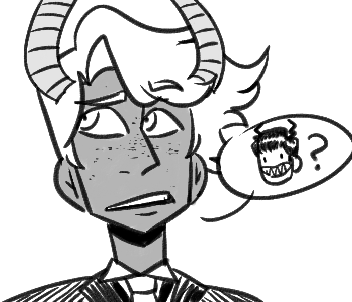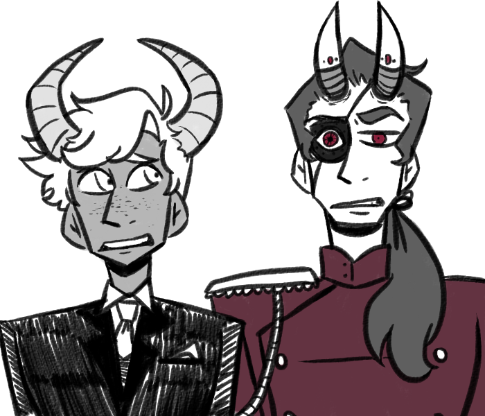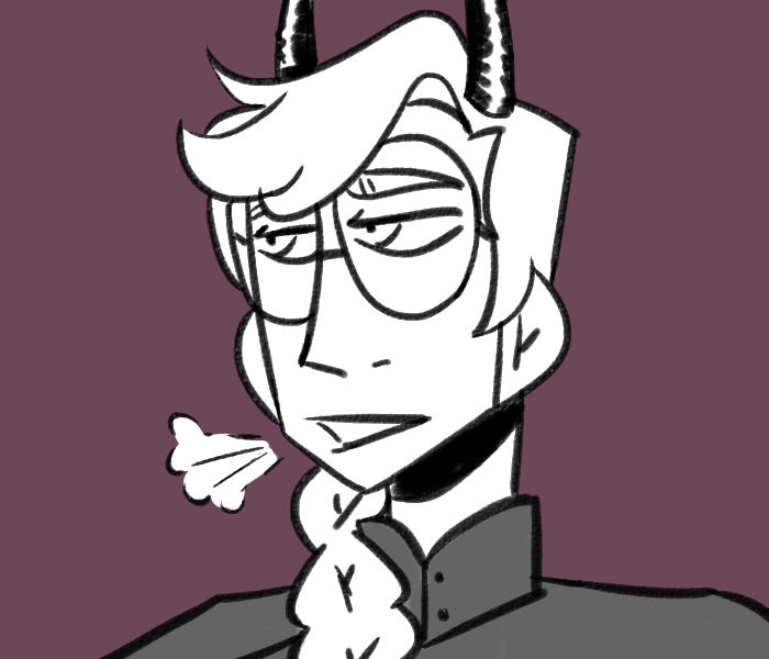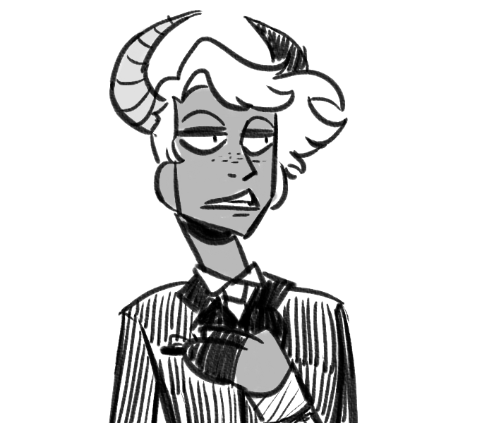 Now that you're getting a closer look at Arty, there's a lot about him that you hadn't noticed from across the room. His halo is even brighter up close, but his wings are hidden, probably shapeshifted away by choice. He hasn't offered much about what he actually does as an angel, but he has what looks like a knife strapped to his hip, instead of the sabre most diplomats are issued, or the longsword most soldiers wear in dress uniform. And then there's his eye...