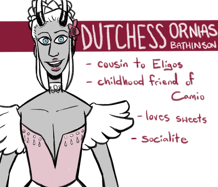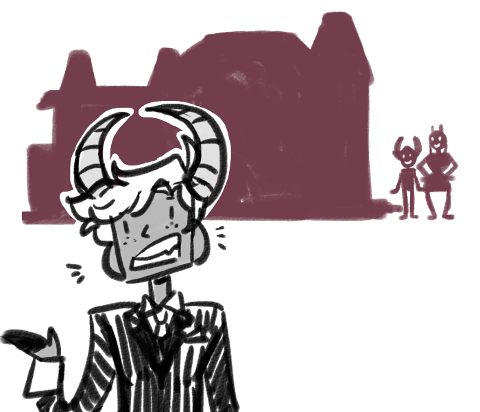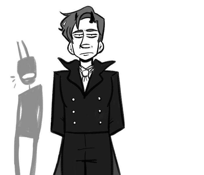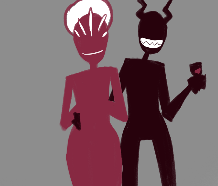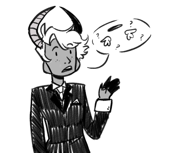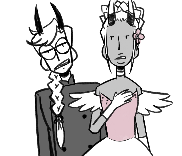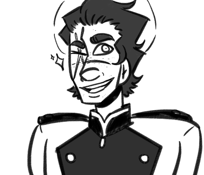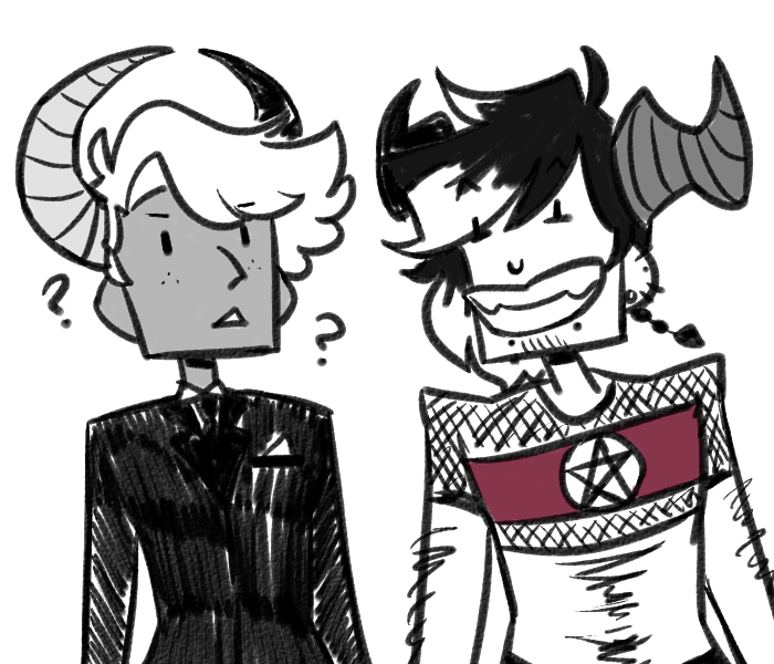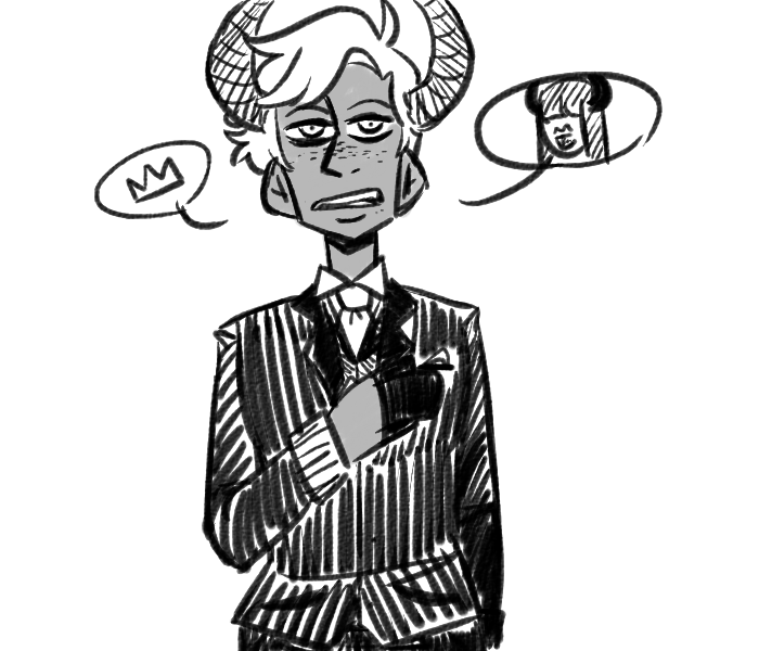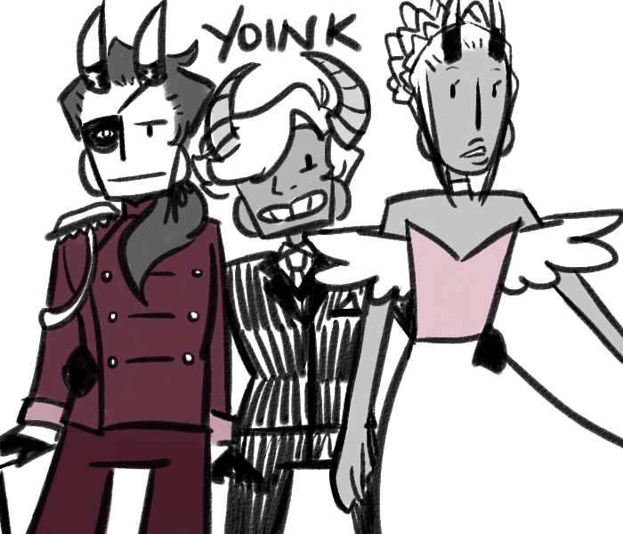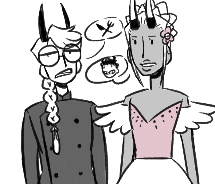 Now that you're getting a closer look at Arty, there's a lot about him that you hadn't noticed from across the room. His halo is even brighter up close, but his wings are hidden, probably shapeshifted away by choice. He hasn't offered much about what he actually does as an angel, but he has what looks like a knife strapped to his hip, instead of the sabre most diplomats are issued, or the longsword most soldiers wear in dress uniform. And then there's his eye...
