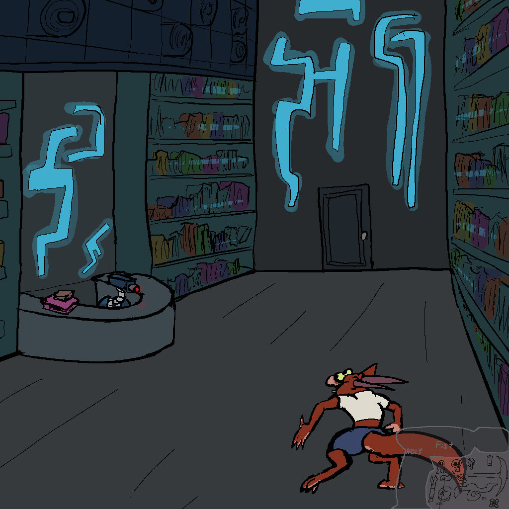 "awk" Tosfir's on Skelly's pile of goods.