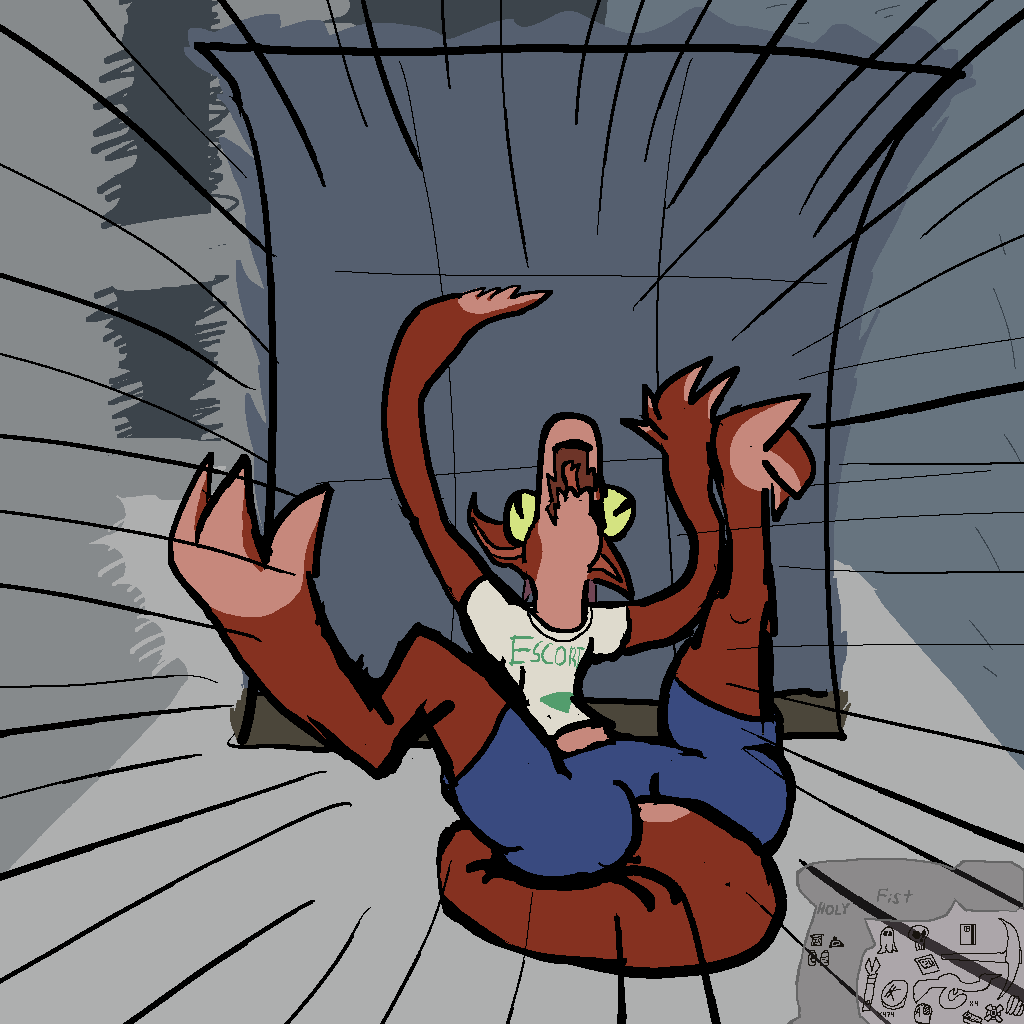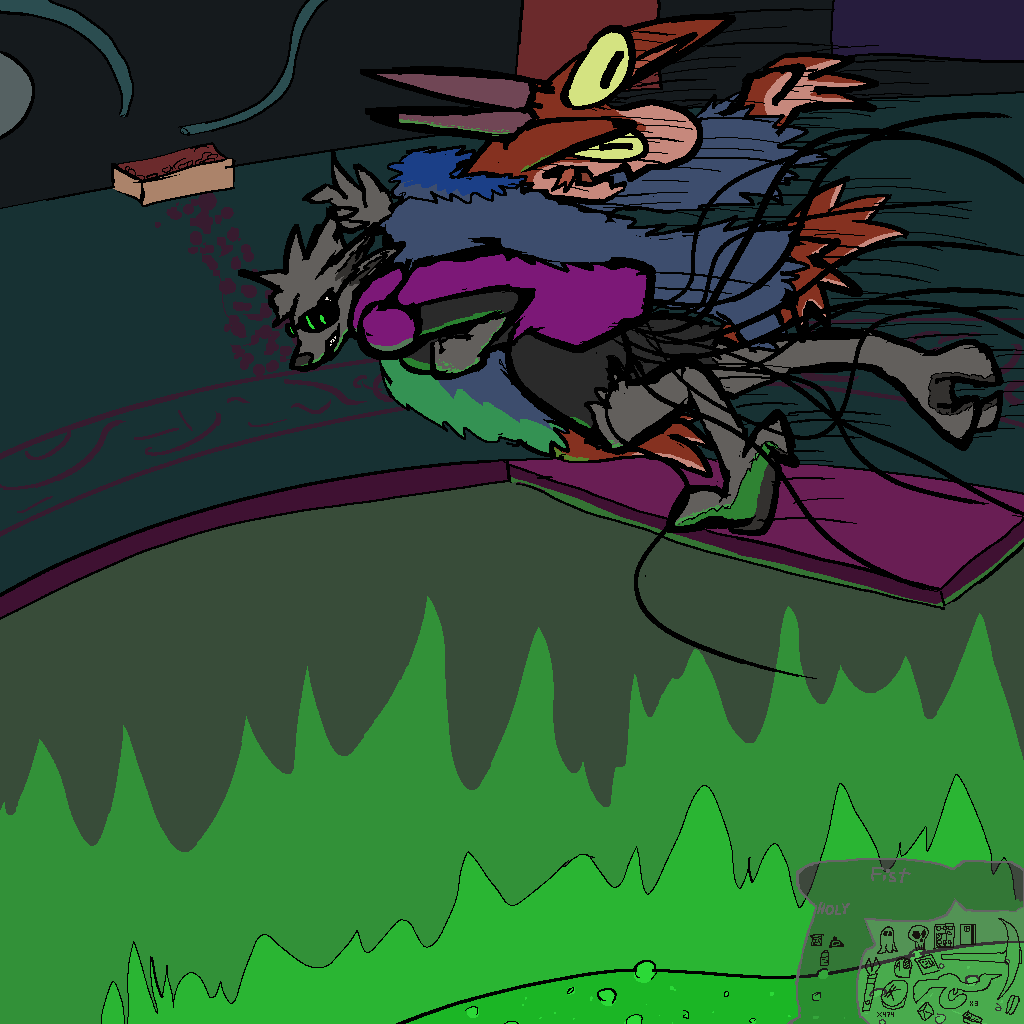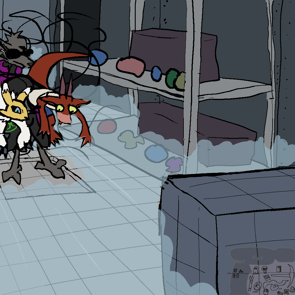 So Josie rips some boards and stuff out of the walls, and Mothbot grabs some power tools, and they make a huge-ass ramp and a skateboard we can all fit on. Tsuchinoko can jump across the gap, it turns out. Without dropping their goods, even! Wow!