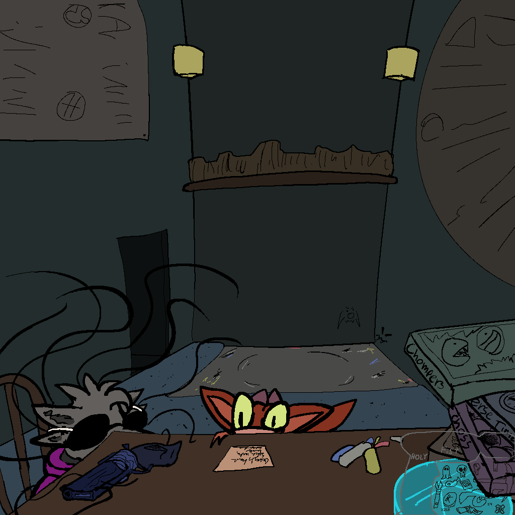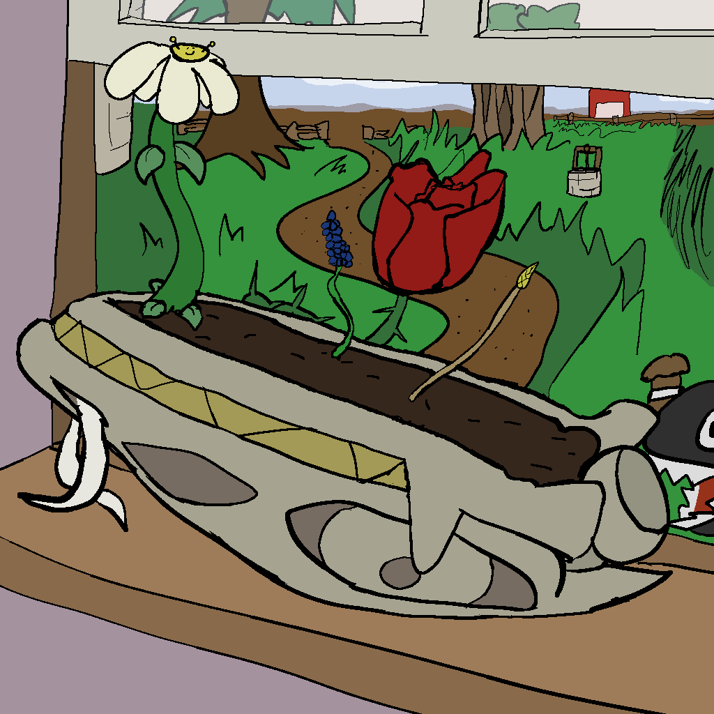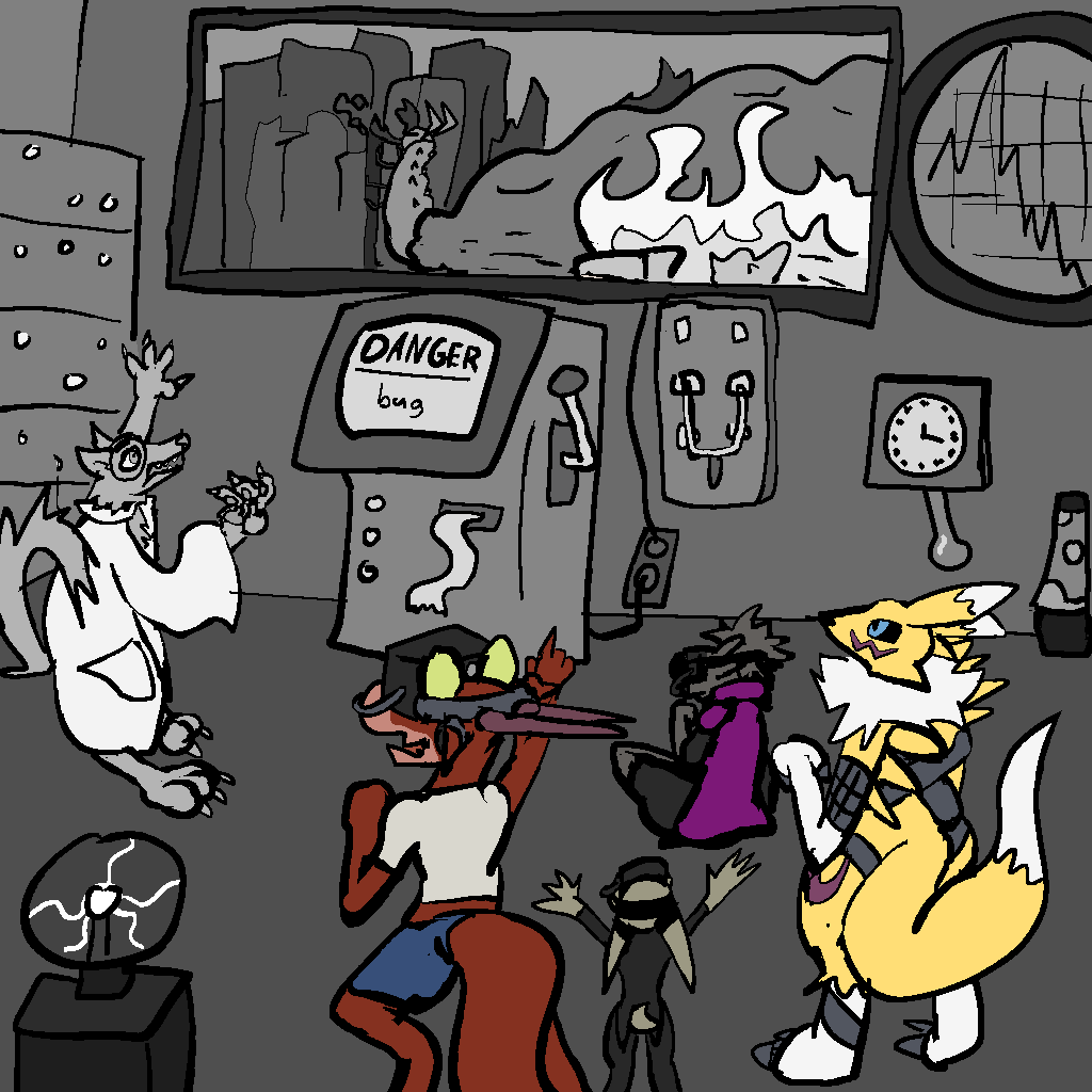 So Josie rips some boards and stuff out of the walls, and Mothbot grabs some power tools, and they make a huge-ass ramp and a skateboard we can all fit on. Tsuchinoko can jump across the gap, it turns out. Without dropping their goods, even! Wow!