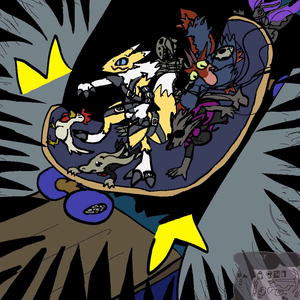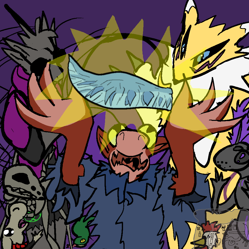 Aki finds a few souvenirs. They really like those inventory belts! They found the library, and the librarian was desperately trying to save the books. Aki gave 'em an inventory belt and the librarian helped 'em pick some books to help with their situation of bein’ new and stranded and everything. The librarian left with some books of their own choosing. We all finally meet back up at the phylactery room! Tsuchinoko is balancing loot on their head somehow, and Mothbot and Trilmus must have inventories. Mothbot's might be built in, 'cause they look pretty naked. Let's see what Skelly got. Oh, it got a bunch of decorative boney stuff! That's cute! And not surprising, but I didn't even think of it.