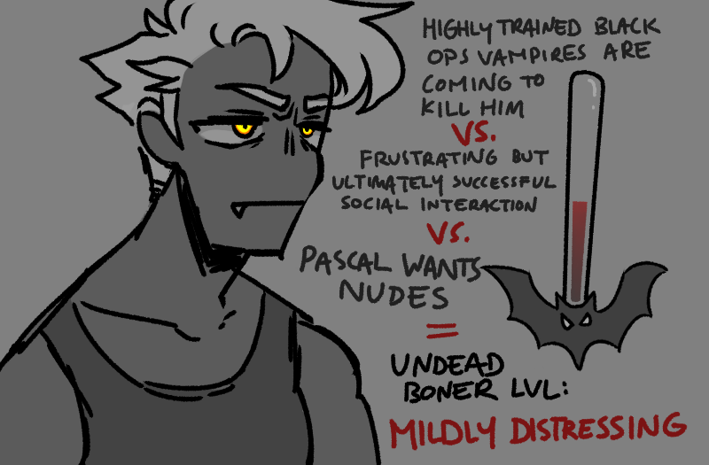 “Yes! Because, euuuhhh.” Pascal twists his fingers idly in the blankets. “Because it means already you were making these faces always, before I turn you. So — so that means it is not that when I turn you, I made you into a completely different person, and that before you were always so happy and that your personality now has changed, or something like this.” He picks at a loose thread in the blanket. “This is a selfish thing to be relieved about.”