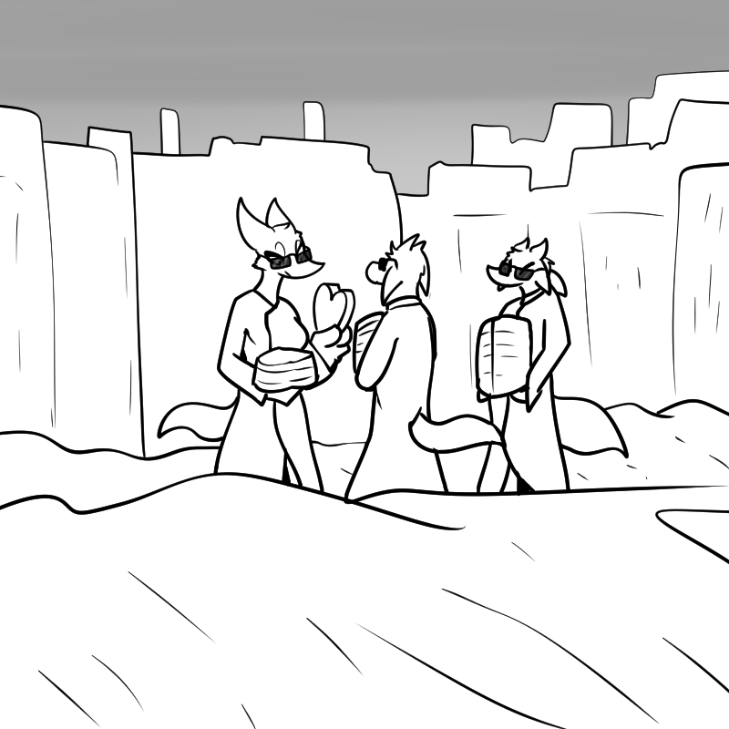 >"Okay then." says Pillet. "Here's our possible date activities. We go to the farms and take them all over, munch on chocolate, and give food to the rebels. Or, we go gang hunting, to try and find metal detectors and stuff. Or we say fuck it, and take the day off to properly relax at some nice place, since it didn't look like you blew up the whole town while I was gone."