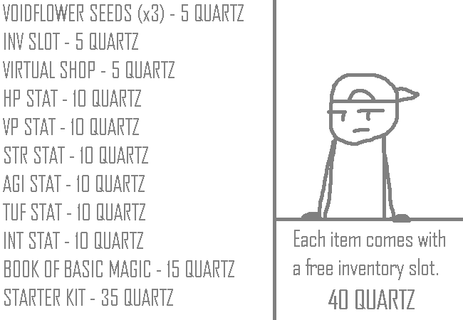 "so, welcome to my shop. i would strongly recommend the starter kit, simply because it contains a lot of goodies, that if you bought them separately, would cost more than 35 QUARTZ. but i mean, you can get other things if you want."
