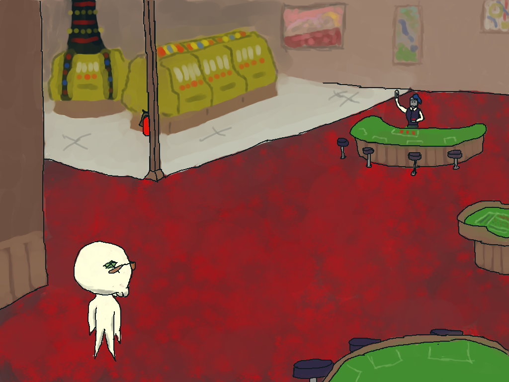 I approach the card table and the dealer waves to me a third time. They seem excited to be playing cards. I'm getting the impression that they don't get much to do. Which makes sense since it seems I'm the only customer.