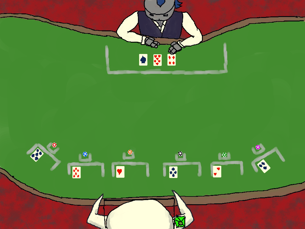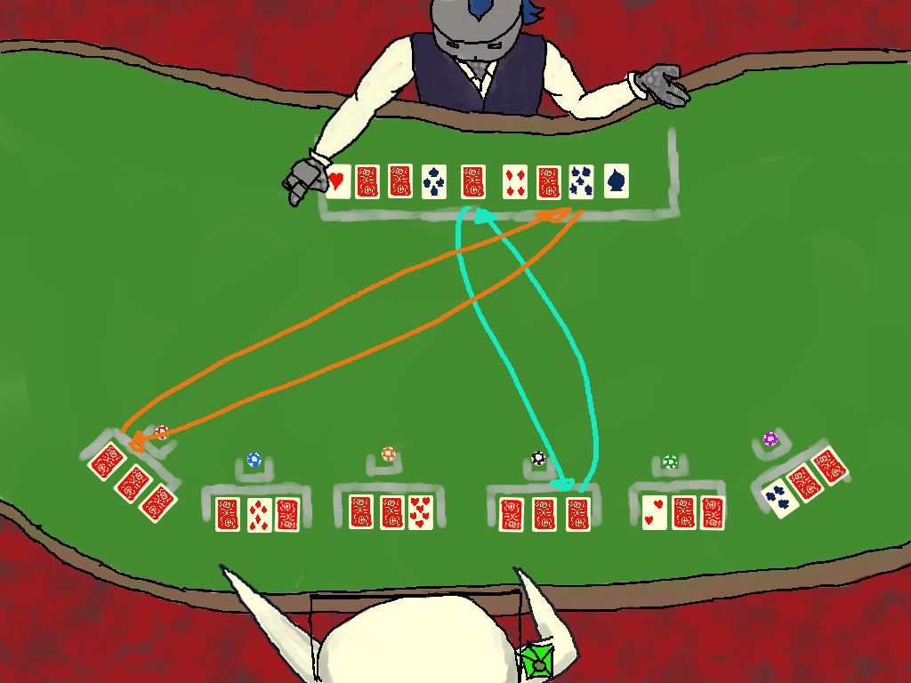 1.-For the first phase, we do setup. You will receive a card for each chip you bet to be placed in front of the chip. These cards will dealt randomly to each chip, so you don't get to assign them. The house receives cards, dealt randomly of course, equal to half of your betted chips rounding up. So if you bet three chips I will get two cards. All cards are played face-up.