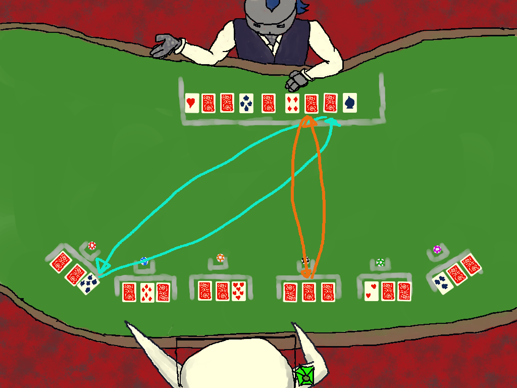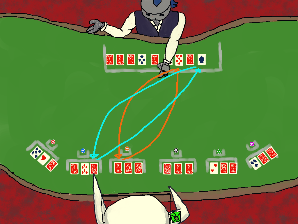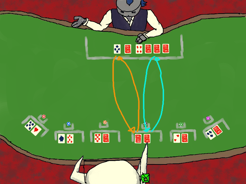 -Then, without revealing them, you will look at all the face-down cards you have received and the house will look at theirs. Once everyone knows what cards they have, we once again move onto trading.
