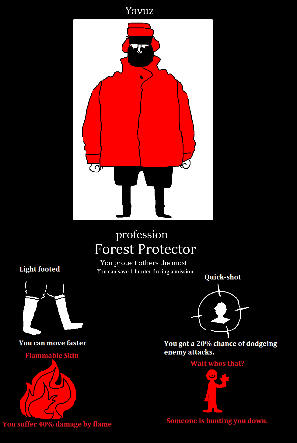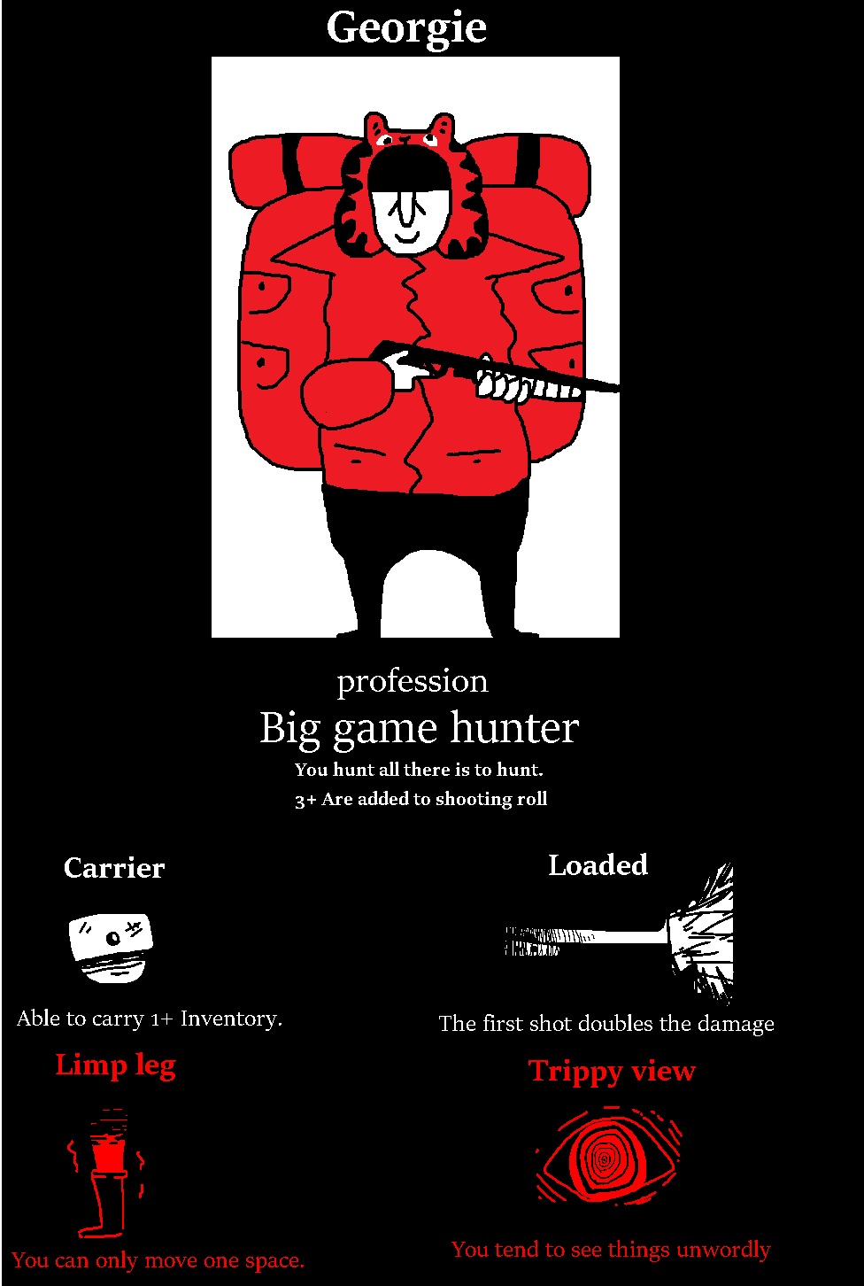 Limp Leg(Moving in battle is your next important thing, The closer you are to the enemy-You're damage increases, All Hunters normally can move 2 spaces-Georgie suffers the disadvantage of only moving 1 space per turn.)