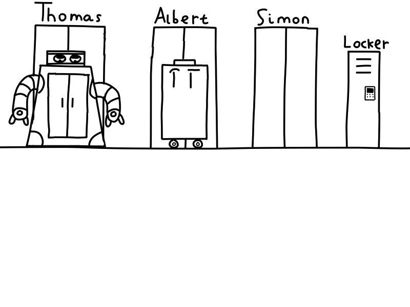 I've put your ARMS in the STORAGE SHED, behind the oil can and crate of wrenches. Your LEGS are in the LOCKER in the hallway. The password is 1601. Got that? If it makes you feel better I'll even work on some new optics for you after we get back. Never say that Simon doesn't do anything for ya.