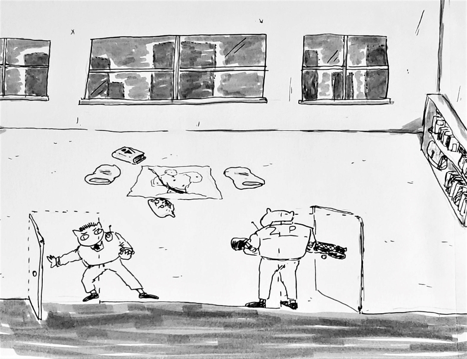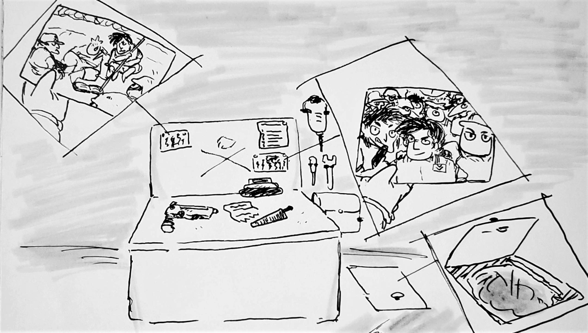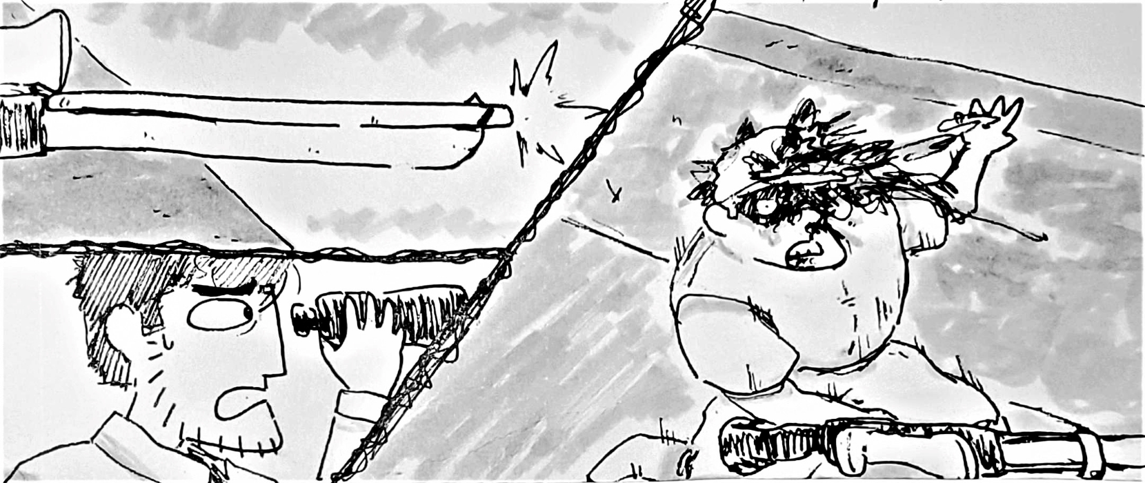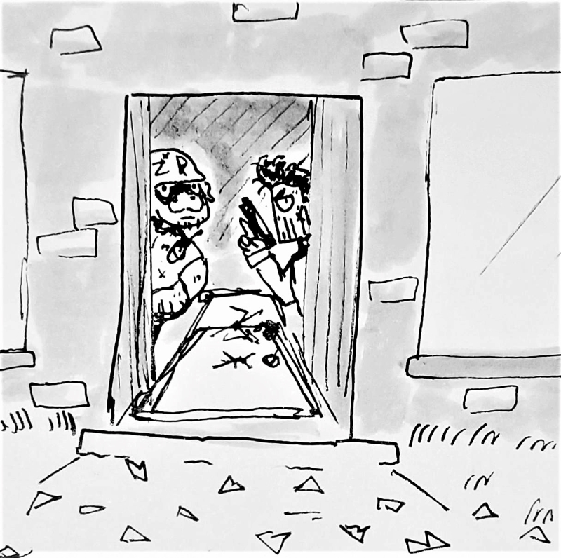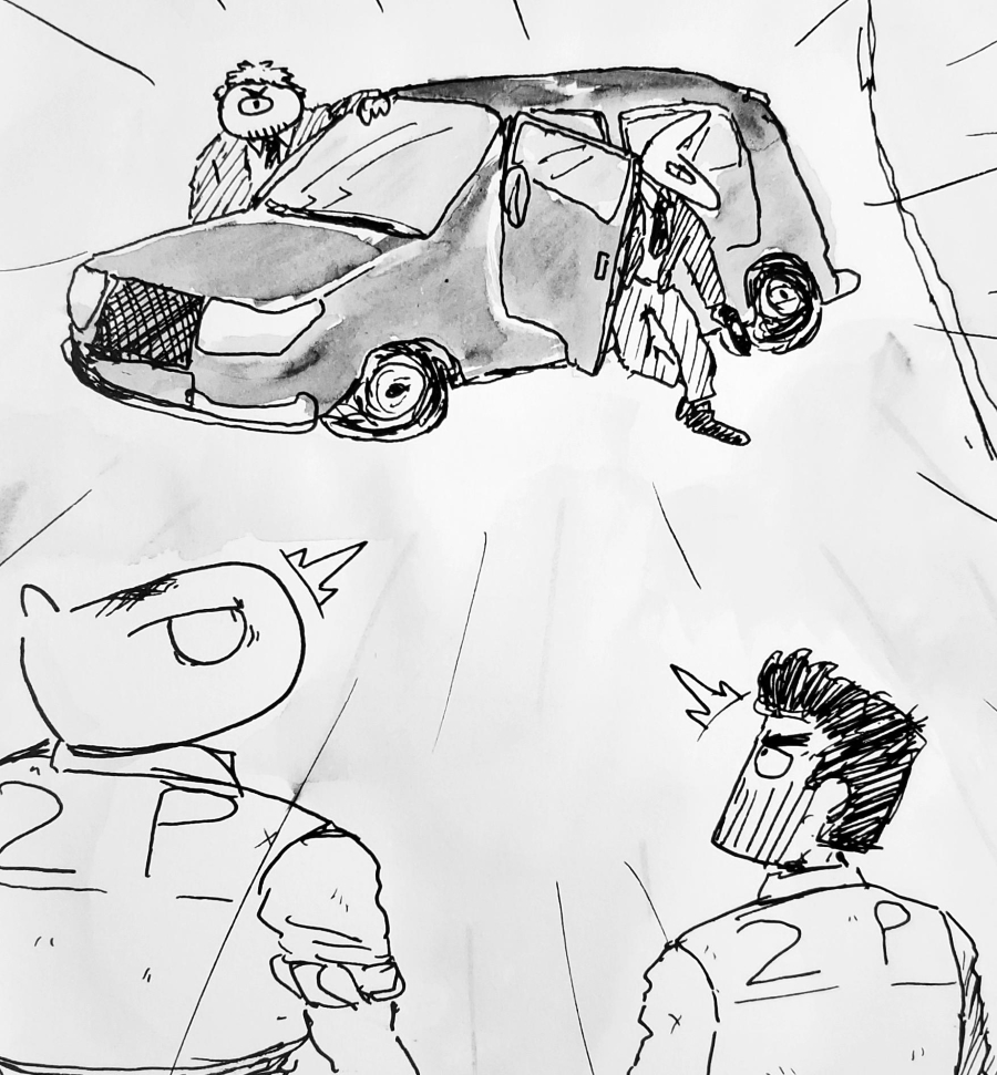 Sudden movement puts all of you on edge. One of Crab's men dashes outside, reaches their vehicle and starts frantically digging around. He heaves out what looks like a large RC vehicle and disappears back inside.