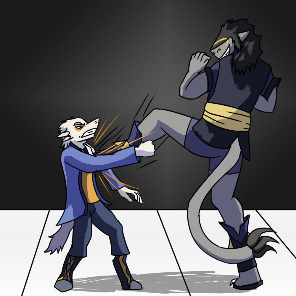 You don't want to be guessing on this last one; force her to attack on your terms. Come around to her left, your right, and prepare for a swing from her tail or a roundhouse kick in reaction.