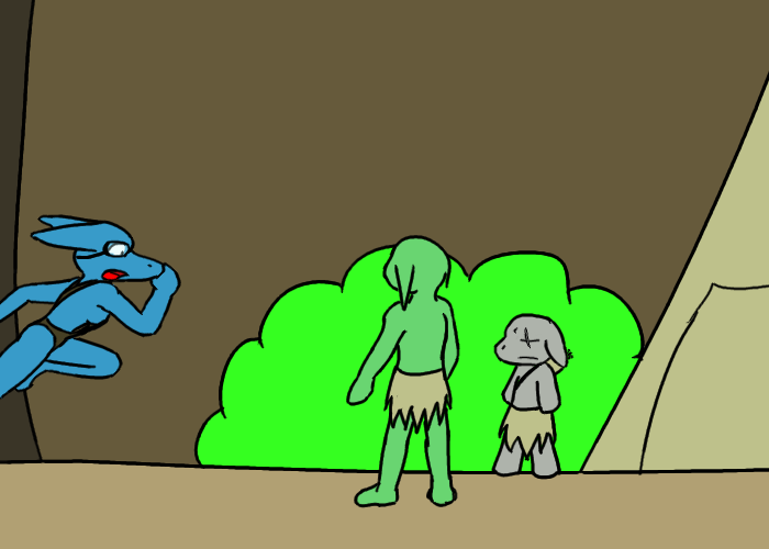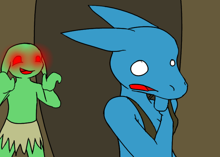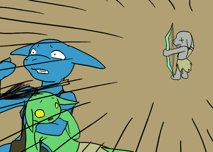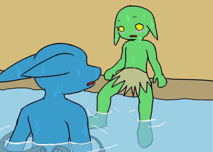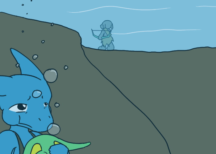 Anyway, we jump into the Big Snake River. I keep quiet for awhile, holding the goblin's mouth as well to keep him shut. In an instant, I see Murdelp return to the village, completely scared. He has this natural fear of water, for some reason.