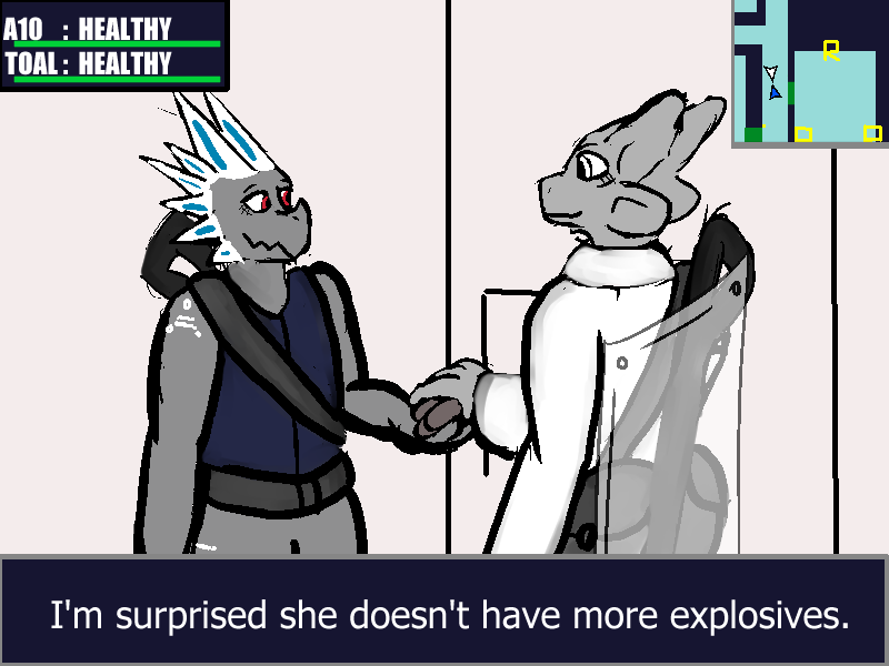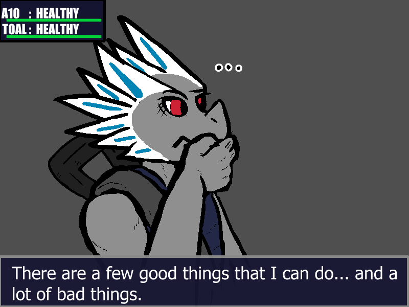 We discuss a few more things. Apparently I've been asleep for 3 hours and nothing else has really happened. Toal's been reading some of the notes and says that Geigers and Tozol seem to have been engineered to have very similar capabilities. At full strength, the two of us working together would be a terrifying force.