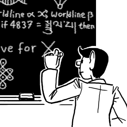 "C'mon, we've been through this! Page 37 to 48 on your books. Remember the dizzy part when the quantum snake thrashes inbetween waveforms? There's bound to be worldlines colliding then! So, solving for X would be easy! Come on, anyone solve for X?"
