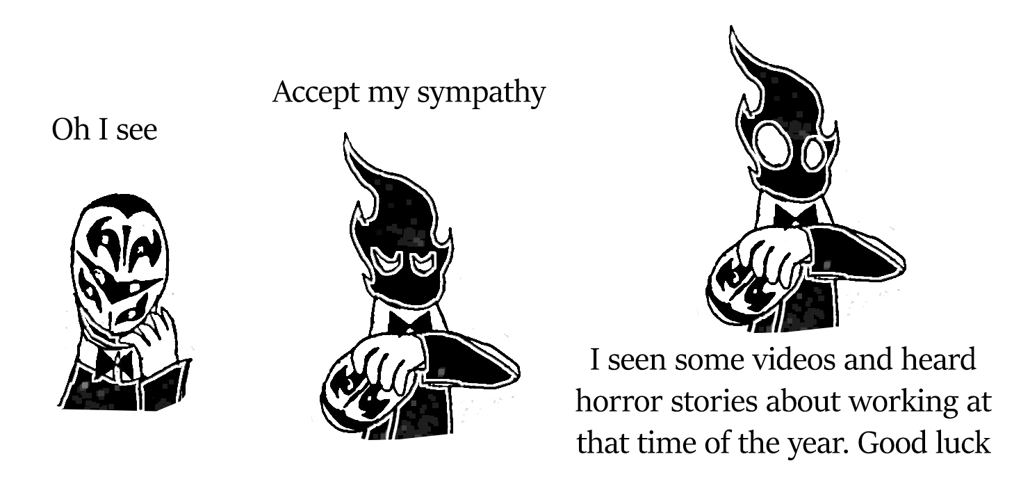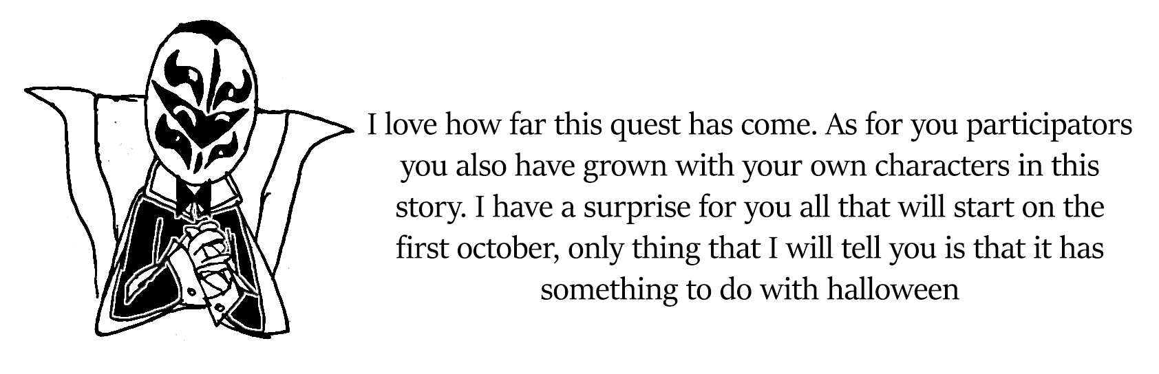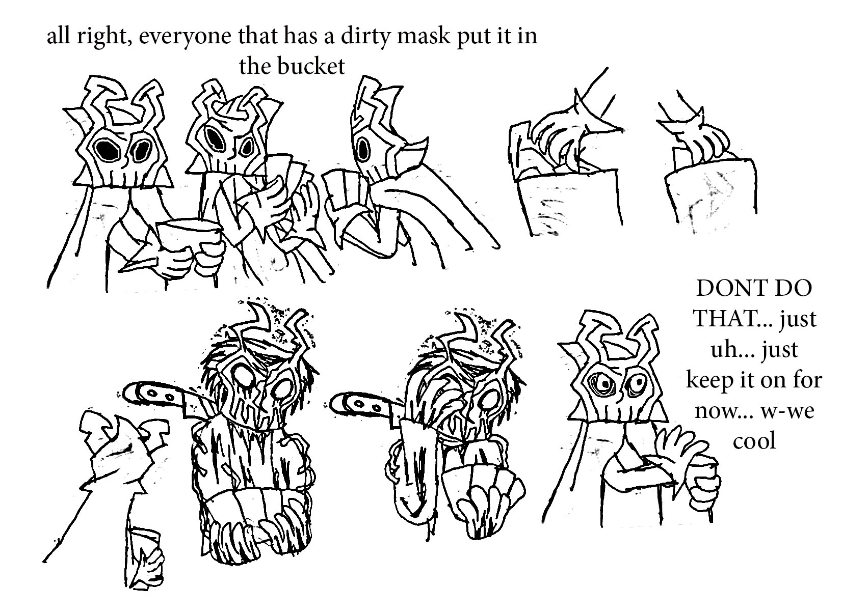 After the two of them leave WC requests using a small silver hand bell that he gave them when they first met. The bell opens up a small pocket dimension where a curator and shopkeeper named "One Horned Jack" runs a business selling good and information. One Horned Jack isn't his real name but it's what he goes by as a curator. Apparently on this pocket dimension Scarred and Fortune also have seeable forms, although they can't interact or touch anything, they are still able to talk and be heard by both the curators and Ana. Ana makes a brief radio call to Anatasia to test out the radio and they establish code names and she learns the cult is pulling corpses out on the streets and burning them. WC and Jack leave to talk business and Ana looks at what is for sale. Turns out Jack isn't just a shopkeeper but a man who will literally sell everything under the sun from items to secrets. Ana buys some healing items called "the needles of life," which can heal any injury no matter their severity. Jack and WC come back from talking business and as it turns out, owes a debt to Scarred and Fortune because they saved his daughter's life. Jack's daughter is Matilda who was on trial earlier and he gives them some information about who buys from his shop, mostly cult members needing medical supplies or even drugs. They negotiate the distribution of some needles of life to people who need them like Lester who as you remember will be stabbed later on and this may save his life. The shop also has a young blacksmith there who simply goes by "Blacky." . She also gives a new mask order for Blacky to fill out as the cult has already begun to recognize her by her fish mask, as well as gets a new weapon head for her hockey stick. Blacky turns it into a Svardstav, a swedish weapon that's a kind of long spear with a short sword on the end rather than just a regular spear head. Black leaves to complete the weapon order after it has been placed.