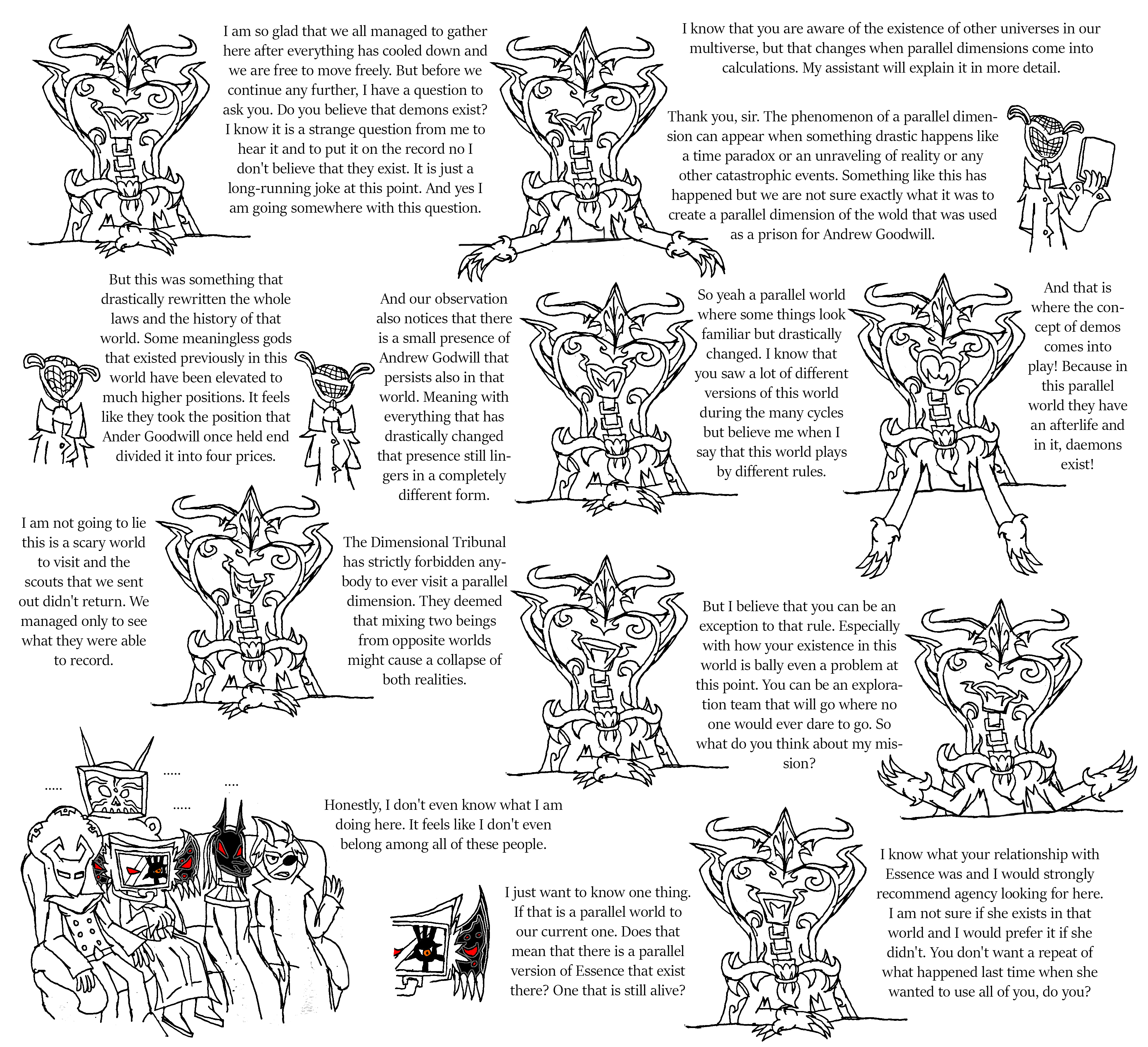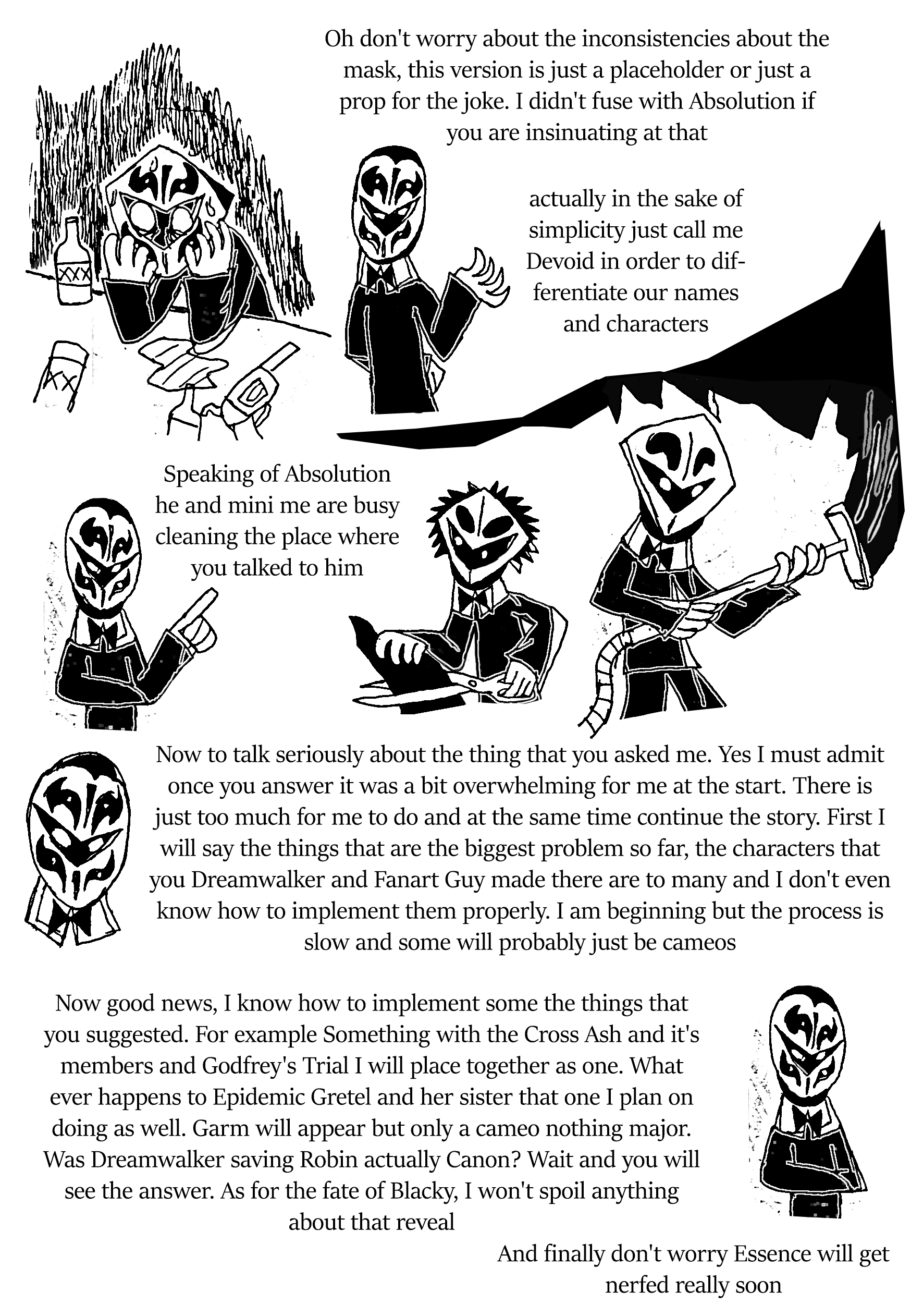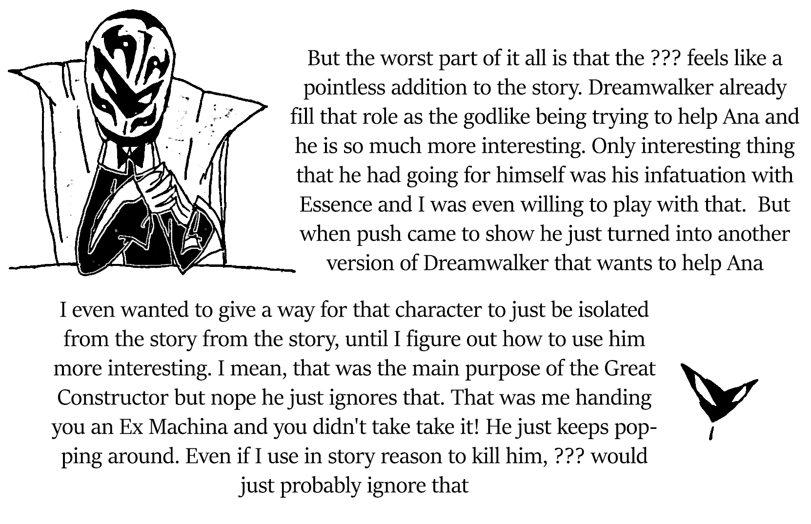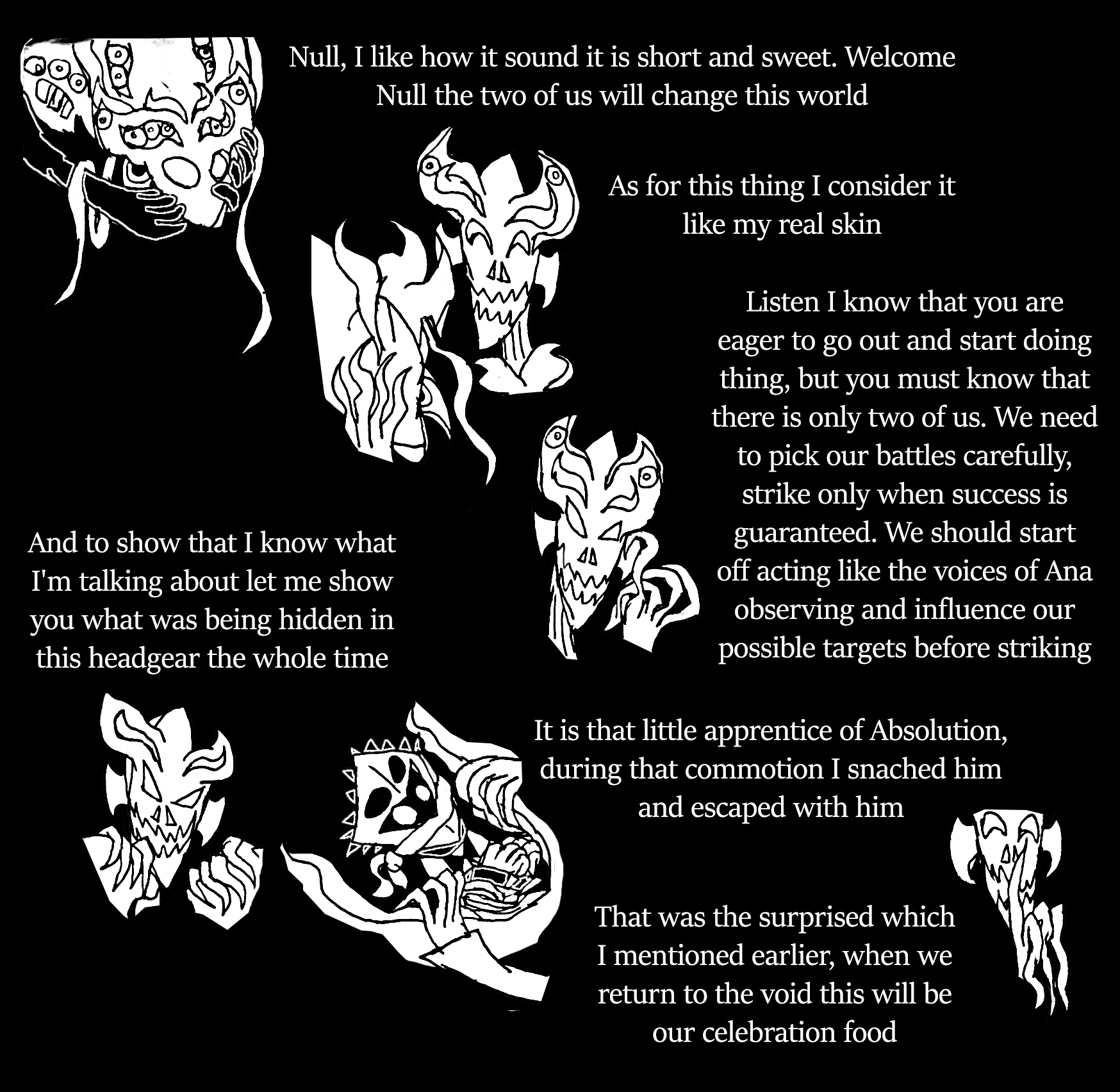 Meanwhile all of this going on Ana is talking with the young offspring of Mother Gaia and Absolution, who is promptly named Absolution Jr, and from this point on goes by AJ. AJ shows her that now with him acting as her right eye, Ana now has access to basic magic abilities. Ana is able to summon fireball and shoot it like a bullet from her finger. However this is the extent of her power so far, and it's all AJ can give her at the moment as WC is actually hindering her and AJ's ability to evolve and grow further at the moment, they will still grow however but at a slower rate. When suddenly, who should appear by Andrew Goodwill again. He reveals that Clara suddenly attacking was against his order and that Root was the one who ordered the death of Absolution due to receiving knowledge of another universe that had a far greater impact with magic and that he needed to die in order stop such a cataclysmic future. As stated this was against Andrew's orders and so he feels Root needs to be punished for his insubordination. He also plays the blame game and tries to convince Ana that her voices are actually a hinderance to her but it doesn't really work, although he does give some convincing arguments. In response Andrew gives Ana a sudden nightmare of her being attacked by a singing Root and immediately tries to blame it on the newest arrival to this meeting.