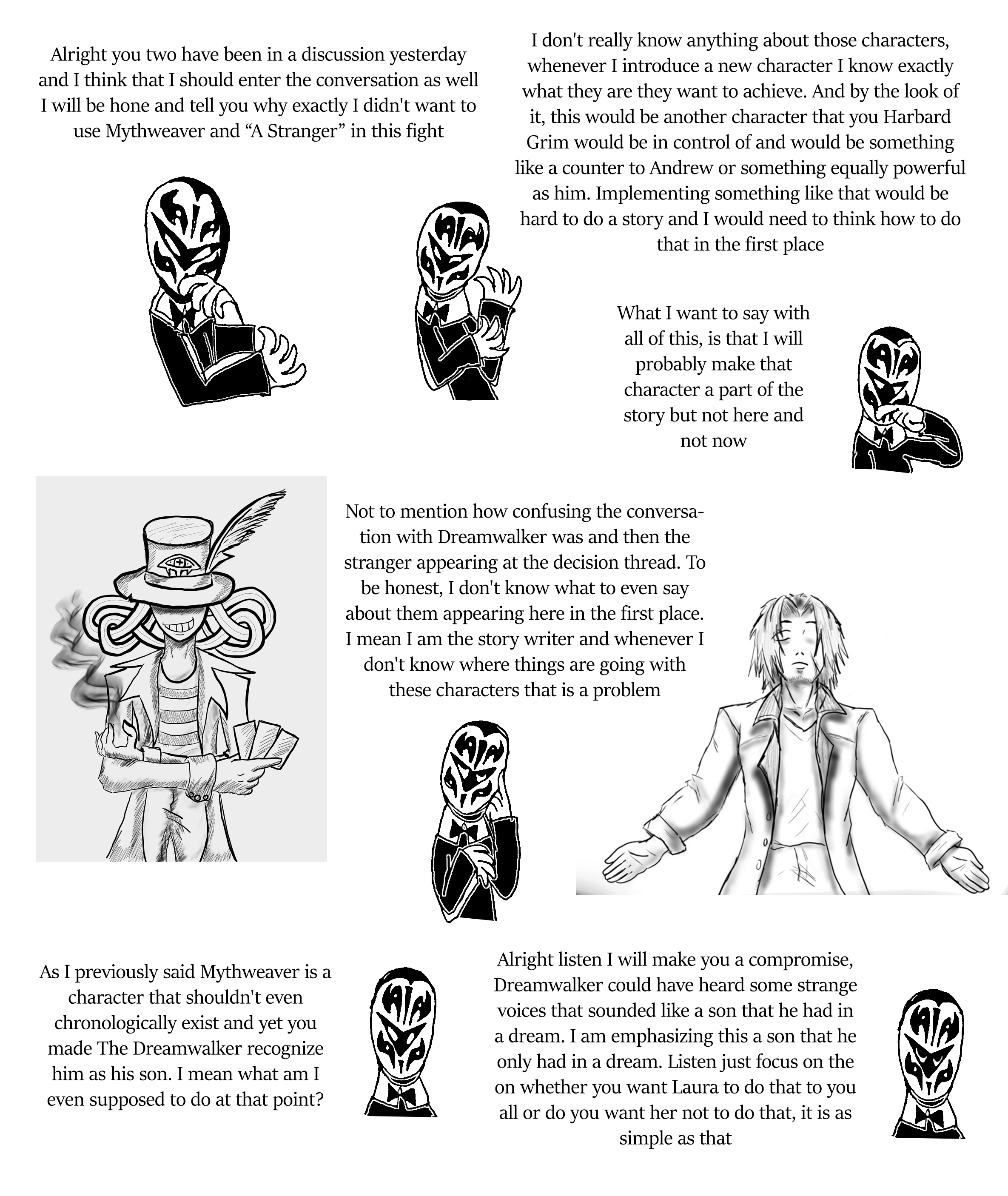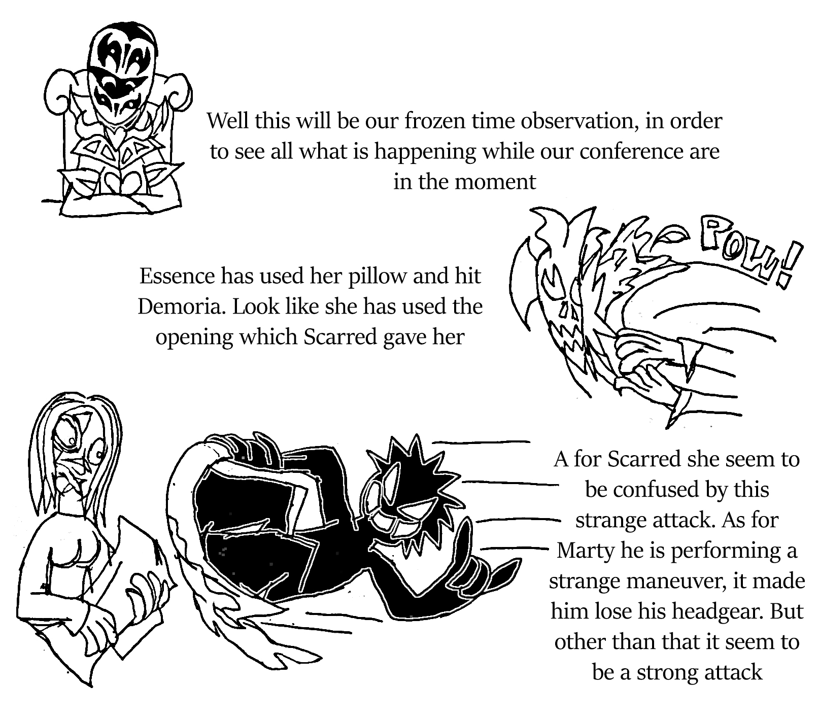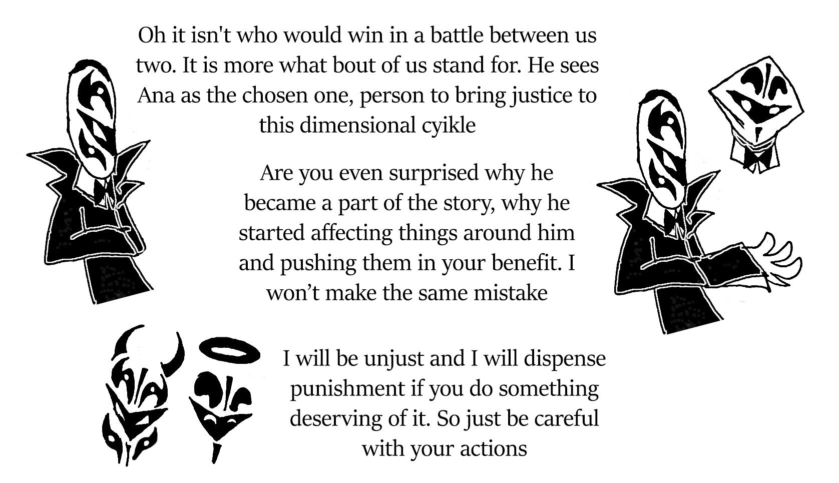 Meanwhile all of this going on Ana is talking with the young offspring of Mother Gaia and Absolution, who is promptly named Absolution Jr, and from this point on goes by AJ. AJ shows her that now with him acting as her right eye, Ana now has access to basic magic abilities. Ana is able to summon fireball and shoot it like a bullet from her finger. However this is the extent of her power so far, and it's all AJ can give her at the moment as WC is actually hindering her and AJ's ability to evolve and grow further at the moment, they will still grow however but at a slower rate. When suddenly, who should appear by Andrew Goodwill again. He reveals that Clara suddenly attacking was against his order and that Root was the one who ordered the death of Absolution due to receiving knowledge of another universe that had a far greater impact with magic and that he needed to die in order stop such a cataclysmic future. As stated this was against Andrew's orders and so he feels Root needs to be punished for his insubordination. He also plays the blame game and tries to convince Ana that her voices are actually a hinderance to her but it doesn't really work, although he does give some convincing arguments. In response Andrew gives Ana a sudden nightmare of her being attacked by a singing Root and immediately tries to blame it on the newest arrival to this meeting.