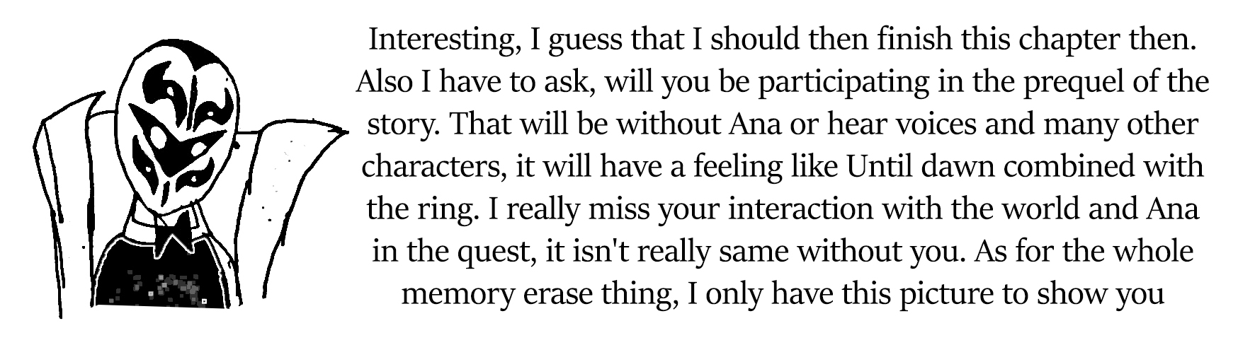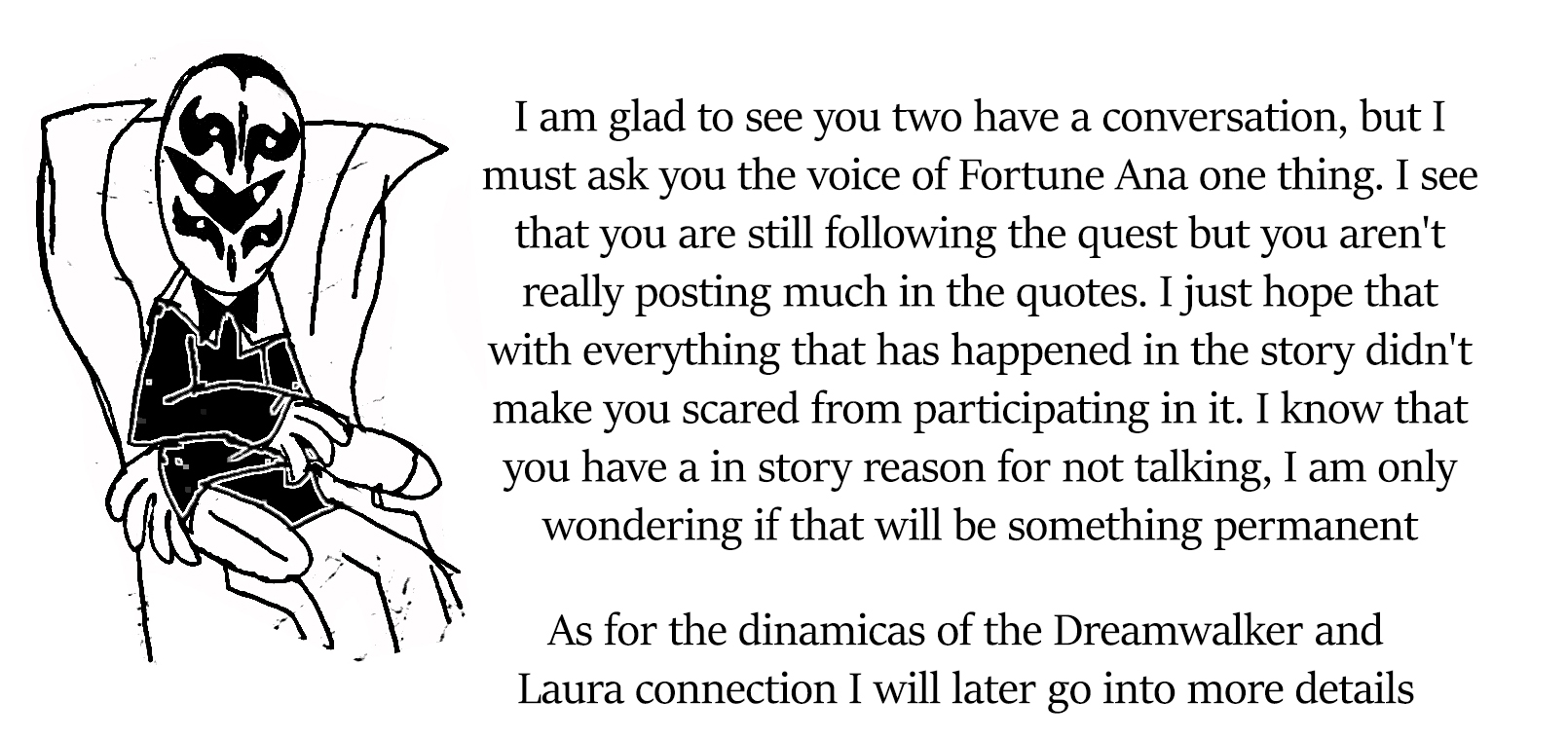 Suddenly, who should break into this pocket dimension by Logan the Magus himself. Ana attempts to be cordial, and Scarred is delighted to see the man who became her husband, but Logan is furious and demands she hand over AJ immediately. Logan reveals he knows that Andrew Goodwill is aware of his presence but he isn't the one he is worried about, and he demands she hand him over as he sees him as a little brother. Suddenly Dreamwalker shows up who was apparently disguised as one of Ana's voices and has been following her since she woke up and he helps defuse some of the tension in the air and points out some areas of information that Logan was missing. Ana however breaks down in tears and says that she knows her actions may very well be what got Absolution killed. She takes of her mask and offers to let Logan take AJ. But seeing her cry seems to have softened Logan up a little bit and he admits that he was too harsh and that the psychic connection has already been made between Ana and AJ. Jack comes back and offers both Logan a letter from Root. Upon opening the letter however it establishes a kind of ghost communication with Root and he invites Logan to his dinner party claiming that both he and Logan as well as Ana are all friends and allies. Both of them just see him as a sick fuck and while Logan agrees to "attend." Jack is also reprimanded by Lorence who shows up on the line and says that by serving Ana Jack fucked up and will need to have a performance review It's revealed this invitation is how Logan showed up at the dinner party in the side quest and how he was able to kidnap Root and kill off certain cult members. Logan says he has to leave soon and see someone who he isn't really wanting to see but it's a complicated situation and he must attend. Before he goes he warns Ana about someone called "The Ambassador" and that he's a dangerous and creepy person but he is definitely someone better to have on your side than against you.