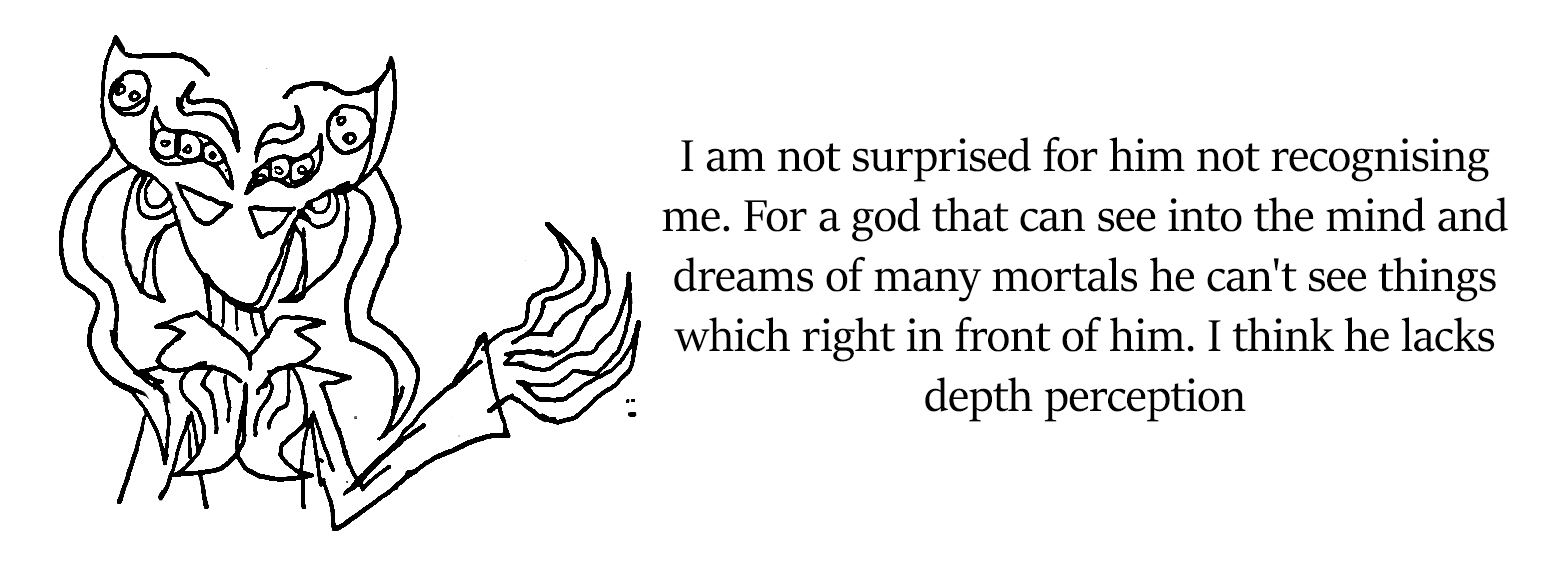 It's here Ana meets the brother of Absolution, the one who has placed a curse on the entire cult of the Ash Tree for the death of his brother. Morpheus the Dreamwalker, God of Imagination, progress and innovation, and dreams and nightmares. Dreamwalker makes it very clear that by siding with the cult, and for the deaths of his brother he has sworn vengeance on Root and by proxy, Andrew Goodwill. However some very odd peace negotiations occur in which Andrew tries and fails again to get more people on his side, but Dreamwalker will not be moved. Dreamwalker pledges to help Ana in anyway he can provided she takes care of AJ, his nephew. Andrew leaves in something of a huff and Dreamwalker helps Ana wake up back on the material plane.