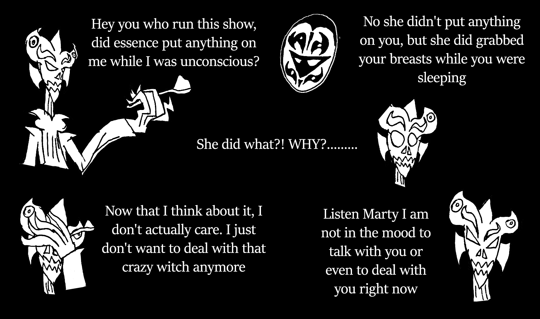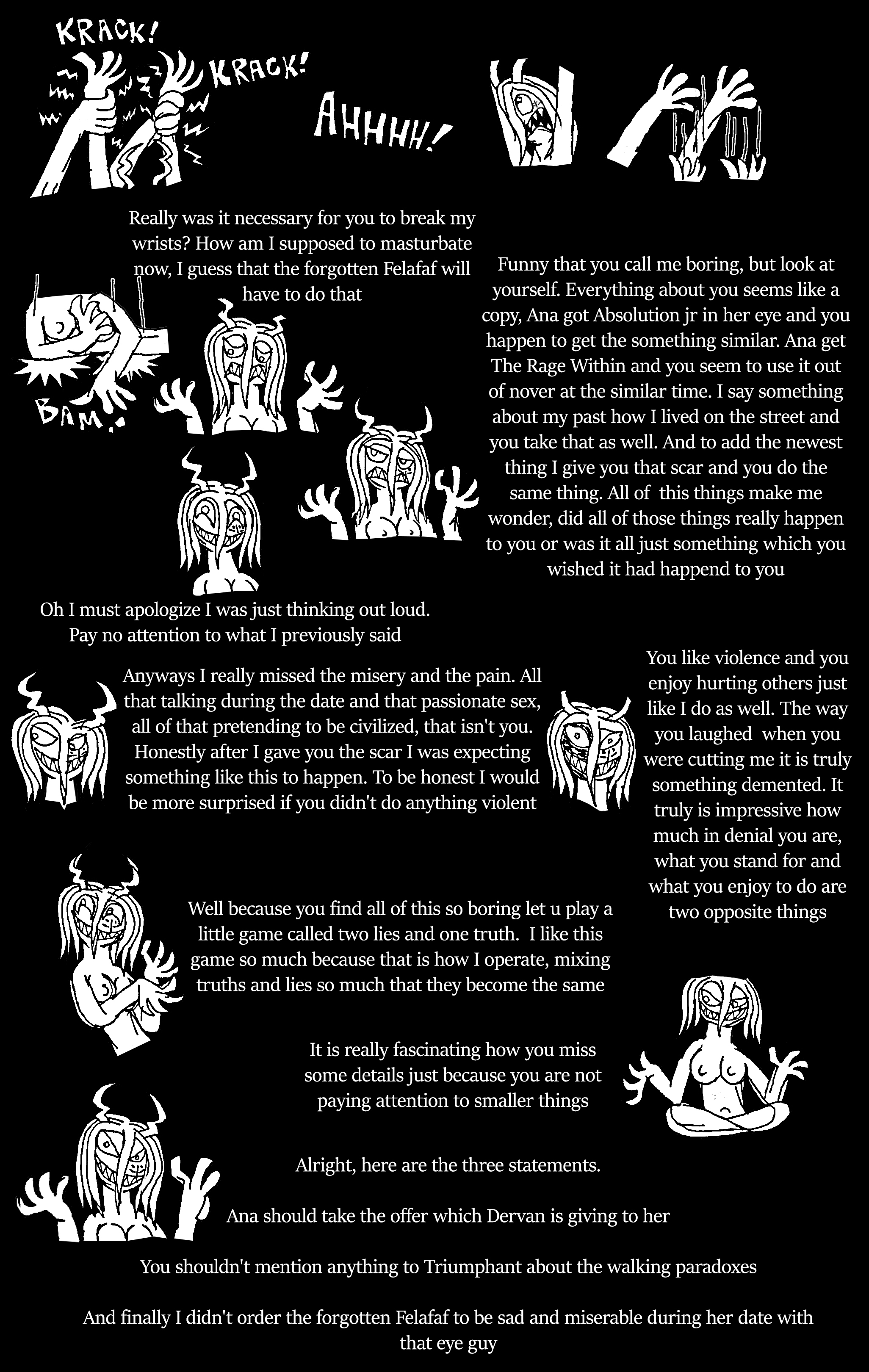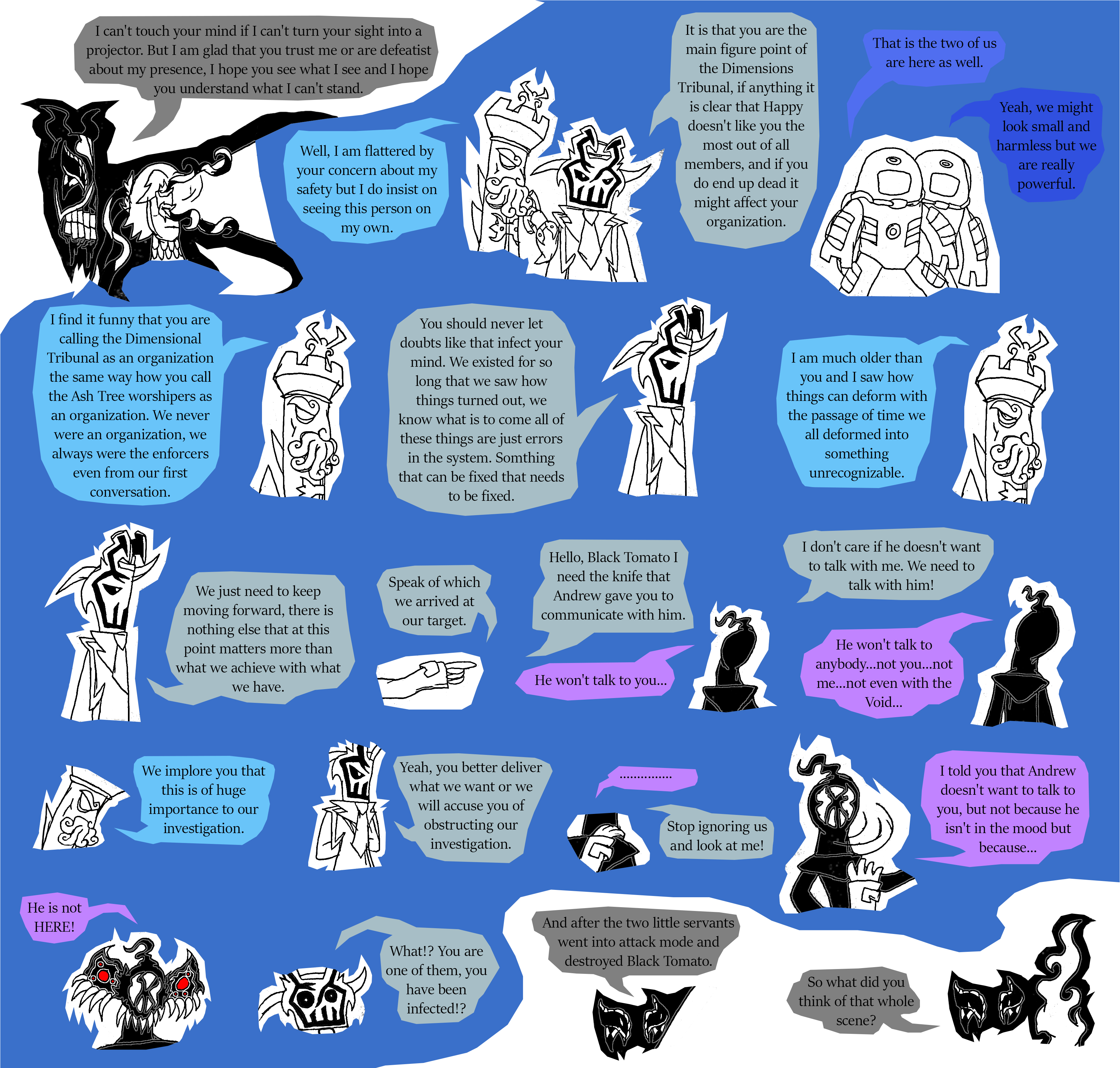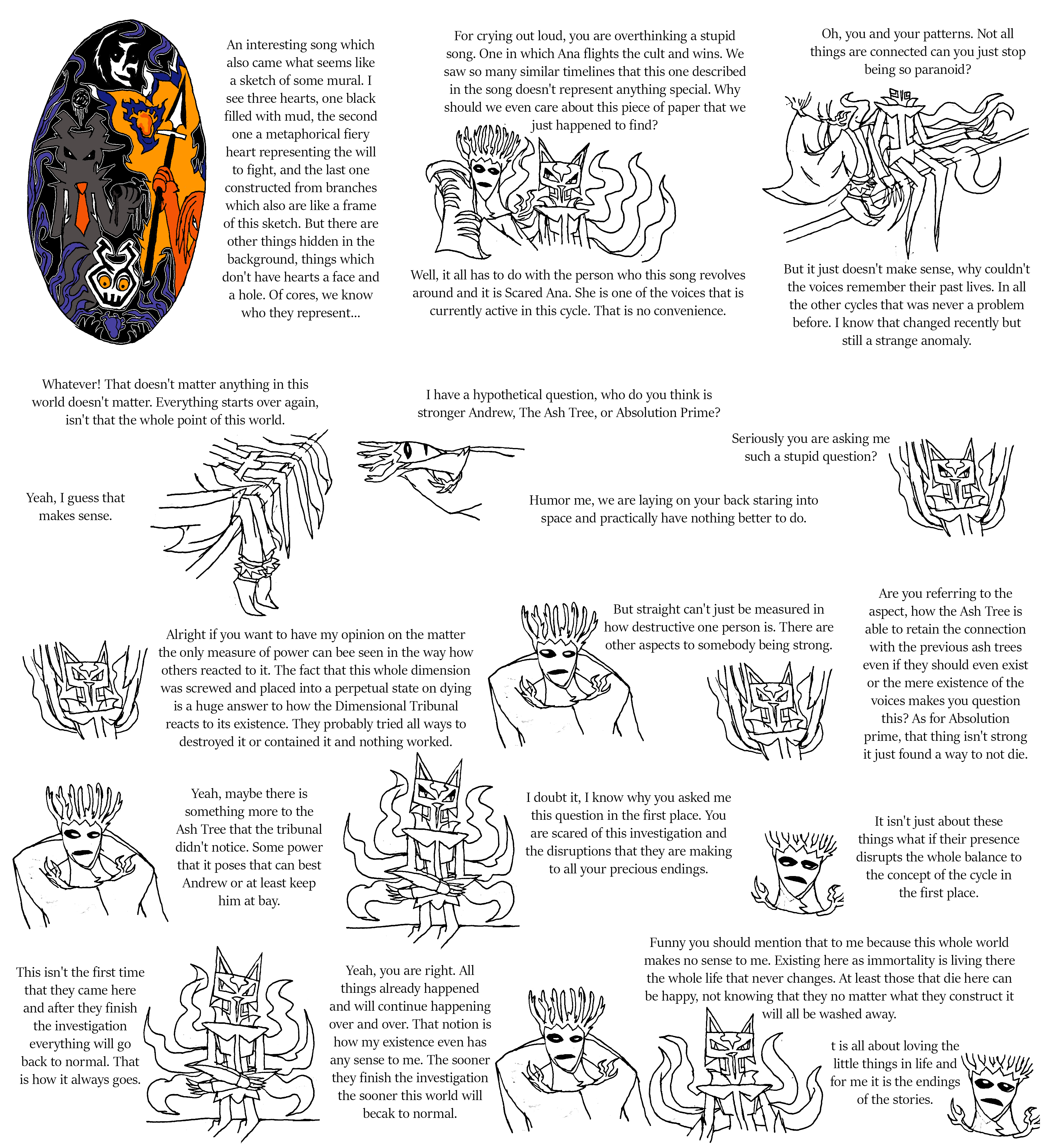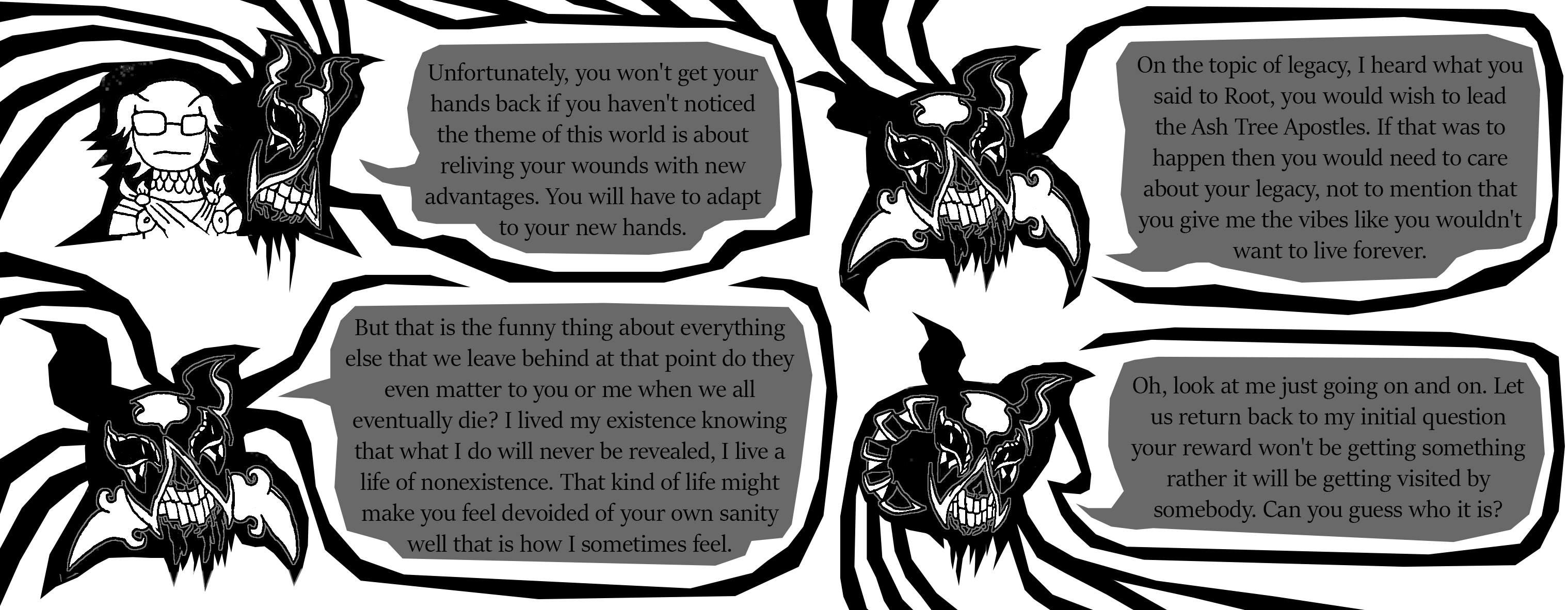 Continuing with the recap, we start with Ana's story. Something, or someone has hijacked her exit from the Astral plane and she see a dream of someone who has a dream of chopping down a tree, but then the tree retaliates and makes the lumberjack a part of itself. The lumberjack awakens and knows "they must protect her at any cost." Remember this "lumberjack" because they will be important later and cause a shit load of trouble for Scarred and Fortune. Speaking of our intrepid duo, the two of them after seeing the events of the side quests have a meeting with the real master of the black fog and the true leader of the Acolytes of the Ash Tree, the demon known as Andrew Goodwill. He makes it clear that the Ash Tree demon is basically his bitch and he uses him like a weapon to fuel his own dark designs, he also reveals that he wanted to punish Root for going against certain order as killing Absolution was not his wish, and that he was the one who granted Scarred and Fortune bodies to beat the shit out of Clara. Andrew then offers Scarred and Fortune a choice of who they would like to see die, for no other reason than his own amusement. However in defiance of him they chose none of them and instead pick someone entirely random (intending for Andrew to pick himself) as they don't want to hurt anyone. However the joke is on them because instead he picks Wildcat, the Curator attached to Ana. They quickly make a bargain for his life, but Andrew proposes a new idea, he takes over Ana's body to further punish Root. Both them promptly refuse, so in order to defuse the situation and save Wild Cat (who I will refer to as WC from here on) they all start to tell some really dirty jokes in order to save him, only highlighting how capricious Andrew Goodwill really is. Scarred comes in handy here as she tells one about a guy fucking a cow to death as well as "The Aristocrats Joke," often considered the dirtiest joke in existence (see here for what she said: https://www.youtube.com/watch?v=aGA0dIz9-Wk) The joke is so filthy that Andrew lets WC live. They all swap some jokes, and Andrew leaves in good humor and WC promises to do his best to help Ana. Andrew returns to Root and warns him to not get so high and mighty again.