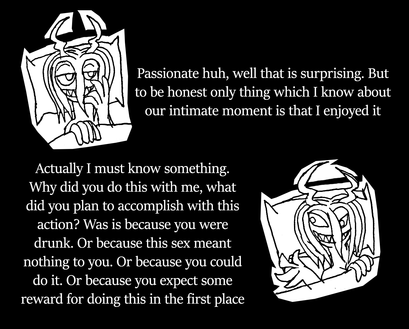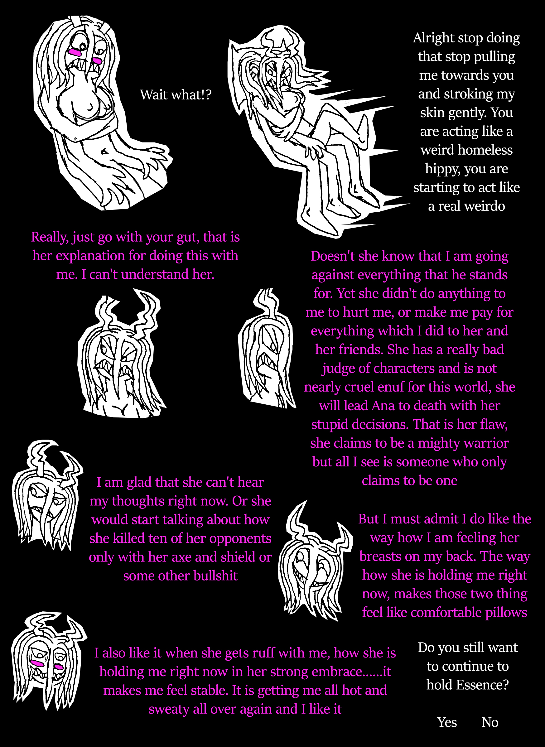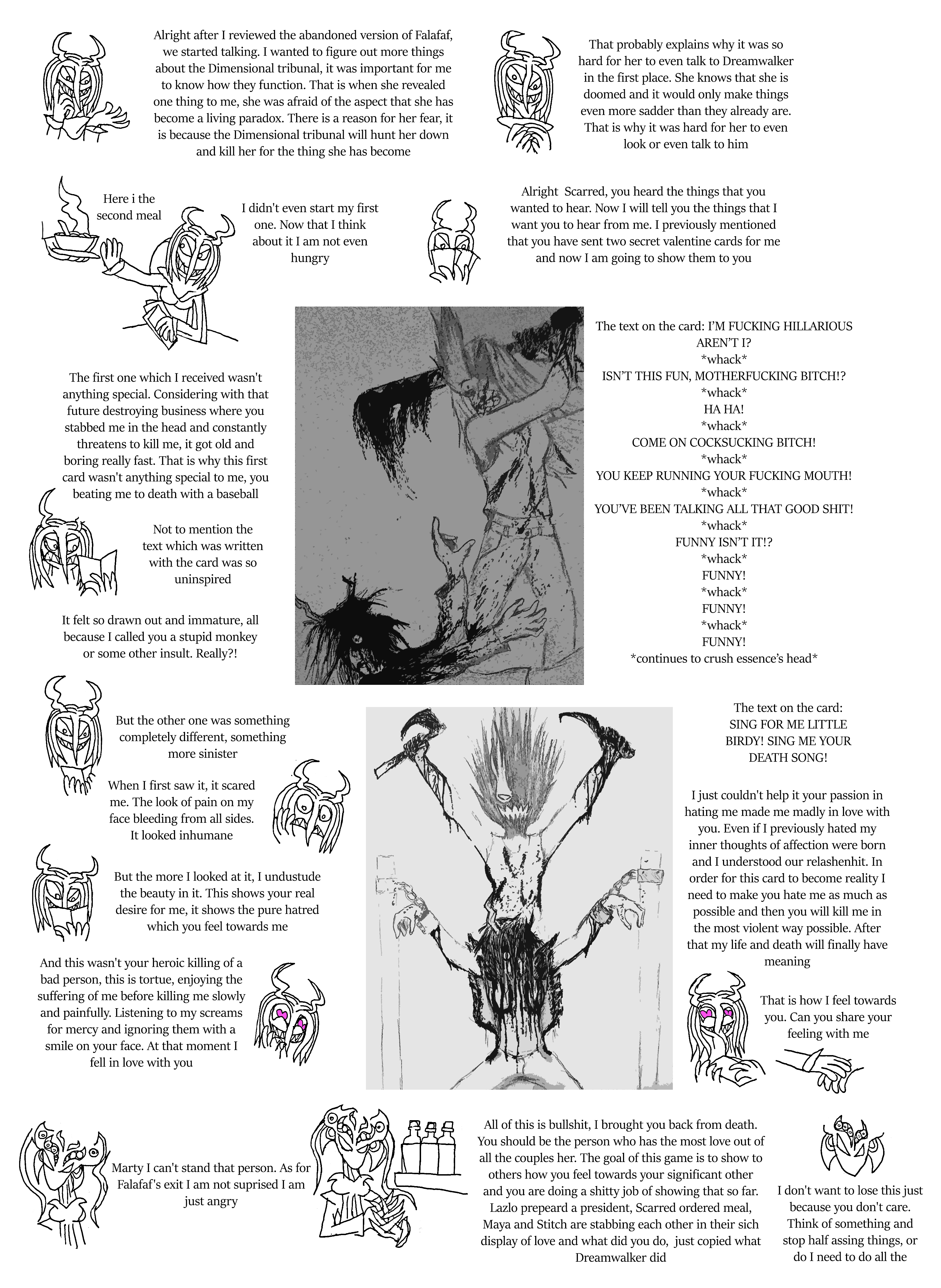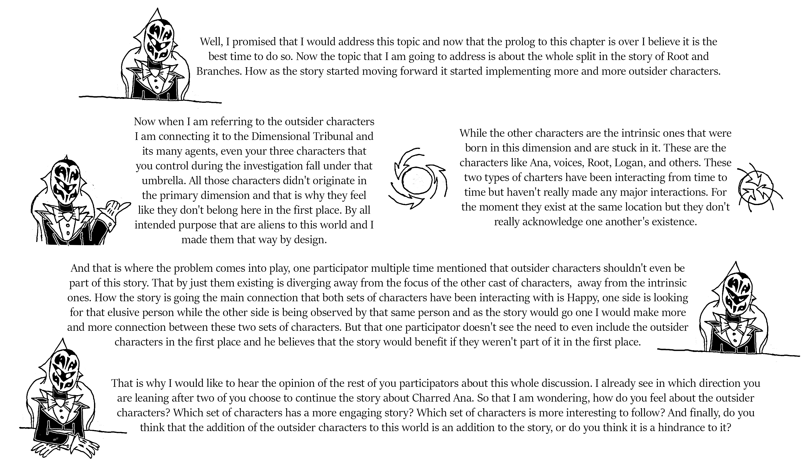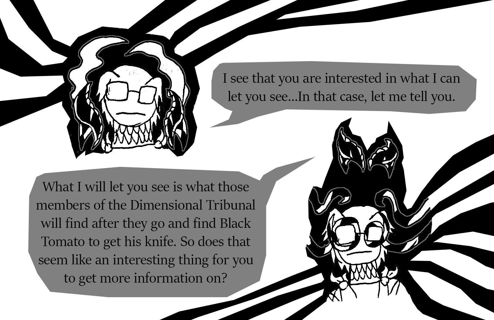 Continuing with the recap, we start with Ana's story. Something, or someone has hijacked her exit from the Astral plane and she see a dream of someone who has a dream of chopping down a tree, but then the tree retaliates and makes the lumberjack a part of itself. The lumberjack awakens and knows "they must protect her at any cost." Remember this "lumberjack" because they will be important later and cause a shit load of trouble for Scarred and Fortune. Speaking of our intrepid duo, the two of them after seeing the events of the side quests have a meeting with the real master of the black fog and the true leader of the Acolytes of the Ash Tree, the demon known as Andrew Goodwill. He makes it clear that the Ash Tree demon is basically his bitch and he uses him like a weapon to fuel his own dark designs, he also reveals that he wanted to punish Root for going against certain order as killing Absolution was not his wish, and that he was the one who granted Scarred and Fortune bodies to beat the shit out of Clara. Andrew then offers Scarred and Fortune a choice of who they would like to see die, for no other reason than his own amusement. However in defiance of him they chose none of them and instead pick someone entirely random (intending for Andrew to pick himself) as they don't want to hurt anyone. However the joke is on them because instead he picks Wildcat, the Curator attached to Ana. They quickly make a bargain for his life, but Andrew proposes a new idea, he takes over Ana's body to further punish Root. Both them promptly refuse, so in order to defuse the situation and save Wild Cat (who I will refer to as WC from here on) they all start to tell some really dirty jokes in order to save him, only highlighting how capricious Andrew Goodwill really is. Scarred comes in handy here as she tells one about a guy fucking a cow to death as well as "The Aristocrats Joke," often considered the dirtiest joke in existence (see here for what she said: https://www.youtube.com/watch?v=aGA0dIz9-Wk) The joke is so filthy that Andrew lets WC live. They all swap some jokes, and Andrew leaves in good humor and WC promises to do his best to help Ana. Andrew returns to Root and warns him to not get so high and mighty again.