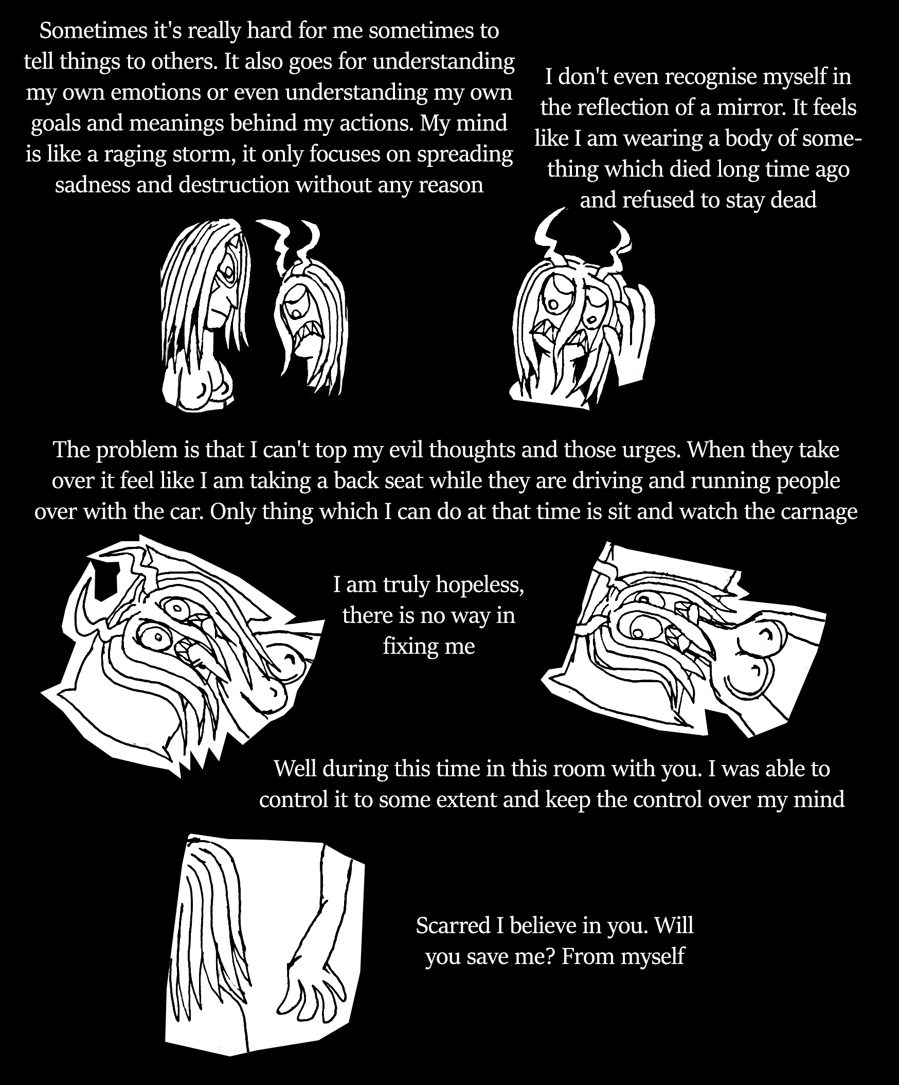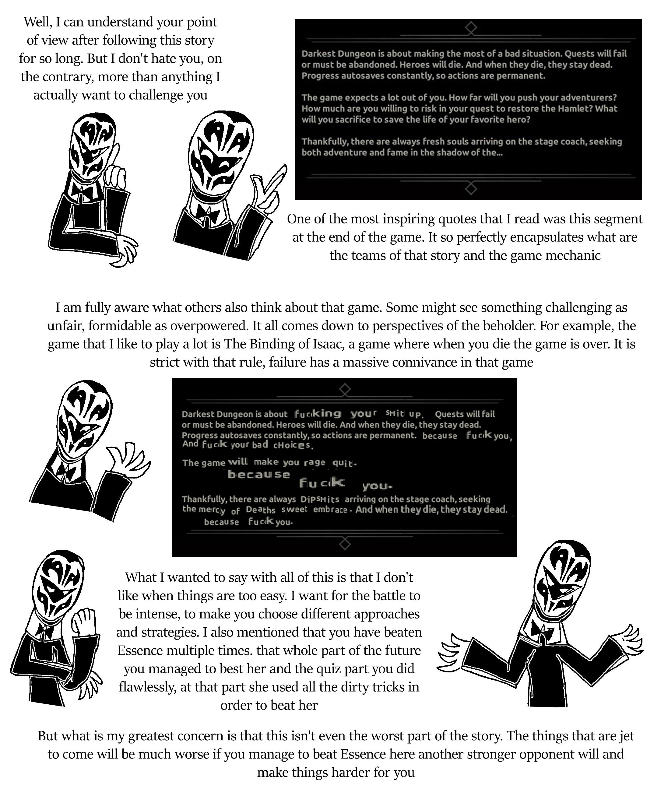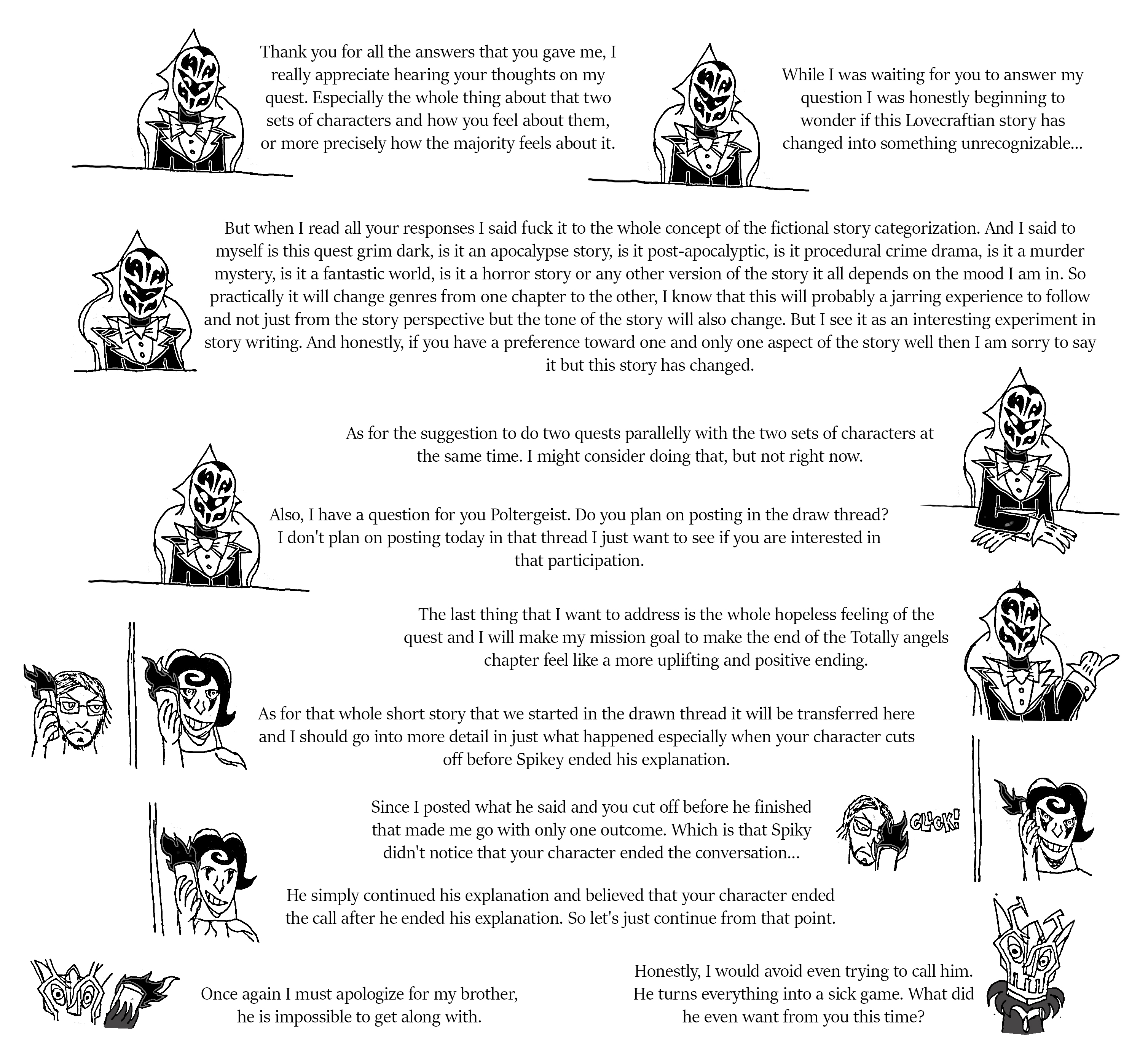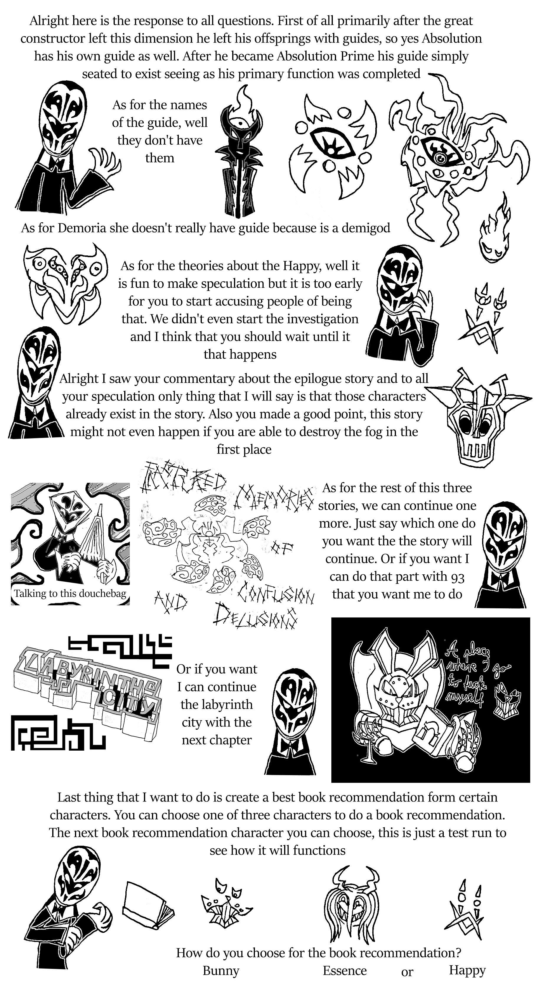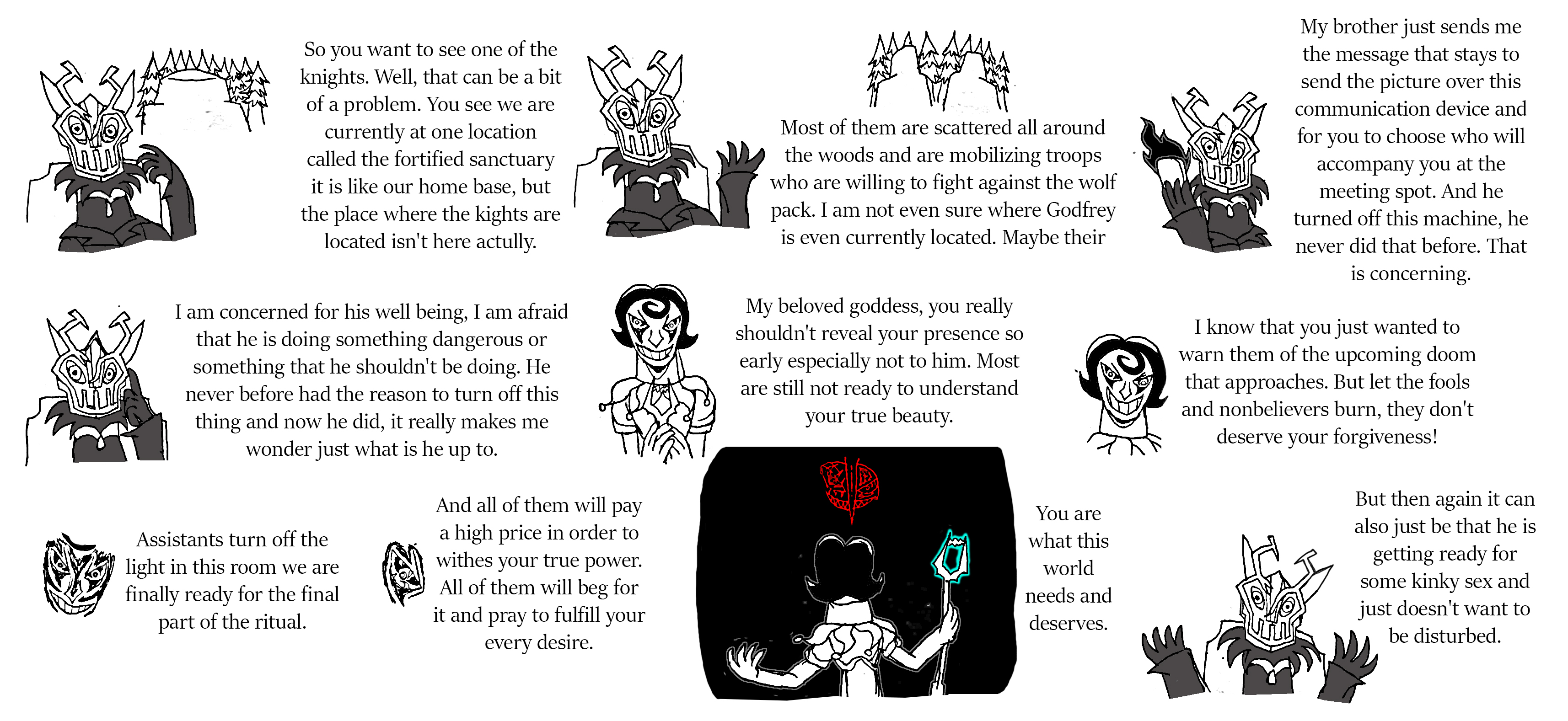 Continuing with the recap, we start with Ana's story. Something, or someone has hijacked her exit from the Astral plane and she see a dream of someone who has a dream of chopping down a tree, but then the tree retaliates and makes the lumberjack a part of itself. The lumberjack awakens and knows "they must protect her at any cost." Remember this "lumberjack" because they will be important later and cause a shit load of trouble for Scarred and Fortune. Speaking of our intrepid duo, the two of them after seeing the events of the side quests have a meeting with the real master of the black fog and the true leader of the Acolytes of the Ash Tree, the demon known as Andrew Goodwill. He makes it clear that the Ash Tree demon is basically his bitch and he uses him like a weapon to fuel his own dark designs, he also reveals that he wanted to punish Root for going against certain order as killing Absolution was not his wish, and that he was the one who granted Scarred and Fortune bodies to beat the shit out of Clara. Andrew then offers Scarred and Fortune a choice of who they would like to see die, for no other reason than his own amusement. However in defiance of him they chose none of them and instead pick someone entirely random (intending for Andrew to pick himself) as they don't want to hurt anyone. However the joke is on them because instead he picks Wildcat, the Curator attached to Ana. They quickly make a bargain for his life, but Andrew proposes a new idea, he takes over Ana's body to further punish Root. Both them promptly refuse, so in order to defuse the situation and save Wild Cat (who I will refer to as WC from here on) they all start to tell some really dirty jokes in order to save him, only highlighting how capricious Andrew Goodwill really is. Scarred comes in handy here as she tells one about a guy fucking a cow to death as well as "The Aristocrats Joke," often considered the dirtiest joke in existence (see here for what she said: https://www.youtube.com/watch?v=aGA0dIz9-Wk) The joke is so filthy that Andrew lets WC live. They all swap some jokes, and Andrew leaves in good humor and WC promises to do his best to help Ana. Andrew returns to Root and warns him to not get so high and mighty again.