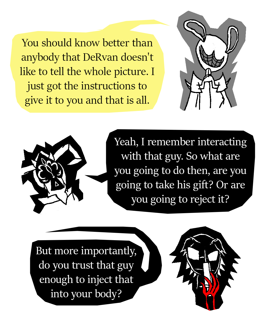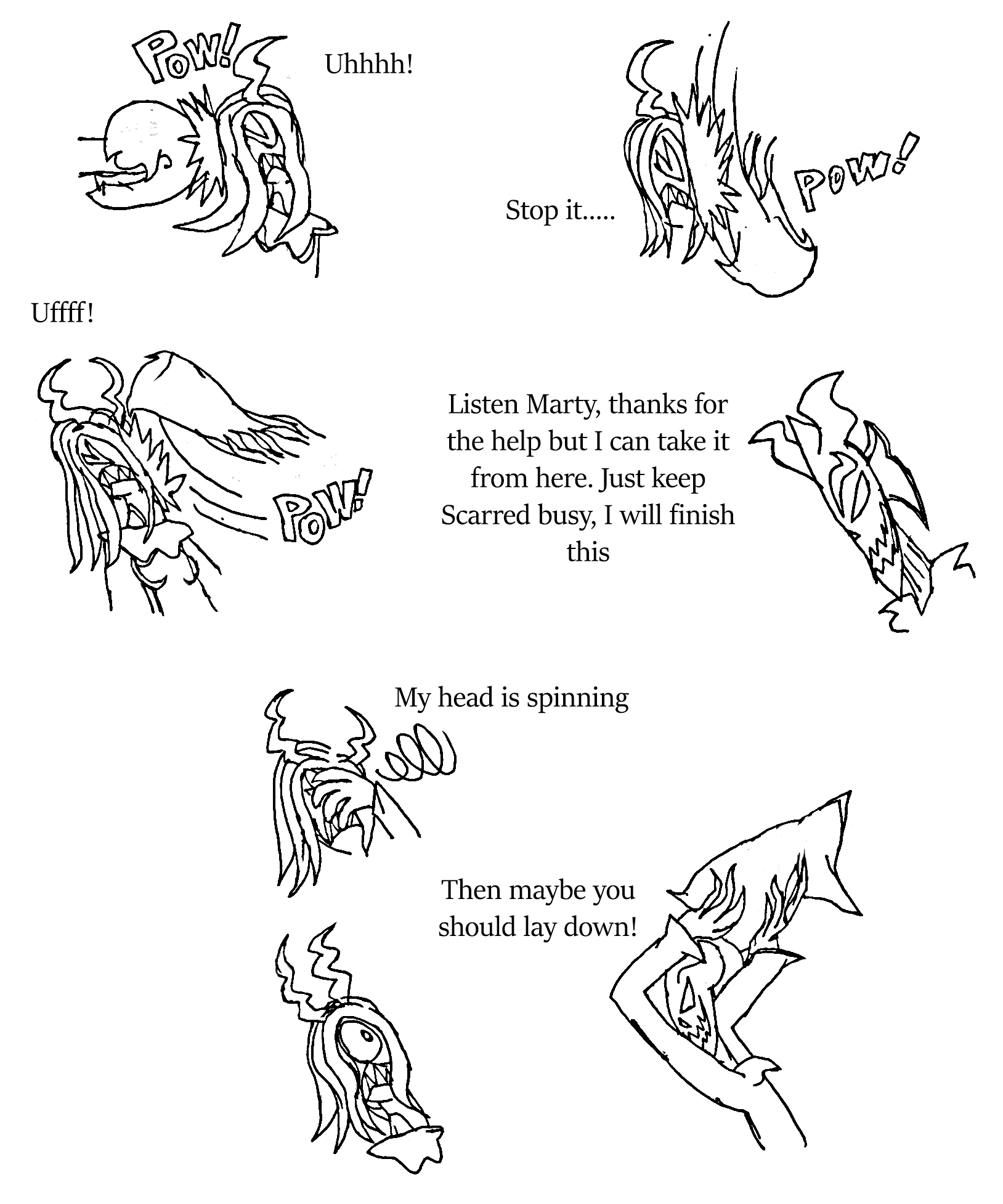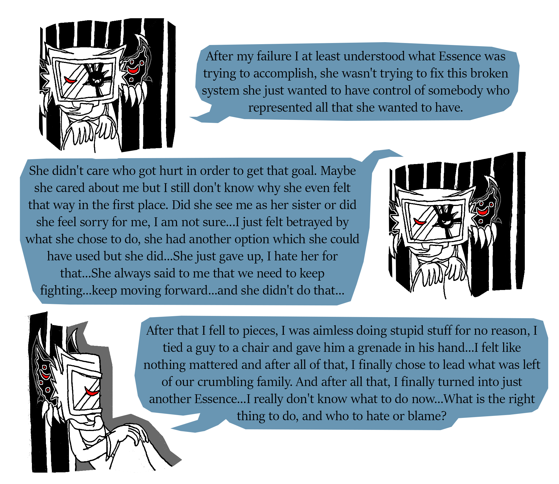 Scarred and Fortune ask for a damage report when suddenly a strange and very angry voice appears and tells Ana to get up and tells her to use it's magic to transform herself. Scarred and Fortune are horrified and see what it is doing this. It's the being known as "The Rage Within" which is later revealed to be a different side Absolution. If Absolution was law and justice and magic this thing is Anarchy and survival of the fittest, and pure primal rage. It is a being of pure rage and malice seeking blood. In the old days it was worshipped by berserkers who called it "The Blood God." Even Dreamwalker can't look at it and is horrified by it's presence. It was reborn with AJ and it's here it also escapes as Ana refuses to listen to it or either doesn't hear it. She pulls the needles out of her back which as it turns out healed as soon as she did it and healed up her wounds too. Amazingly they are needles of life. Jimmy has attached a note thanks for not joining us, and that while she's not a bad person she can't have them with them anyway as Jimmy wants to protect Gretel. We later find out in a separate sequence that Jimmy isn't really a man at all but in fact a young woman and Gretel's younger sister. The whole "Bleeding Jimmy" thing was all an act and she is actually very afraid for both her sister and Blacky. Funny enough in Scarred Ana's timeline Jimmy went by a different name, Alora "Jackie" Miller and both her and Gretel as well as Blacky who later gets new metal arms and calls himself "Weyland" become generals and part of her inner circle.