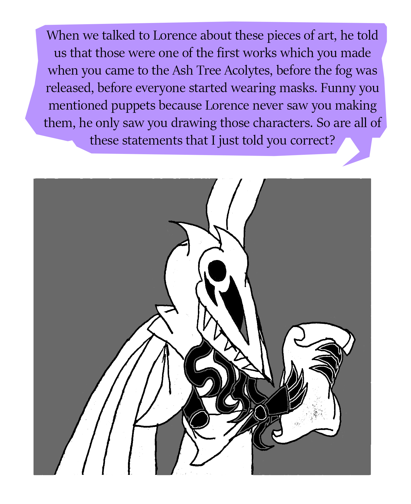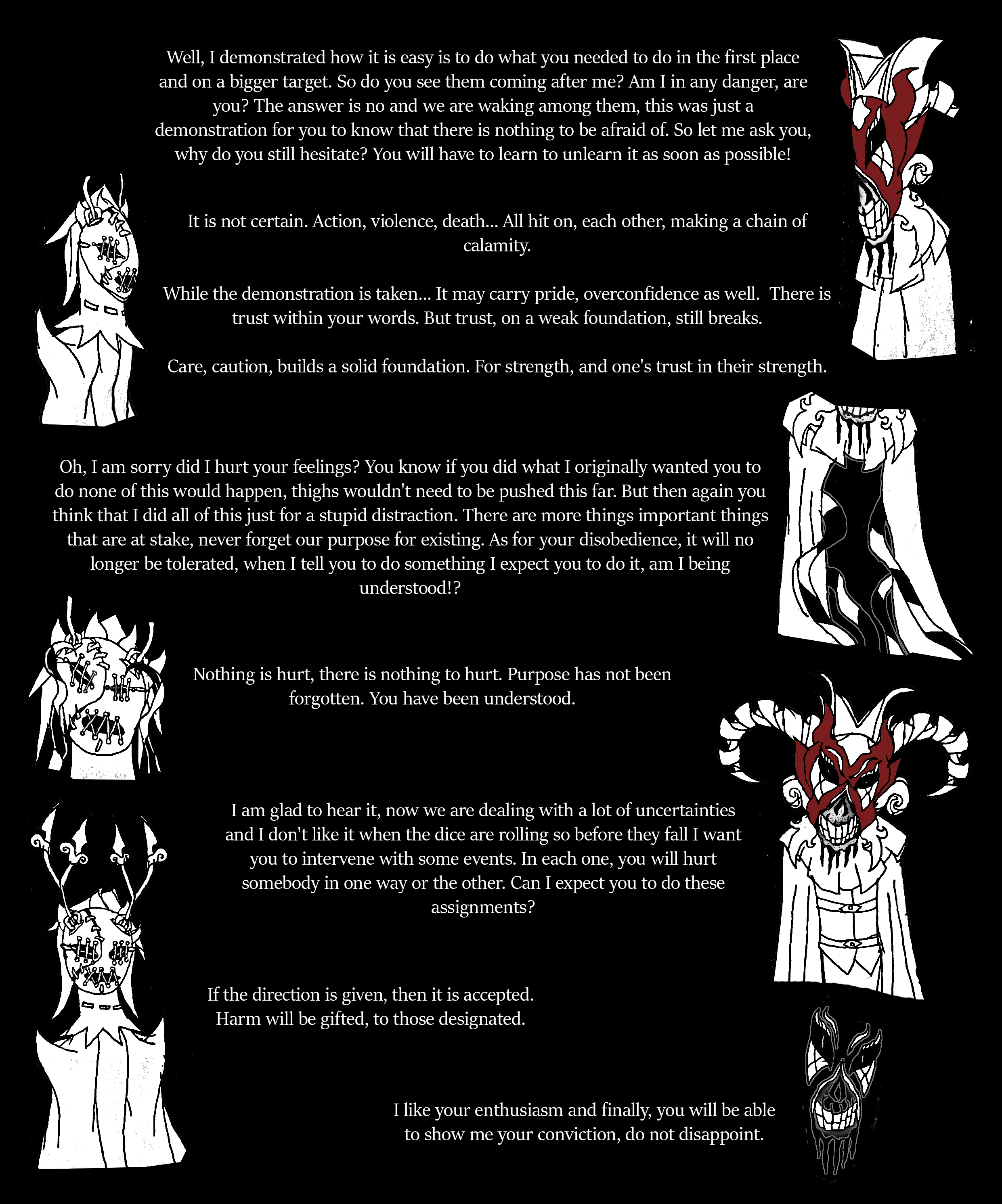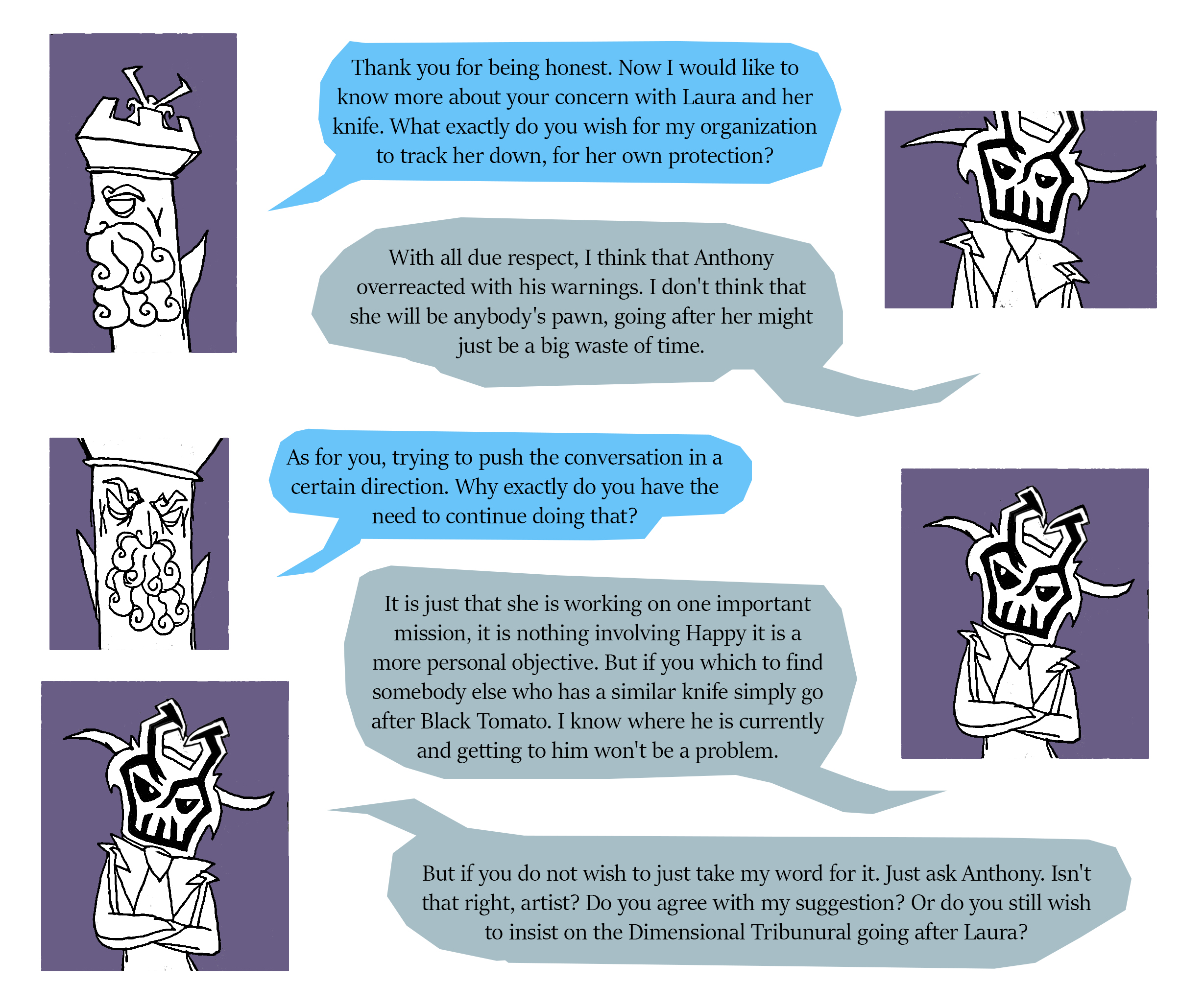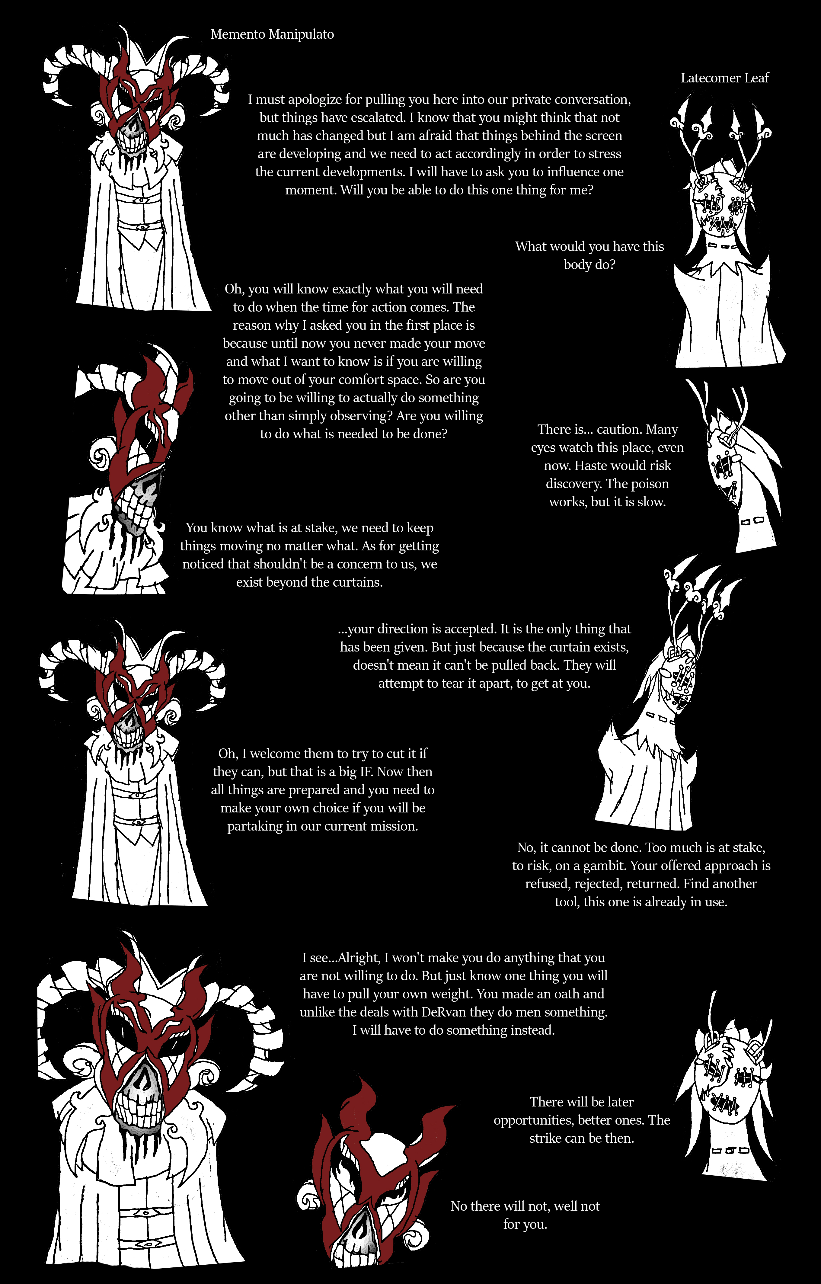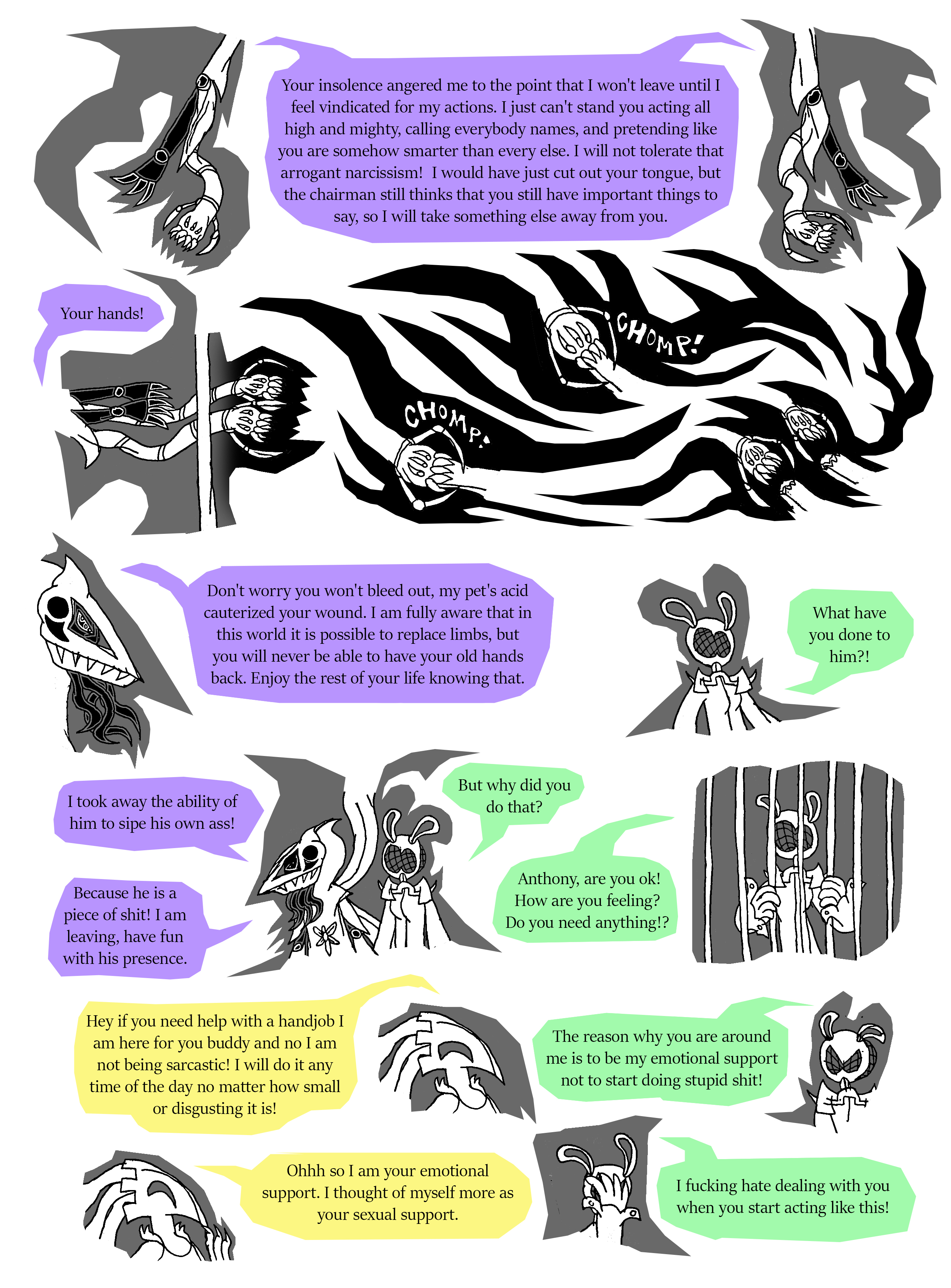 They place the call to the Ambassador who agrees to be her bodyguard after some very odd words and questions. He agrees to be her bodyguard as he was once a mortal and wants to gain more power, and even take over the Acolytes of Ash. It's made clear he sees her as something of a means to an end but at the same time she also agrees and the two form a rather tense alliance. After some very choice words the two end the call only for it to be revealed that Root's bodyguard, a silent monster named Stitch, is standing behind Ana, still acting on his previous order to find her and kill her. Stitch is a silent killer and a frankenstein's monster of an abomination. Ana freaks out but Blacky, gods bless his heart tells her to ring the bell again which will send her out of the pocket dimension. She does so just in time before Stitch has a chance to put his knife (which he keeps lodged in his neck) through her heart. However, Stitch is furious at Black for telling them how to escape. Stitch begins to break all of the bones in Blacky's hand except for Dreamwalker who is able to disguise himself uses his power to turn into Root, and he gives the order to not kill him. Stitch obeys but it doesn't mean "don't hurt him," and he breaks both the arms of Blacky and rips one of them off before putting a smile on his mask for Ana as she leaves watching all of this in horror.