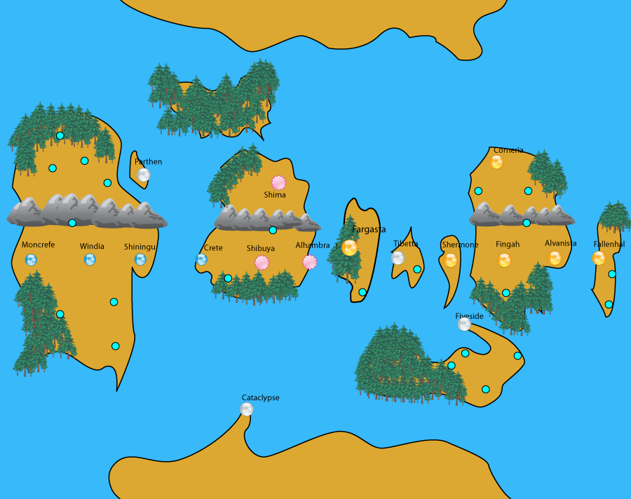 I've attached a map of the major city states of the world. Generally speaking, if states are the same color they're allied, except for the gray ones which unaffiliated and weird. I say "generally speaking" because sometimes these alliances are a little tense, like Corneria and Fallenhal, or Fargasta and everyone. Blue states are pretty nice places to live if you're poor and fucking shitty places to live if you're rich. Pink states are the opposite. Orange states are more diverse and have less in common with each other and are mostly allied because Fallenhal is like old timey british colonialist.