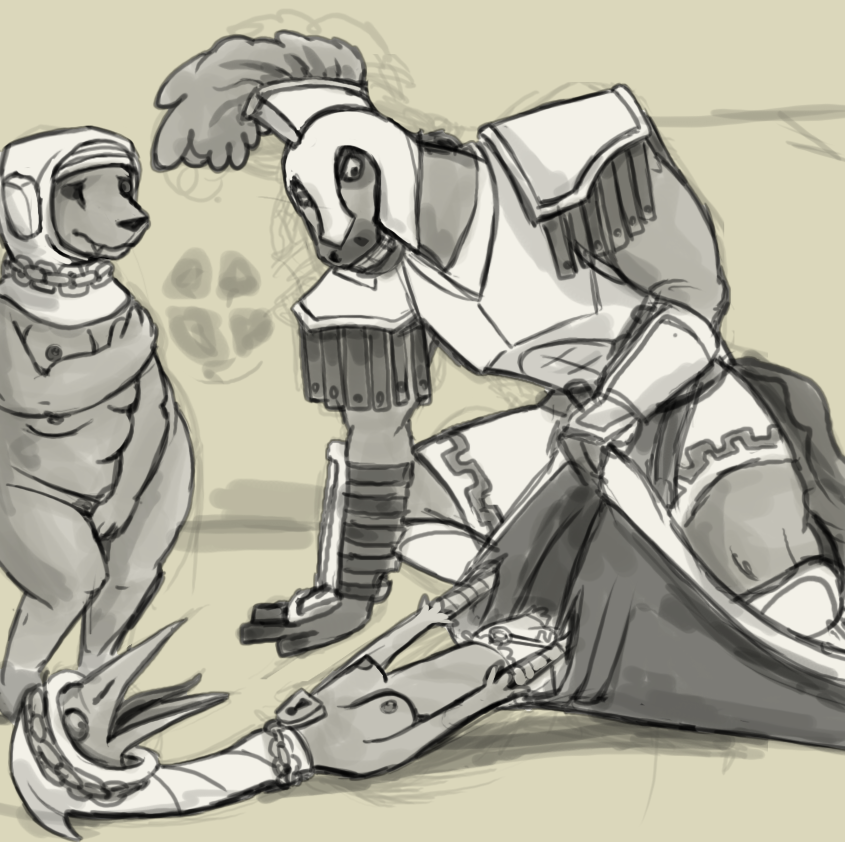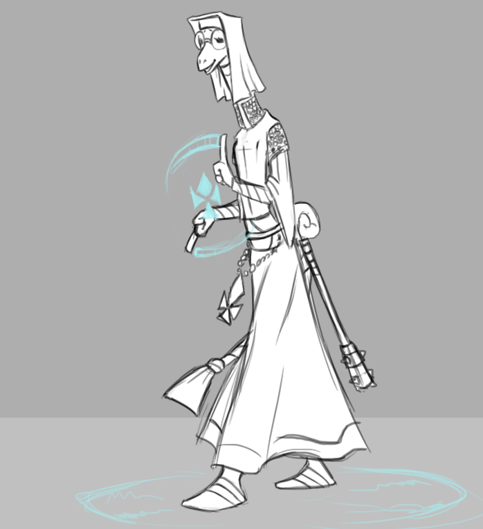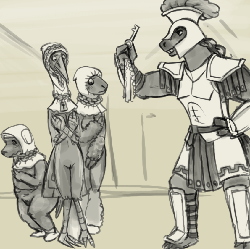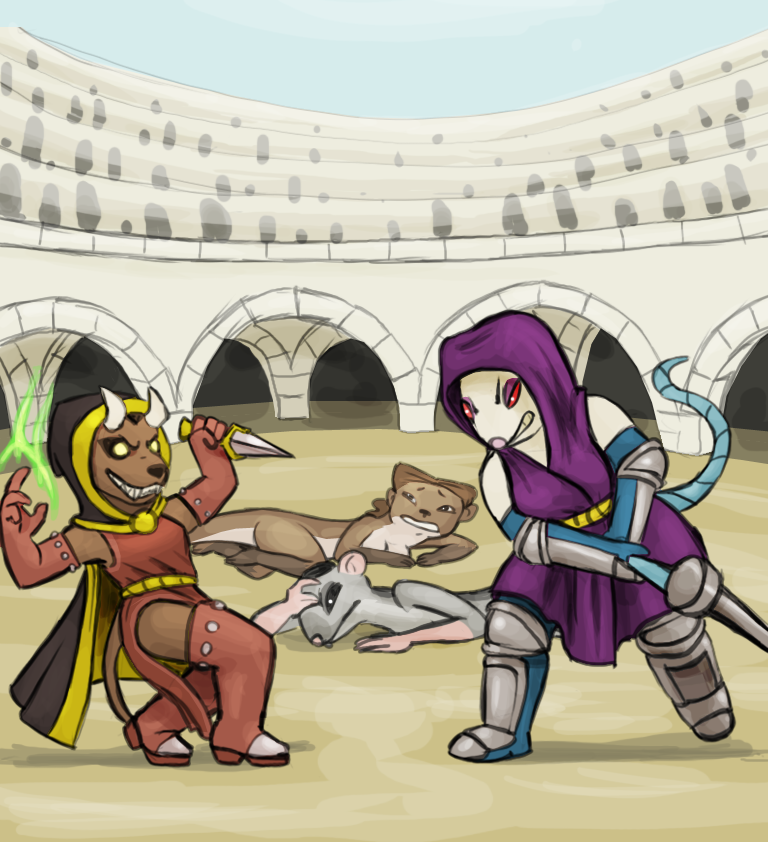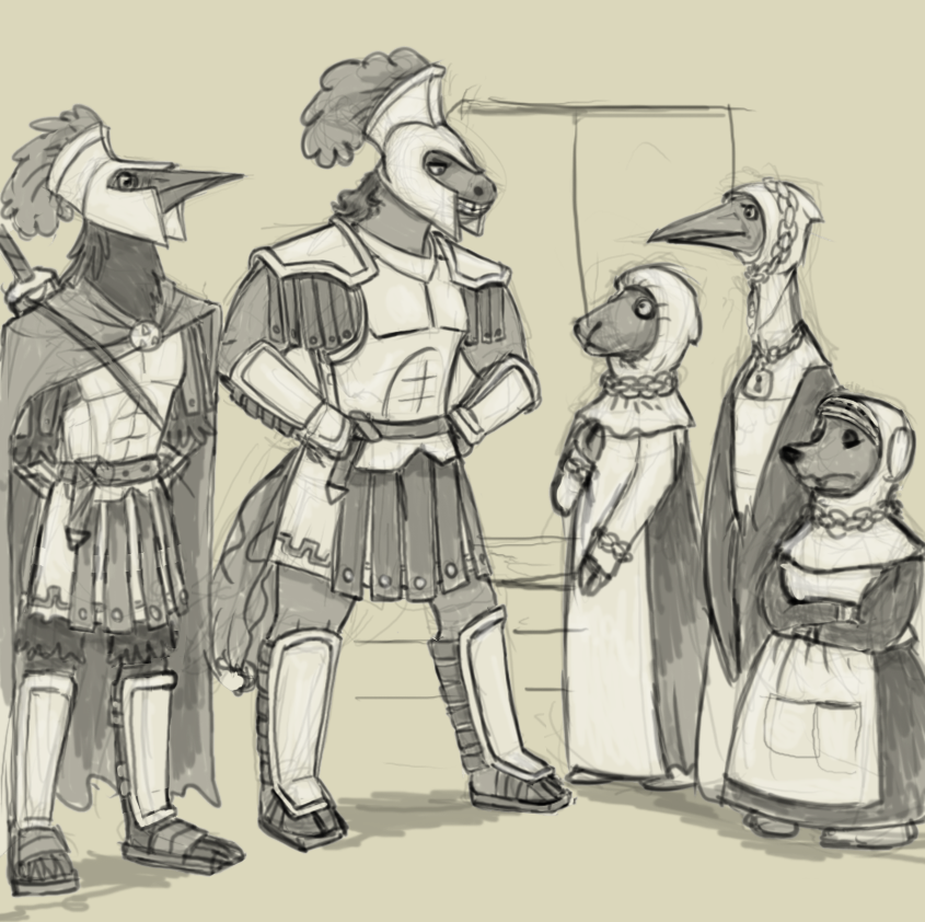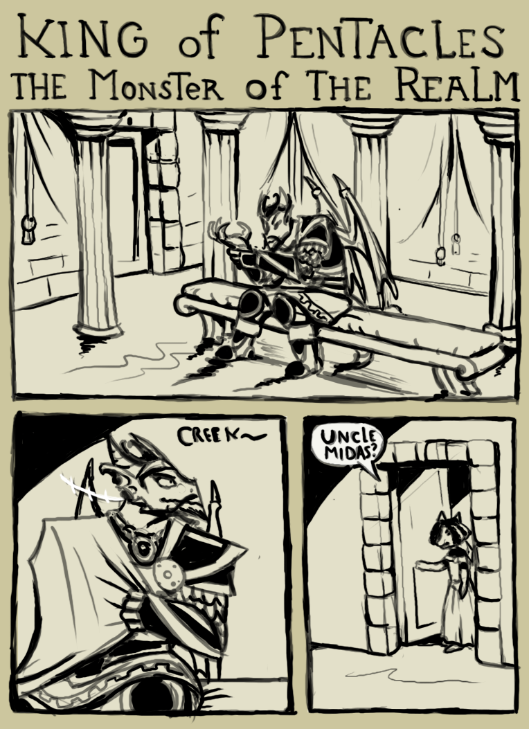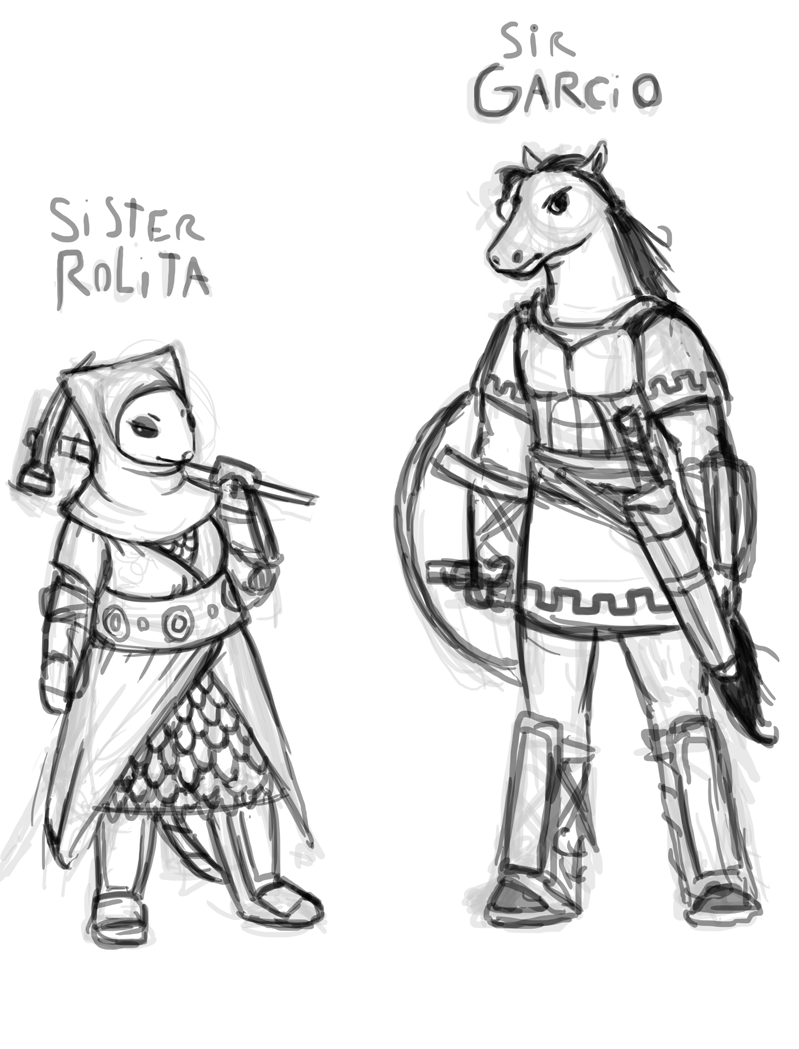 King of Pentacles I think has a better chance. It leans closest to being a simple quest by the above categories but pushes a bit beyond that by the quantity of the characters to control and the "stats" and abilities being hidden. If it were to be theoretically redone I would start with a simpler and faster intro encounter to give a chance for the mechanics to be explored/explained more quickly (for example, instead of facing the heroes right away maybe we start with a scene of only one or two of the tax collectors guarding their stuff in a town at night while the others are sleeping, and facing off against one or two bandits; or perhaps one or two tax collectors scouting ahead of the group along the road and fighting just one of the heroes). You could also have put in some sort of "tutorial narrator" who could comment on the fight while it was happening, like maybe the queen herself watching by magic, or some nearby wanderer, or perhaps a veteran but invalid tax collector character who can only sit and shout orders at the others, or something like that. I would also (and this could still be done) just put up a straight gamey "UI" or a stat screen shown at the start of each round, where we can see the characters' health and morale as bars as well as their condition and maybe a little list of their special qualities and their "level" to show how powerful they are.