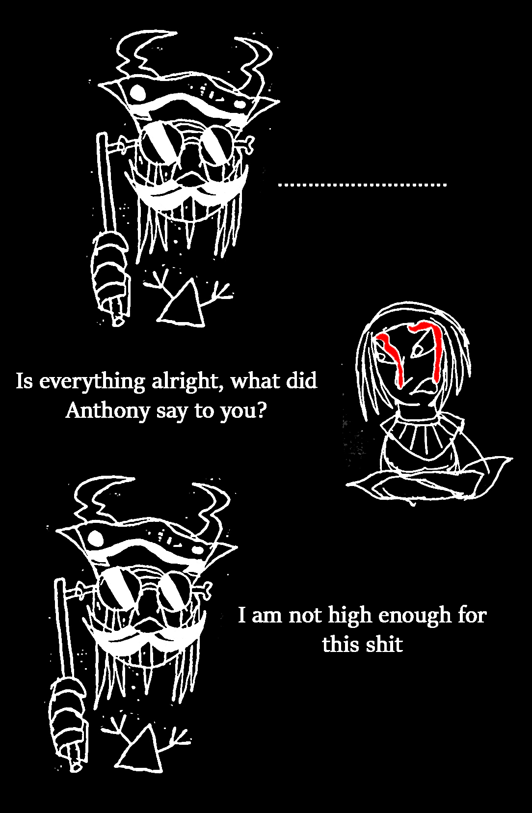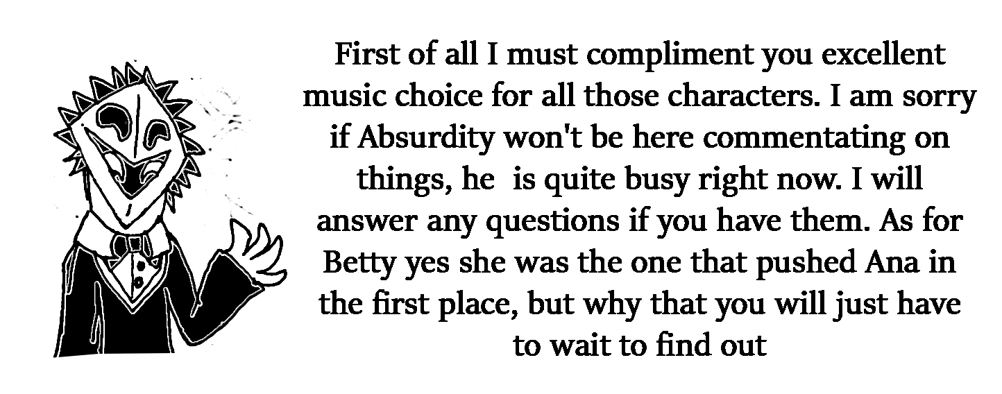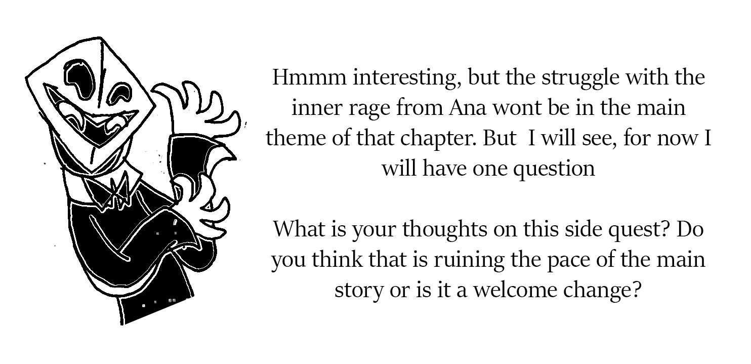 Fourth: I want to know if Ana truly wants me to still help her guide her. During the time we were sent to the future, I noticed that Ana did everything she could to find Scarred Ana's totem and even try to repair it to have Scarred talk to her again, but... I don't know if she even bothered to look for mine. Also, I noticed that when Future Ana tripped and fell, her left eye popped out... I use my left eye when I use my fortune telling ability. She may have at one point removed it herself because it reminded her too much of me. After we returned to the present, she refused to hear my story I was about to tell, she ignored my request to read Robbit's note, and she took Scarred Ana's path of threatening Cera instead of trying to leave things peacefully. I'm wondering if she truly wants my help, and if not, if I have wronged her in some way. I wouldn't blame her, I've made too many choices that harmed her, and I even abandoned her at one point.