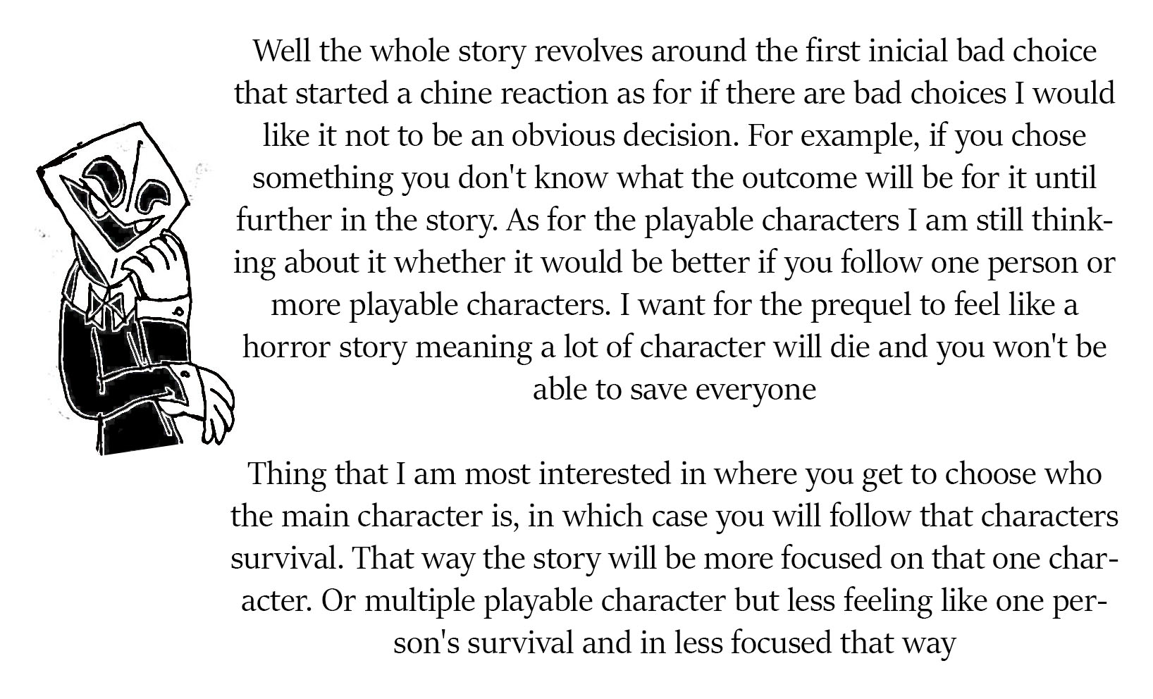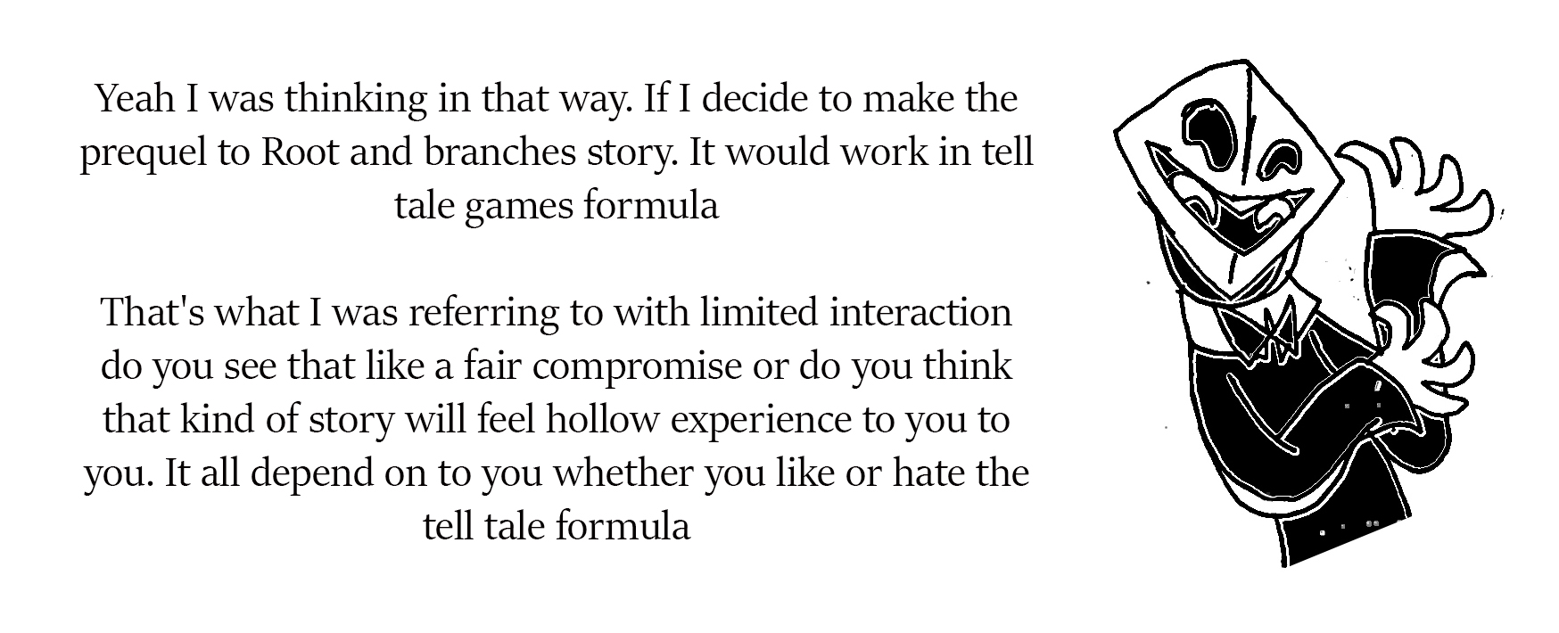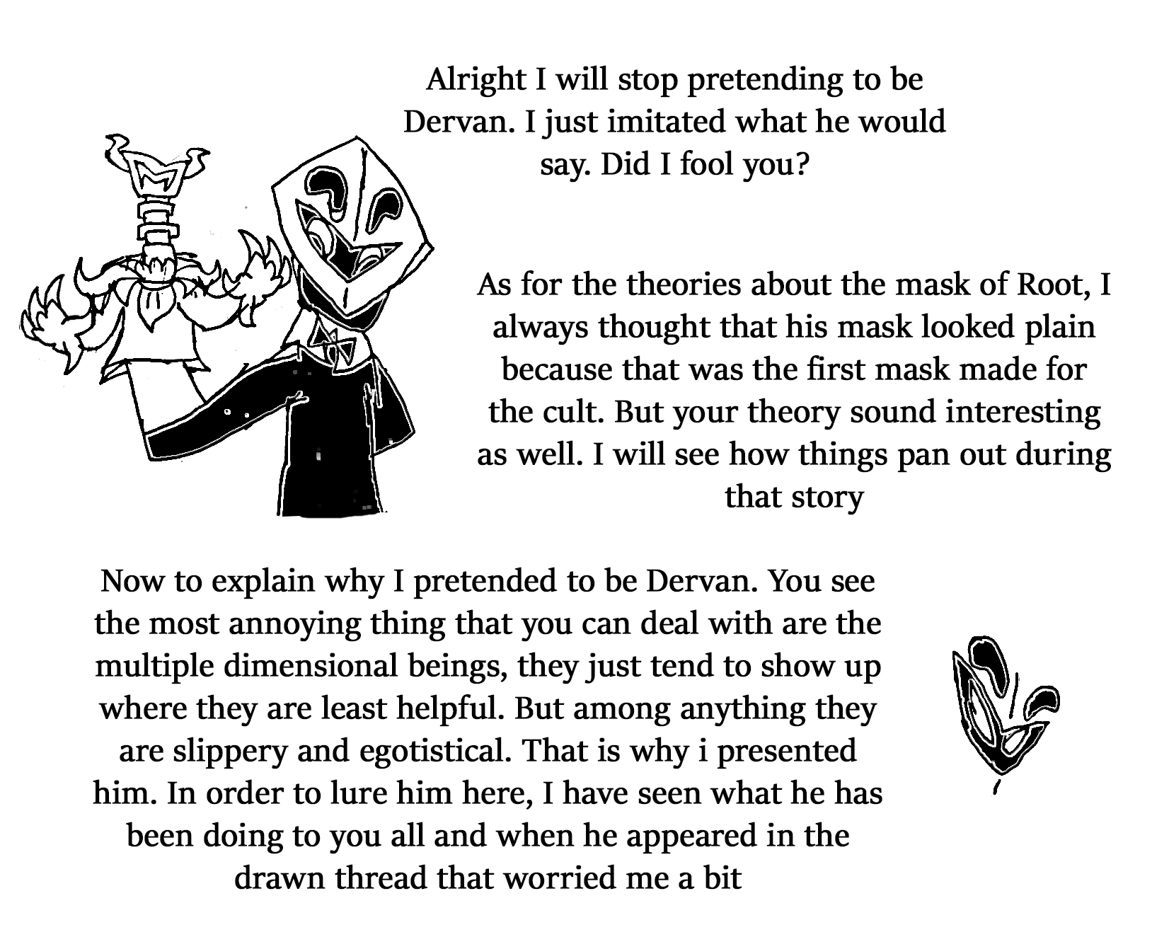 Fourth: I want to know if Ana truly wants me to still help her guide her. During the time we were sent to the future, I noticed that Ana did everything she could to find Scarred Ana's totem and even try to repair it to have Scarred talk to her again, but... I don't know if she even bothered to look for mine. Also, I noticed that when Future Ana tripped and fell, her left eye popped out... I use my left eye when I use my fortune telling ability. She may have at one point removed it herself because it reminded her too much of me. After we returned to the present, she refused to hear my story I was about to tell, she ignored my request to read Robbit's note, and she took Scarred Ana's path of threatening Cera instead of trying to leave things peacefully. I'm wondering if she truly wants my help, and if not, if I have wronged her in some way. I wouldn't blame her, I've made too many choices that harmed her, and I even abandoned her at one point.