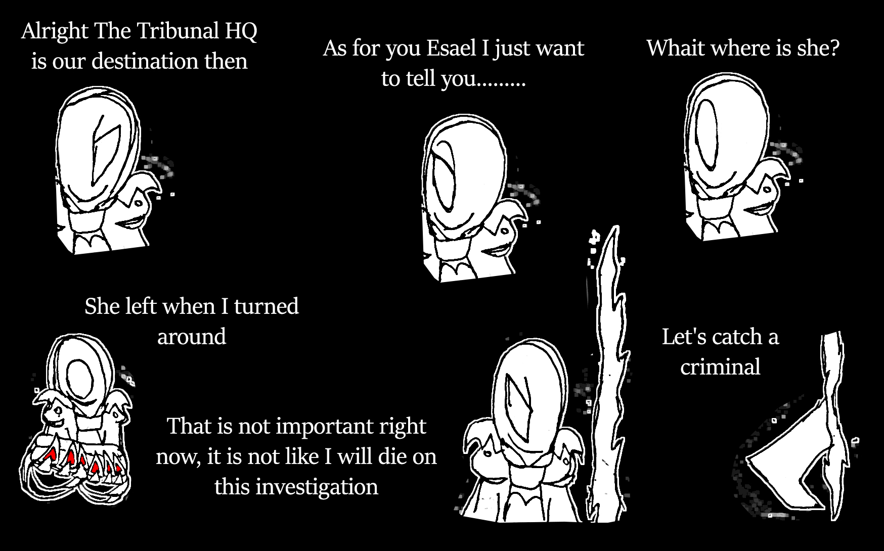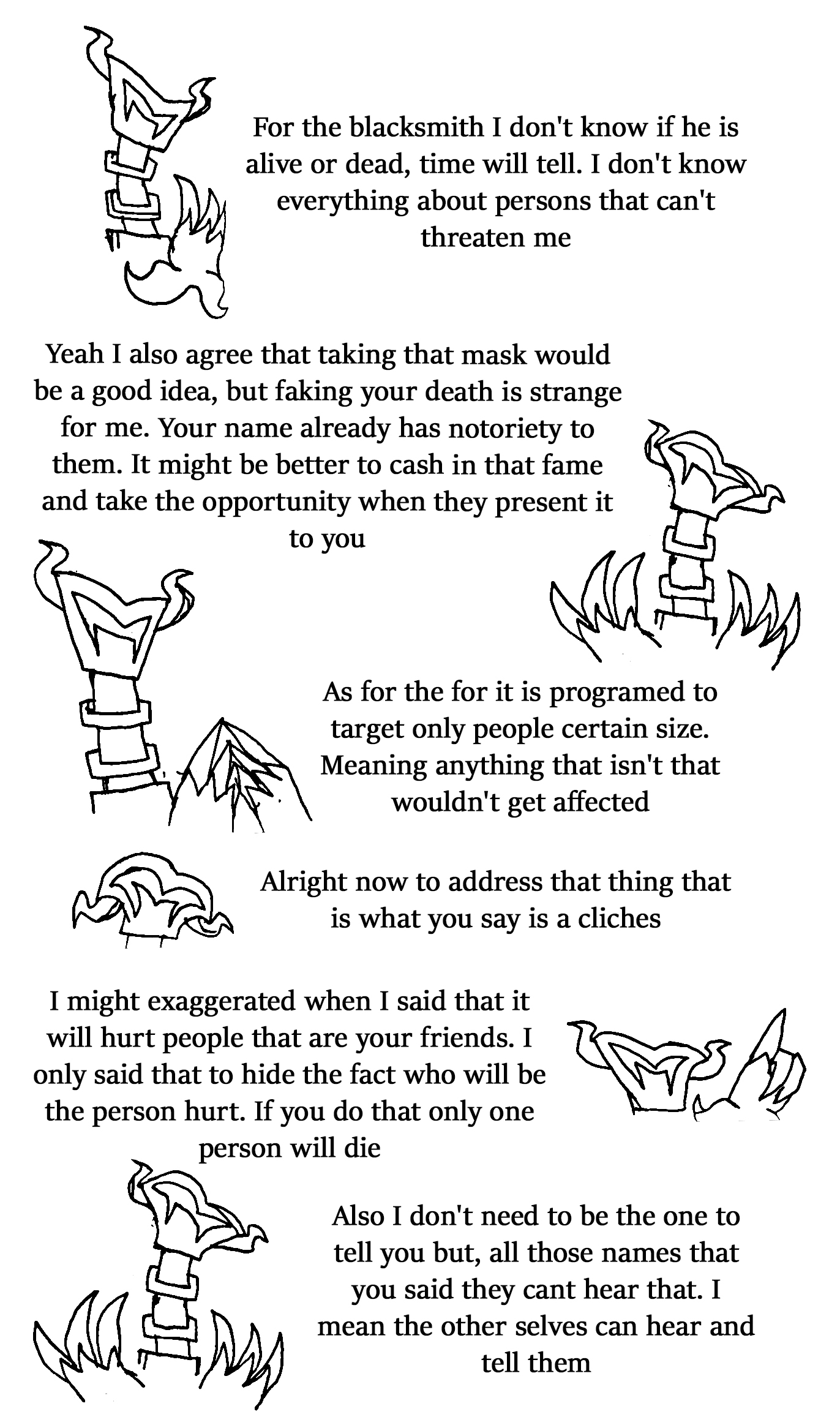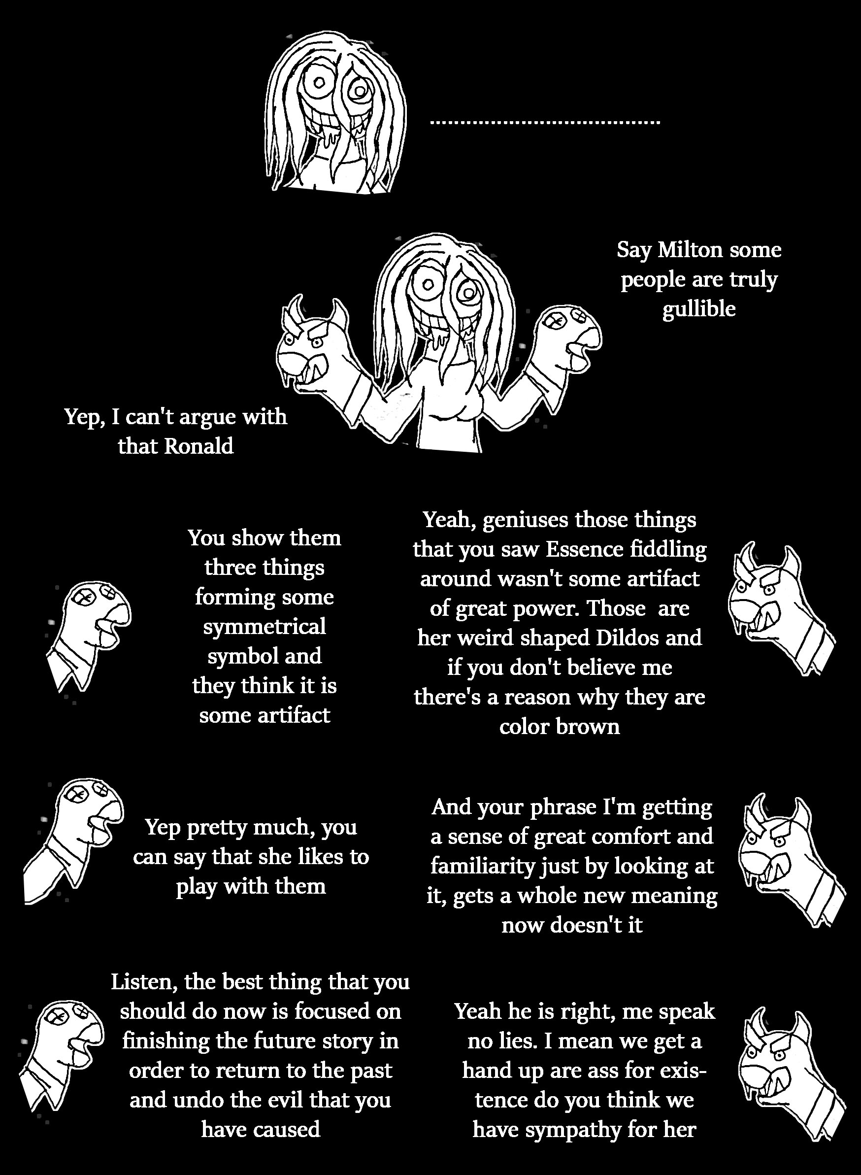 Sixth: you might not like what I might say, but I think Falafaf is on her way to death soon. remember the paper with the horns and Essence crossed off one of them after future Falafaf died? I do not think that means only future Falafaf is dead, I think that applies to present Falafaf as well, and she is marked for death. That said, to keep yourself from getting clouded by deep emotions, I don't want you to get too attached to her anymore. I'm not saying don't talk to her, just be prepared for that outcome.