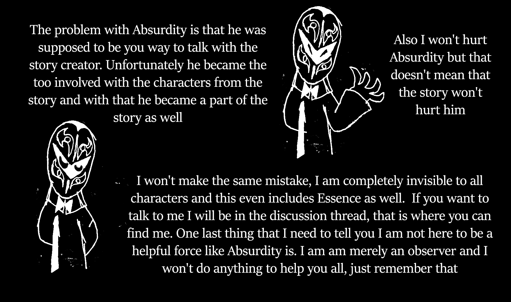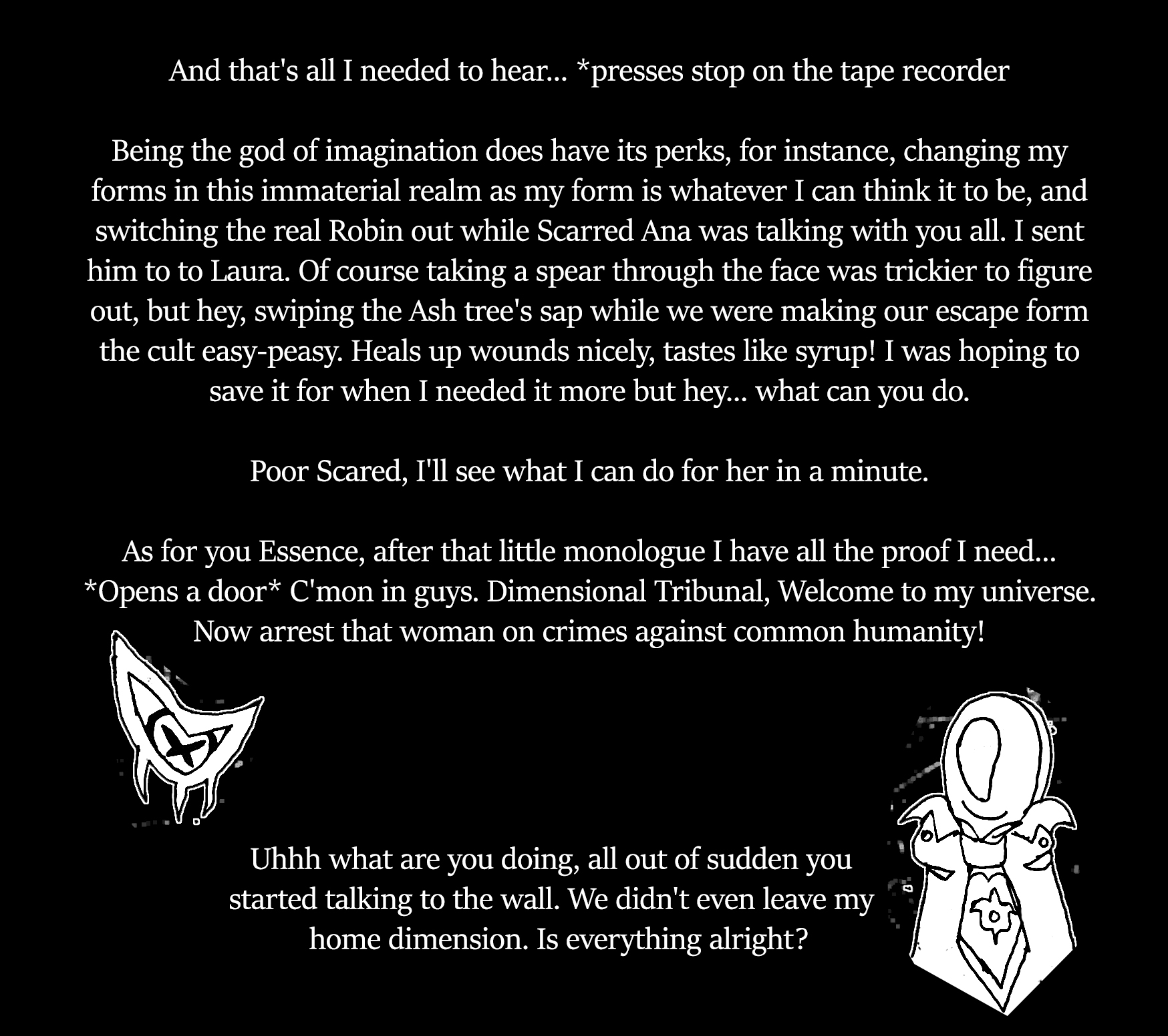 First things first: I think my voice may have been compromised. Before we spoke with Cera, Absurdity gave Ana two white totems that acted like radios for our voices to the physical world. After we went through that fiasco in the future, your friend, The Incubus Melkior, was given Scarred's white totem and her black totem, and my black Totem. However, my white totem was nowhere to be found. I do not know who has it right now, or if it has been destroyed by the future, but just in case someone who wants nothing more than to hurt us has it, I have to stay silent like this and can only communicate with my thoughts. That said, I don't know how communicating like this will effect Ana or the person you have formed a bond with, or if they will be able to hear me. That said, I may have to act not as their guides, but probably as your guide, Dreamwalker.