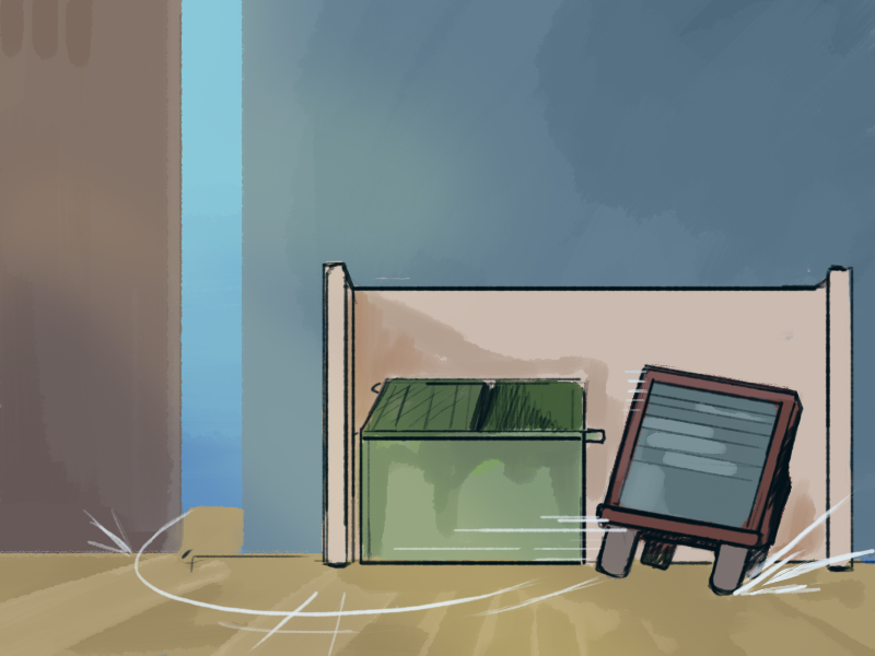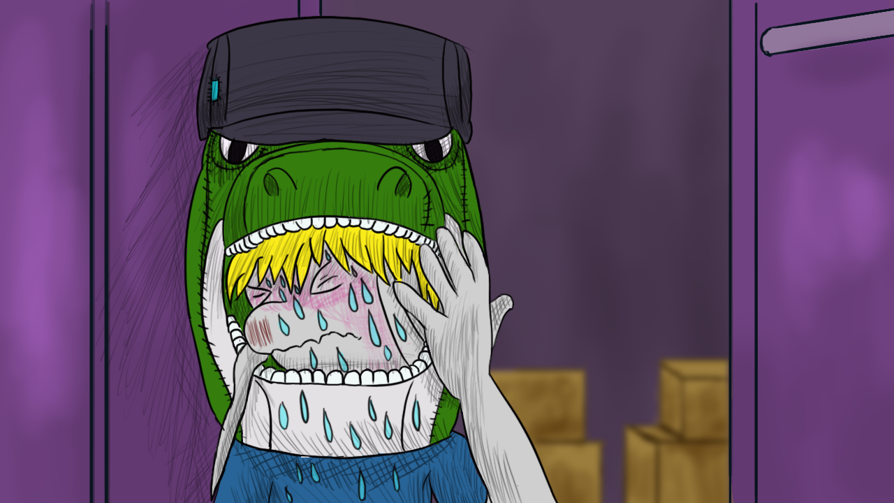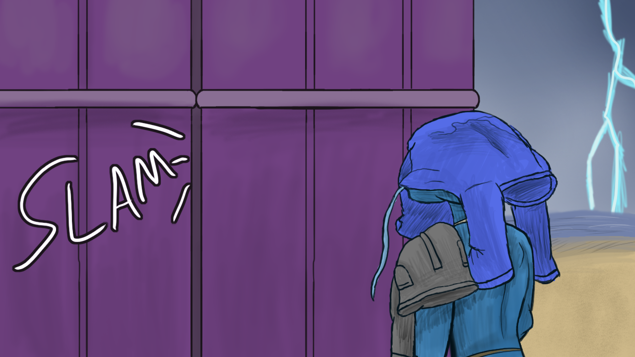 Before the blue girl can say anything, her sales partner disappears out the back, the door slamming behind her.