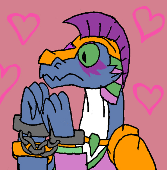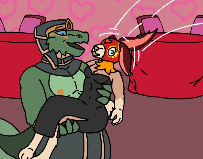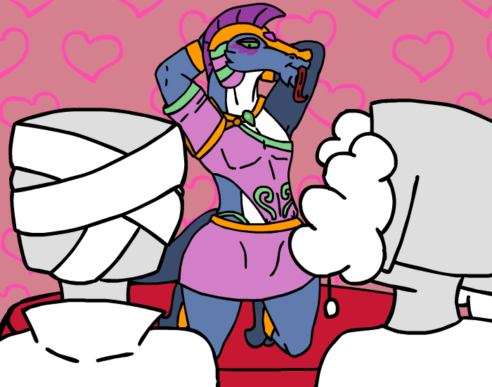 The two completely normal guys turn away and hold counsel, whispering between themselves while the Volin lays down in front of them in what he assumes is a sexy pose, only breaking it to clean his nails a bit. It only takes a few moments before one of the guys stammers out,