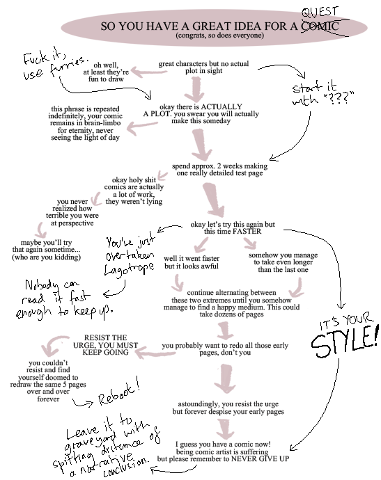 I have told a handful of people the basic strategy I use when putting a quest 'together'. I know that other people just 'fly by the seat of their pants,' and that works for them but I don't recommend doing that. I think a massive part of the graveyard consists of that. An artist had a 'neat idea,' and hoped that the suggestions would take that neat idea and bring it somewhere fantastic without any planning. There might be examples where this works, but you should really reconsider starting out.