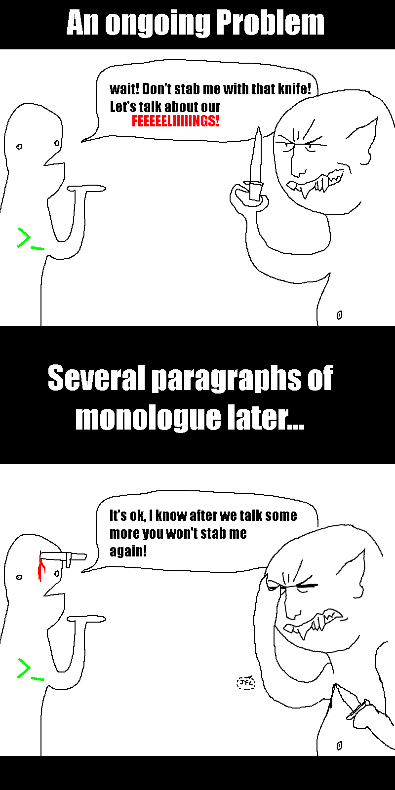People are used to informal language and being able to get instant feedback. When you say something like, “It's over there,” and someone can instantly say, “What do you mean by there?” and after a dozen exchanges you realize you should have said, “The red paddle is over on top of the blue pail.” It would have been much much easier if that sentence was said first. This happens in quests when a quest author draws an update and does not write clearly enough what is going on, what needs to happen, and why the character cannot not do what we want them to do already.