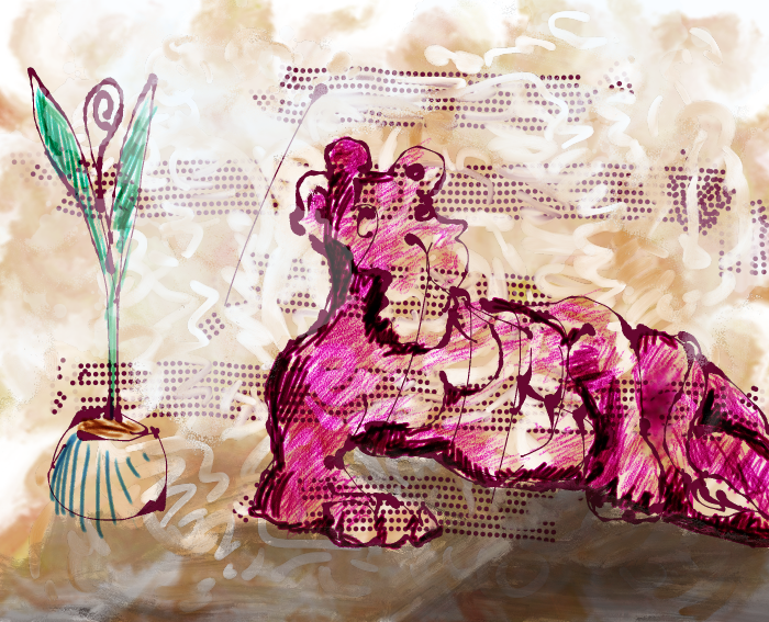 check. the dots are an exploration. What they reveal is the depictation of God. How? There's brush strokes erasing them dots. The protagonist, the pink lion, has a male lionish spirit-like fume in the background depicting God, like we would depict God as a man with a beard. But to a male lion a huge "beard" or mane is natural. I intended to draw God, but what I got, was a completely random bush as I thought my mind cannot grasp the concept of God except by accidental subconscious intervention. That bush or mane later began to resemble something like a spirit of a male lion. Aha!